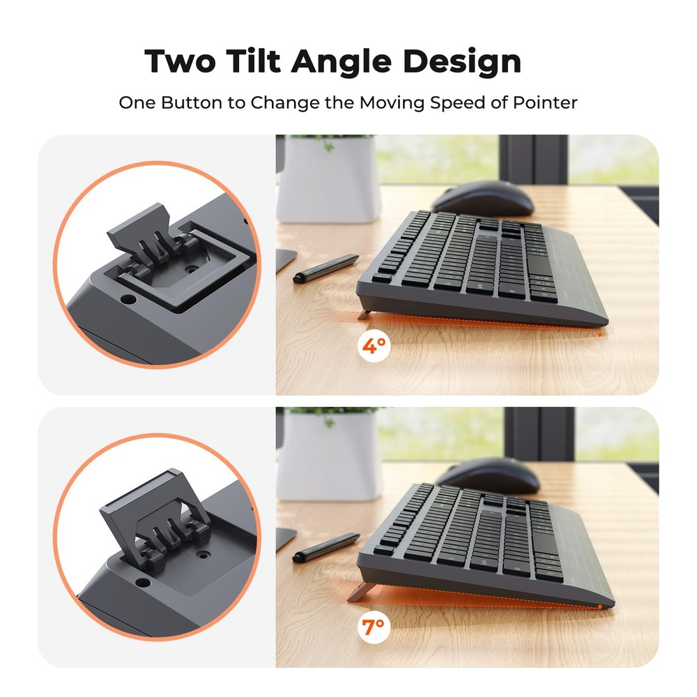 【VERSATILE USAGE】 Perfect for office work, home office setups, and various computing needs, our combo works seamlessly with computers, laptops, Macs, and more. Enjoy efficient and comfortable typing and navigation across multiple devices. 【Elegant and Practical】The C2000 keyboard features a simple three-zone layout, adding a touch of elegance to your workspace. The quick-access smiley face key lets you easily insert emojis for more fun. It works with both Windows and Mac, and the FN+Q/W switching makes it easy to move between your PC, laptop, tablet, and phone. (Please note that this keyboard is not backlit) 【Easy Connection Anytime, Anywhere】The C2000 keyboard and mouse set supports both USB wireless and Bluetooth connections. Both the keyboard and mouse have mode-switching keys, allowing you to switch between devices effortlessly. Whether your device has a USB port or not, the C2000 keeps you connected and ready to work. 【Quiet and Precise】The C2000 mouse is designed to be silent and features five DPI settings (1200/1600/2400/3200/3800) to suit different screen resolutions and environments. Whether at home, in the office, or on the go, you’ll enjoy smooth and precise cursor control for better productivity. 【Long-Lasting Power】No more frequent charging interruptions. The C2000 keyboard and mouse are USB-C rechargeable, giving you up to 300 hours of keyboard use and 150 hours of mouse use with just a 2-hour charge, so you can stay powered up throughout the day. 【Comfortable Design】The C2000 keyboard is built with comfort in mind. Dual kickstands offer two adjustable angles (4° and 7°) so you can find the best typing position. Enjoy a more ergonomic setup that reduces strain and supports better posture during long typing sessions. 【Boost Productivity with Special Keys】Increase your efficiency with the C2000’s dedicated Copilot key for instant access to AI tools that help you work faster. The smiley face key also makes inserting emojis simple, adding a personal touch to your messages.