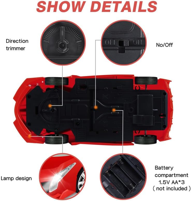 2.4 GHz High-Speed RC Car : This remote control car is high speed super drift car with Cool Led Lights. Delicate and exquisite with a powerful built-in motor,the maximum speed can reach 10KM/H, Long control distance,good anti-interference ability, high-speed and stable running performance. Super Cool Model Car Toy : 1/18 scale RC car is great size for inside use, Sufficient range between the car and the control for 27mhz. the remote control distance up to 165 ft. it need 3 AA batteries for cars (not included) and 2 AA batteries for remote controllers (not included). easily to have a great fun in anytime. 3 4 5 6 7 8 9 10 Year old boys girls gifts toys. Easy to Control : This remote control car can move steadily in any direction within a few seconds through a miniature,smooth remote control,which is suitable for children's hands.It has the functions of drifting, advancing, retreating, and turning left and right.kids can enjoy great fun with this function car. High-Quality Materials : The non-toxic ABS rugged plastic body can prevent scratches and effectively avoid damage caused by collisions.This remote control car equipped with flexible and anti-shock wheels works best on the flat surface with a perfect arc of super vehicle body and can be used indoors or outdoors.your kids have a lasting and happy entertainment. The Perfect Gift for kids : This Lamborghini car is the best choice for your child to race with friends and share happy time with family.For boys girls aged 3,4,5,6,7,8-10,also the best gifts for 3,4,5,6,7,8,9,10-12 children teens adults. Product Description PERFECT GIFT FOR YOUR KIDS! This Remote Control Car is perfectly designed for kids, which has wonderful design and cool features, suitable for Christmas, Birthday and other festival gifts. 1:18 SCALE TOY CAR POWERFUL REMOTE CONTROL,EASY TO CONTROL Full function: Forward, Reverse, Stop, Left & Right,drifting Operated by a 2.4Ghz frequency Stable and farther control distance Race multiple vehicles side by side without interference Car Battery: 3 * AA Battery (NOT included) Remote Battery: 2 * AA Battery (NOT included) SUPER COOL REMOTE CONTROL CARS TOYS 2.4G Remote Control 1:18 Scale Toy Car Fantastic Design with Cool Led Lights non-toxic ABS rugged plastic good choice as a gift for kids