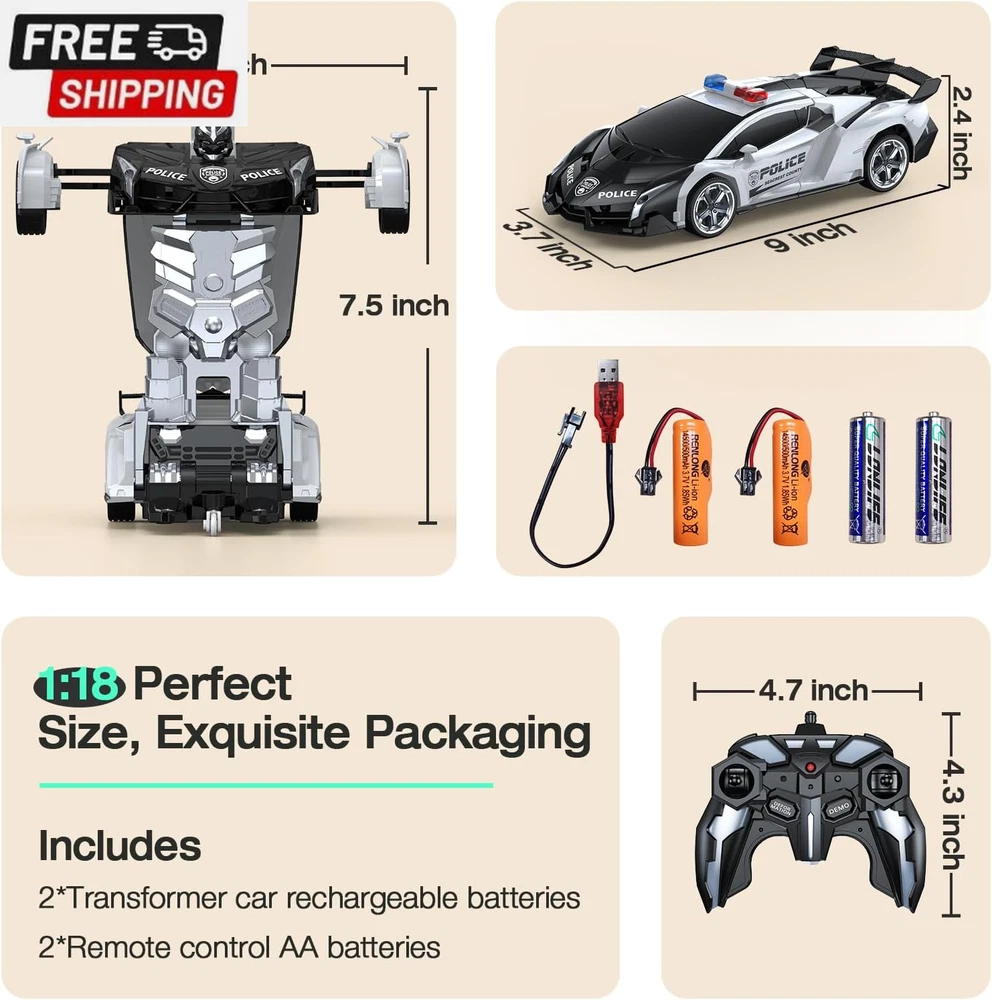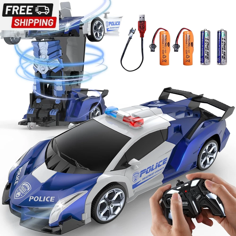 Remote Control Car Toy, 2.4Ghz Transform Robot RC Cars with Flashing Light, 1:18 Scale One Button Deformation Toy Gift Car & 360° Rotating Drifting RC Toy Car for Age 6-12 Years Boy Kids-Black 【Cool 2-in-1 Transformer Toy Car】This 2-in-1 toy RC car combines the features of cars and robots. Just press the button on the remote control, and children can easily control the transformation process of the transforming car. There is no obstacle up, down, left, and right. It can also transform while driving. The 360° rotating smart remote control car suitable for boys allows children to enjoy the fun of manipulating the transforming car! 【Double battery, double game time】Super long battery life. While pursuing a better game experience, we specially prepared 2 AA batteries (for remote control) and 2 rechargeable batteries (each set of batteries provides up to 60 minutes of use time), so that your children can enjoy this creative toy car that combines the features of cars and robots! 【Cool LED police lights & 2.4GHz remote control】Our children's remote control car is equipped with LED police lights, bringing the most realistic police car experience. It can provide lightning-fast response time and a powerful control range of up to 30 meters, achieving more precise control, and multiple cars will not interfere with each other. You can play different cars with family, children and friends at the same time, and enjoy endless fun without interfering with each other 【One-click transformation】This stock transforming car includes an automatic demonstration function, which will surprise children! ! The unique universal wheel design allows children to enjoy the 360° rotation drift of the transforming car. If you encounter any problems, please contact us and we will try our best to solve them for you 【Great and safe gift for kids】High-quality raw materials are safe and durable. Made of high-quality and durable ABS plastic material, it is non-toxic, durable and safe for children. The body is very strong and impact-resistant, ensuring that it will not be easily damaged when used by children. It is durable and is a great toy for 6 7 8 9 10 11 12-year-old boys. It is also an ideal gift for children's birthdays, Christmas,other festival Product Description The video showcases the product in use. The video guides you through product setup. The video compares multiple products. The video shows the product being unpacked. LED Lights Equipped with LED lights, bringing the most realistic police car experience ABS Plastic Made of high-quality and durable ABS plastic material, it is non-toxic, durable and safe for children Rubber Wheels Rechargeable Batteries Please use a normal charging head for charging (you can use a computer USB /Power Bank) Do Not use a fast charging head to avoid damaging the battery Shipping Fast shipping is very important for us. Our standard US shipping service is FREE. Your order will be shipped within 2-3 business days upon full payment received. Your order will be delivered within 2-3 business days after the handling time. We only ship to the confirmed PayPal address. We reserve the right to cancel any order for any reason at any time. We are not responsible for undeliverable addresses. Returns and payment We offer a 30 days return policy from checkout winning date. We allow only PayPal as payment method FeedBack Your feedback very important to us, after you get your package and you are satisfied with our service please leave us positive feedback If you have any problem with your order / any questions please before leave any type of feedback For any questions, using eBay contact system Please visit our eBay store to check out other items for sale! Thank you for shopping at our store.