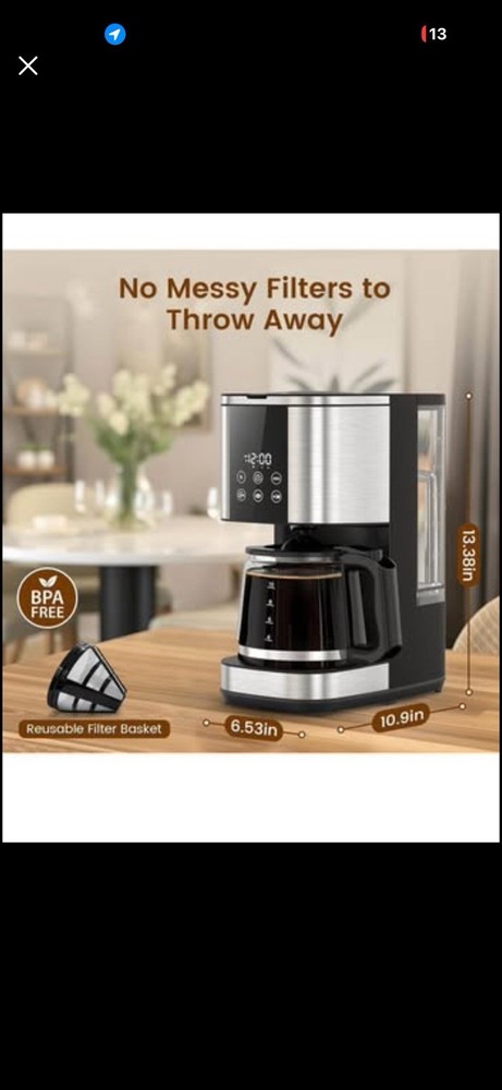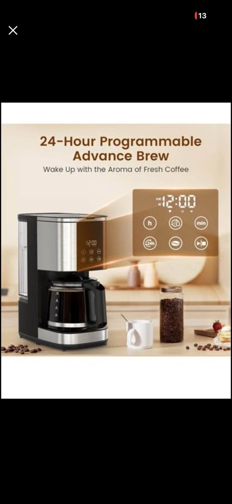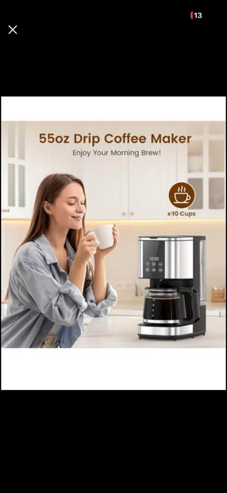 Electactic 10-Cup Drip Coffee Maker, 24-Hour Programmable, Touch Screen, 2 Strength Levels, Reusable Filter, 55oz, Black