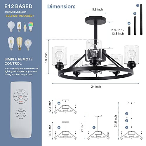 Menu 1. We require immediate payment. 2. We currently accept payment via eBay managed payments only. 3. Once payment is cleared, we will dispatch your shipment within 1-3 business days. Please refer to the "Shipping" tab for more information regarding shipping speed to your destination. 24" Chandelier Ceiling Fans with Lights and Remote, Black Chandelier Fan, Modern Fandelier Ceiling Fan with Lights, 5 Glass Lampshades, 3-Speed Fandelier for Living Room Kitchen Dining Room Product description BLACK CHANDELIER CEILING FANS: Crafted in a rustic style with a matte Black finish, this fan is as fashionable as it is functional. It adds a touch of shabby-chic elegance to any room and creates a refreshing breeze that will make you feel like you're lounging in a cozy mountain cabin REMOTE CONTROL:Three adjustable wind speeds, 1-2-4 hour timing function, reversible blade direction, and light on or off can all be controlled by a remote control. The light and fan functions can be controlled separately, making it convenient for use in different situations ADJUSTABLE HEIGHT: The ceiling fan light is equipped with three different lengths of bottom rods, which are 3.9, 7.8, and 13.8 inches in length. The three bottom rods can be assembled together and can be used for ceilings of different heights. The maximum height of the entire chandelier fan can reach 34.5 inches LIGHT SOURCE: E26 x 5 bulbs, Max 40 Watts (Not dimmable, Bulbs Not included). Suitable for dimming and non-dimming LED E26 bulbs, energy-saving bulbs, halogen bulbs, tungsten bulbs (not including bulbs and dimmers, Buy separately! You can choose warm light or white light bulbs) EASY TO INSTALL: Installation is a breeze thanks to the included mounting hardware and easy-to-follow instructions. Plus, our durable and reliable motor ensures long-lasting performance and efficiency. The surface of the blades is smooth and easy to clean After Sales Service: Customer satisfaction is our greatest motivation. If you have any questions after receiving the product, please let us know and we will reply within 24 hours PLEASE MESSAGE US IF YOU HAVE ANY OTHER QUESTIONS, AND MANY THANKS FOR READING ALL OF THIS. Copyright ©#. All Rights Reserved.