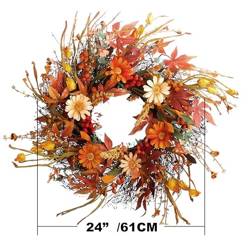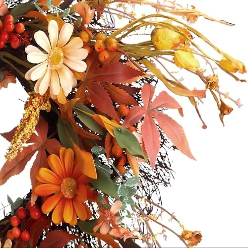 Absolutely love this wreath! The colors are vibrant, and the quality is amazing—it looks so realistic, not cheap at all. Perfect size for my front door, and the mix of holly berries, daisies, and wheat gives it a cozy farmhouse feel. Super sturdy and well-made, arrived quickly too. Highly recommend for anyone wanting to add a touch of autumn charm!