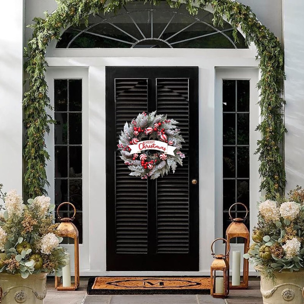 A delicate Christmas wreath adorned with realistic snow-covered pine needles and long pine cones, bright candy and spherical decorations. Suitable for indoor or outdoor Christmas decoration, hang this wreath on any door, window, or entrance, or as the centerpiece for holiday parties and other events, it can also be used all year round. The "Merry Christmas" 3D lettered wooden board is sold separately, with its own rope, please refer to the video for installation instructions. The wreath fully expanded measures 24 inches. Due to transportation reasons, the wreath may be slightly compressed, please adjust the position of the branches and candies to achieve a full effect. We recommend using the wreath indoors or in sheltered outdoor areas to avoid direct sunlight and rain. The wreath requires no special maintenance, if there is dust, simply wipe it gently with a dry cloth to restore it to its original newness. Christmas wreath decoration: Adorned with realistic artificial snow-covered pine needles and long pine cones, the wreath looks lifelike,creating a scene of natural plant growth.Bright candies and spherical decorations of various sizes add a sweet festive touch. Classic Christmas colors evoke the joy of the holiday season Sweet theme: The design features a natural black grass circular base, with branches and candies woven firmly together. High-quality materials are selected to ensure that each candy and decorative ball is plump and exudes an attractive luster. The "Merry Christmas" 3D words wooden board adds more depth and visual focus, creating a piece of art full of love and creativity Versatile uses: The brightly colored wreath is suitable for indoor or outdoor Christmas decoration. Hang this wreath on any door, window, or entrance, or as the centerpiece for holiday parties and other events, adding a festive atmosphere to any area of your home. It can also be used all year round, allowing people to feel the warmth and sweetness of the holiday season in their busy daily lives Size: The fully expanded size of the wreath is 24 inches. Due to transportation reasons, the wreath may be slightly compressed. Please adjust the position of the branches and candies to achieve a full effect. The wooden board comes with easy-to-hang jute rope. You can refer to our video instructions for hanging Tips: Each package includes one wreath and one separate decorative wooden board; we recommend using the wreath indoors or in covered outdoor areas to avoid direct sunlight and rainwater; the wreath requires no special maintenance, just gently wipe with a dry cloth to restore it to new condition; if you have any questions about the wreath, please feel free to contact us, and we will provide you with the best solution