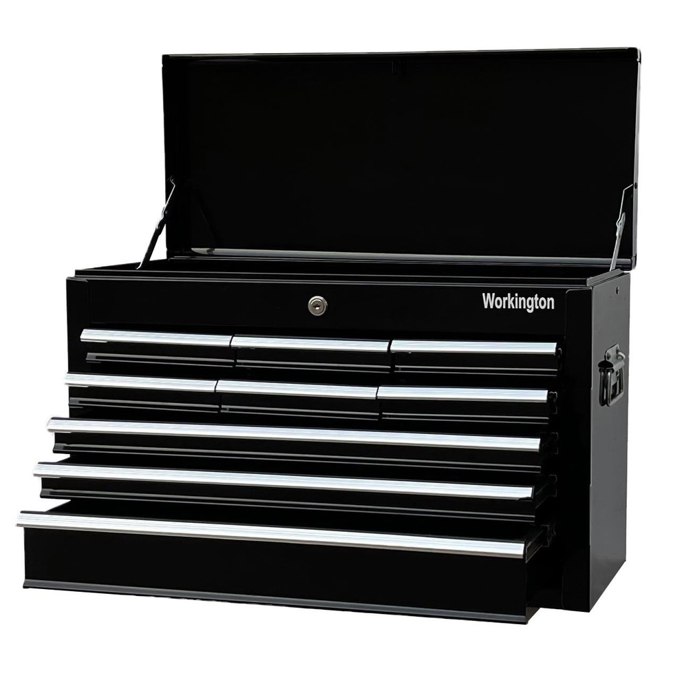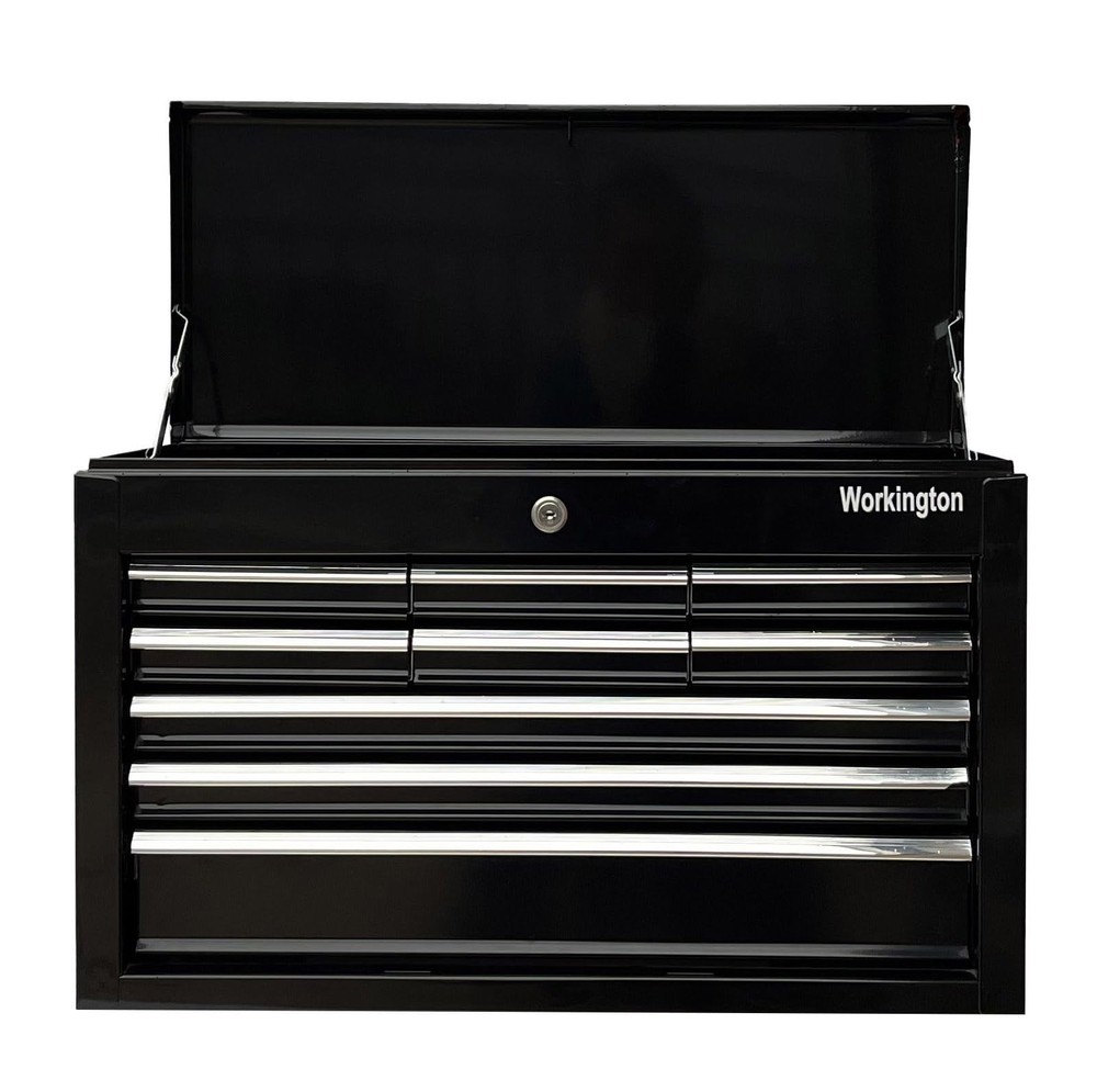 Portable Metal Tool Chest with 9 Drawers, 24" 9-Drawer Tool Chest Cabinet with Ball Bearing Drawer Slides, Steel Tool Storage Box Organizer portable metal tool chest is designed idealy for all purpose tool storage use. Stable and Sturdy The tool box is made of 22 guage steel metal for being durable and sturdy Comfortable Grip Side Handle Comfortable grip side handle for being portable Central Cam Lock Mechanism System Central cam lock mechanism system for extra security Non-slip Drawer Liners Non-slip drawer liners to prevent the tools from rolling when opening the drawer Meet Your Tool Storage Need Plenty of storage space for the 6 drawers and top compartment Specifications Top 6 drawer dimension: 6(W) x 8-7/8(D) x 1-5/8(H) inch Middle 2 drawer dimension: 20-1/8(W) x 8-7/8(D) x 1-5/8(H) inch Bottom 1 drawer dimension: 20-1/8(W) x 8-7/8(D) x 3-3/8(H) inch Product dimension: 23-5/8(W) x 10-1/4(D) x 15-1/8(H) inch 9 drawers portable storage tool chest with two comfortable side handles and full-length piano hinge Central cam lock mechanism system for extra security All ball bearing drawer slides for smooth and efforless open-to-close of the drawers Non-slip drawer liners to prevent the tools from rolling when opening the drawer Product Dimension: 23-5/8"(Width) x 10-1/4"(Depth) x 15-1/8"(Height)
