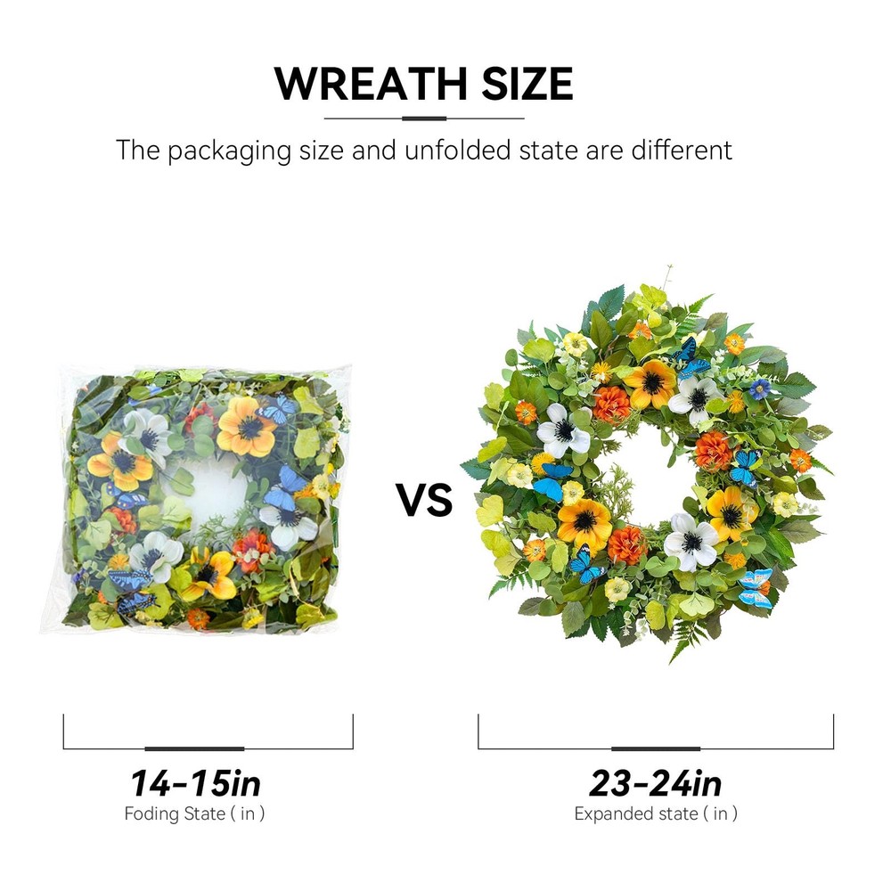 This beautiful wreath instantly brightens up any space! The mix of wildflowers and greenery looks so natural and fresh, perfect for spring and summer. I love how full and realistic it looks—great quality for the price. It holds up well outdoors but also looks lovely inside. The 24-inch size is just right for my front door. Highly recommend for anyone wanting a cheerful, farmhouse-style touch!