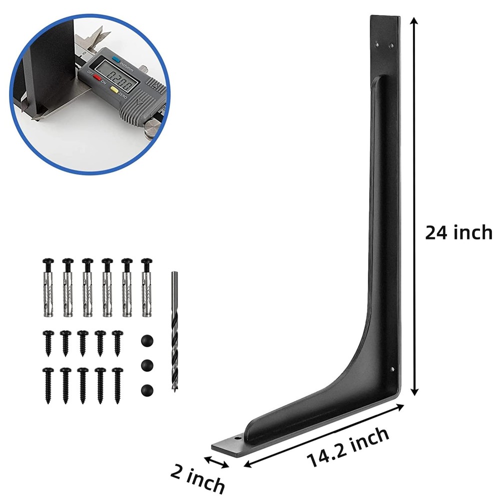 24 INCH x 14.2 INCH shelf brackets,L Shelf Brackets,Rustic Industrial Shelf Brackets with Modern Finish,premium alloy metal heavy duty shelf bracket, Countertop Support Brackets,high strength Mounting Hardware Included, Easy Installation, Pack of 2. 【meaurement】24 x 14.2 inch shelf bracket, apply to 24 inch to 30 inch deep shelf. (board is NOT included) 【perpendicularity】 The brackets are 100% perfect 90-degree vertical angle. 【LOAD 】The Specially made alloy metal material is lighter but stronger than the others on the market. It has greater load- bearing capacity, It can hold up to 320 pounds each pair , 280 pounds is the best weight bearing effect 【powder coating finished】 Matte black coated finish ,durable and sturdiness. L bracket comes with traditional matte black,It fits in perfectly in your farmhouse kitchen, garage, basement storage room, and backyard. 【Complimentary PACK】G5 high strength screws ,screws and anchors are for hard walls. (dry wall anchors not provide) Following the steps properly, put your Pre-prepared lumber board on, you will get your perfect and stable floating shelves.