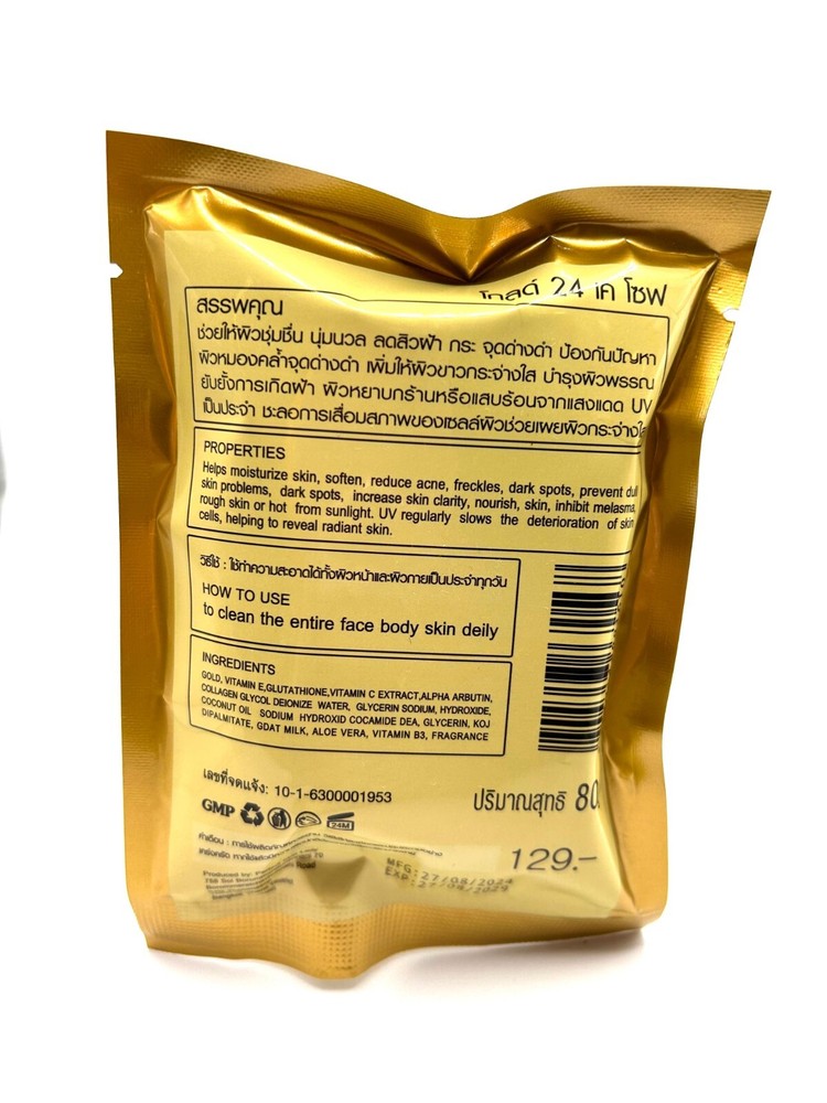 24K Gold Whitening Soap – Luxurious Skin Care Treatment Product Overview: Indulge your skin with the ultimate in luxury and skincare benefits. Our 24K Gold Whitening Soap is infused with real 24K gold particles to provide a superior skincare experience. This exquisite soap deeply nourishes, brightens, and helps even out skin tone, leaving your skin looking radiant and youthful. Key Features: 24K Gold Infusion: Contains real 24K gold particles that help stimulate collagen production, improve skin elasticity, and promote a radiant glow. Whitening & Brightening: Formulated with natural ingredients to lighten and brighten your complexion for a more even skin tone. Nourishing: Rich in vitamins and antioxidants to hydrate and restore moisture to your skin, leaving it soft, smooth, and healthy-looking. Luxury Skin Care: Perfect for those who want to experience a spa-like treatment in the comfort of their own home. Benefits: Reduces dark spots and hyperpigmentation Enhances skin’s natural glow Improves skin texture and tone Leaves skin feeling soft and moisturized Fights the signs of aging with its rejuvenating properties How to Use: Lather soap with water and gently massage onto your skin. Leave it on for a few minutes to allow the nourishing ingredients to absorb, then rinse off with warm water. For best results, use daily. Ingredients: Contains 24K Gold and other nourishing botanical extracts. Why Choose 24K Gold Whitening Soap? Our 24K Gold Whitening Soap is more than just a cleansing bar—it’s a luxurious treatment that leaves your skin looking its best. Infused with 24K gold for an added touch of elegance, this soap helps restore your skin's youthful glow while providing nourishing care every time you use it. Order Now for Radiant, Glowing Skin!