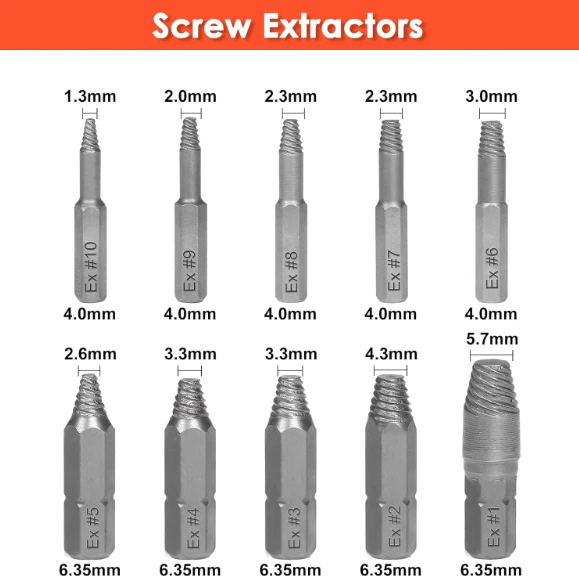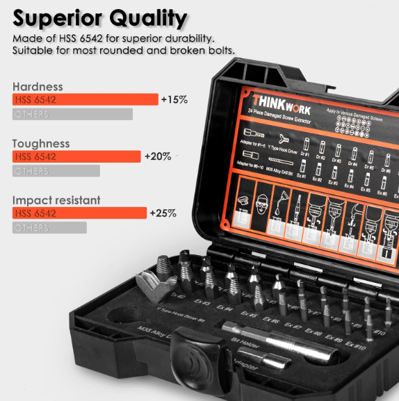 Stripped Bolt Extractor Impact Socket Set 24 PCS Damaged Bolt Remover Easy Out US Warehouse - FREE & FAST Shipping in US Product Description: Premium Quality: Each damaged small screw extractor is made of high hardness high-speed steel 6542 with 68 HRC max Rockwell hardness, and double times price higher than the HSS 4341, just for the superior durability Rich Accessories: Besides getting extractor & bit adapter * 1, bit holder * 1, Y type hook driver * 1, you can also get the M35 high hardness drill bit with 69 HRC max Rockwell hardness for greater versatility Easy to Use: A friendly user guide to let you get started quickly to extract the damaged bolts, nuts & small screws with ease Wide Applications: The stripped screw extractor set includes 20 pieces of stripped screw extractor in 10 different sizes to meet all your demands, such as Allen bolts, machine screws, lag bolts, wood screws, hex bolts, sheet metal screws, and other screws Portable Organized Storage: A compact, heavy-duty blow mold case keeps all the screw extractors organized and takes your set on the go Feedback: 1.Any question for your order, please contact us in time, we will reply to you within 24 hours and give you a satisfactory answer. 2.If you are satisfied with our products and services, hope to take up your a little precious time to leave feedback reviews for our products.Thanks! 3.Your satisfaction is our effort. Welcome to order again! Have a great day! Our Policy: 100% Satisfaction Guarantee 20% of restocking fee will be charged for return item