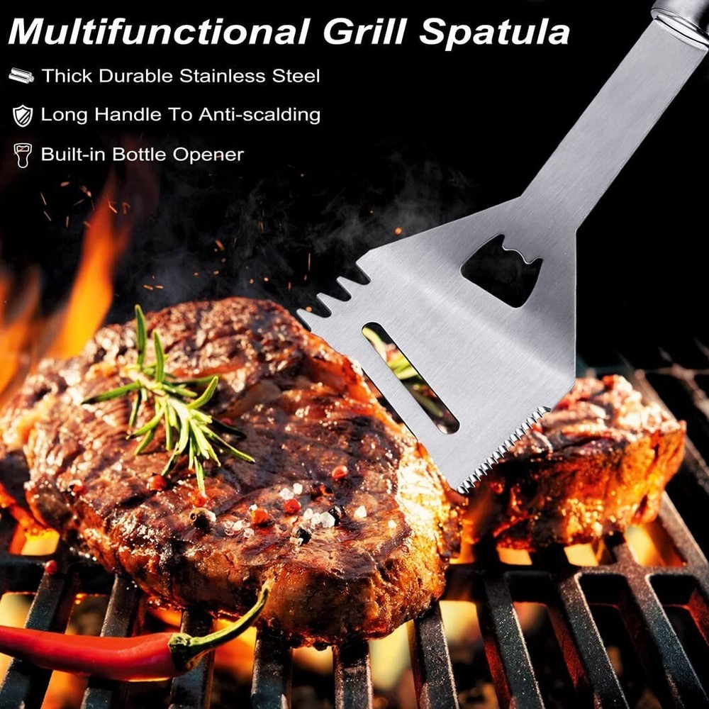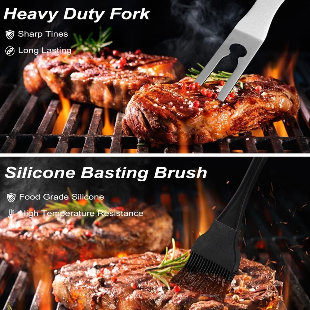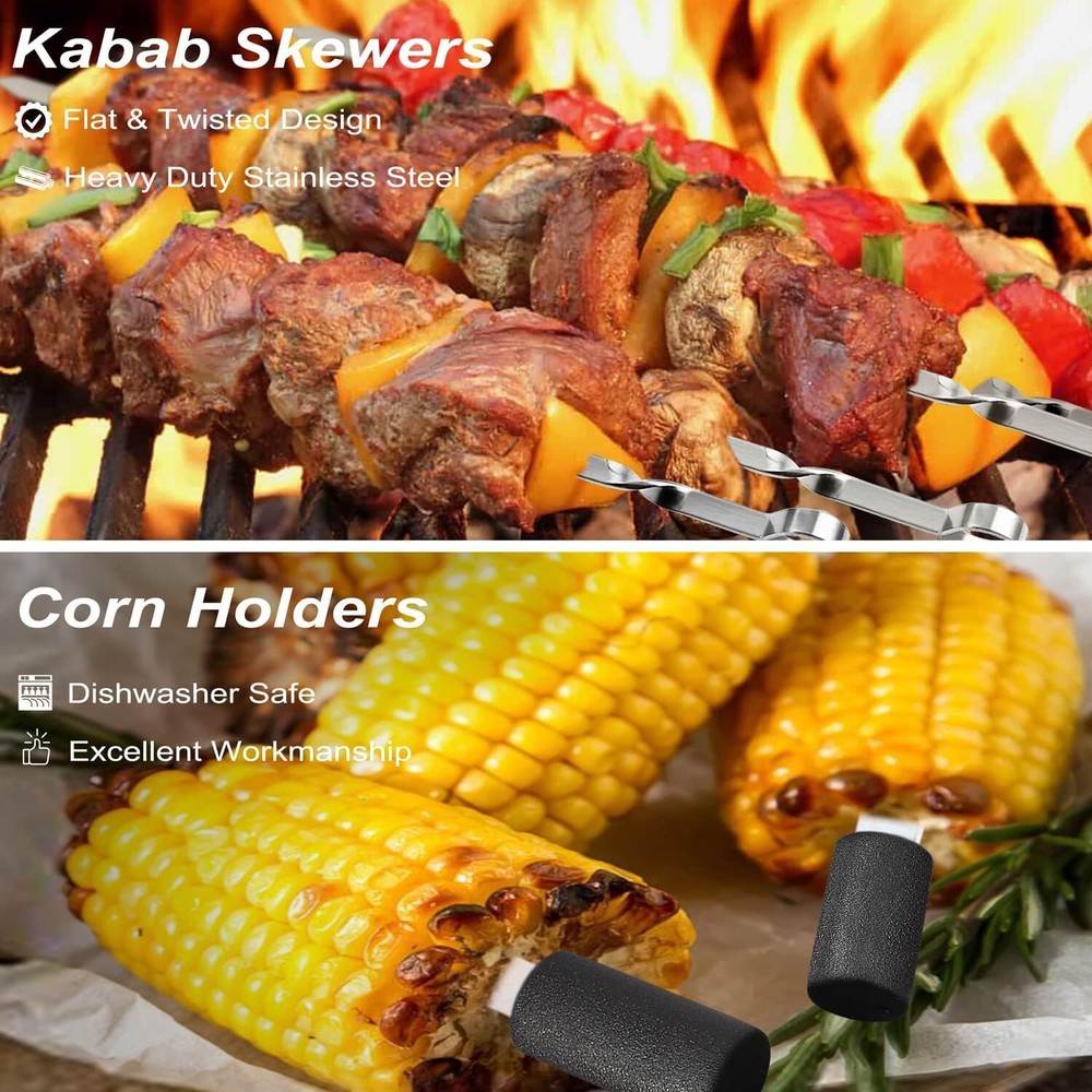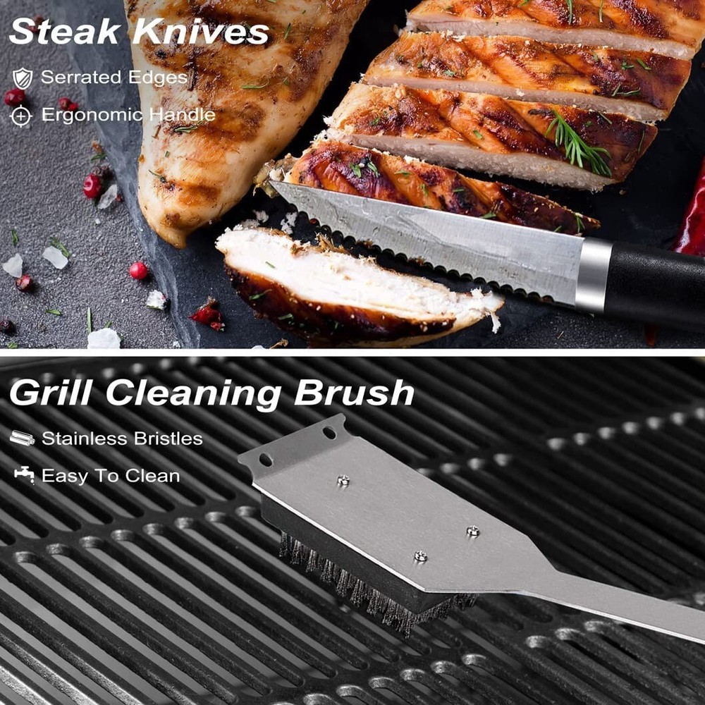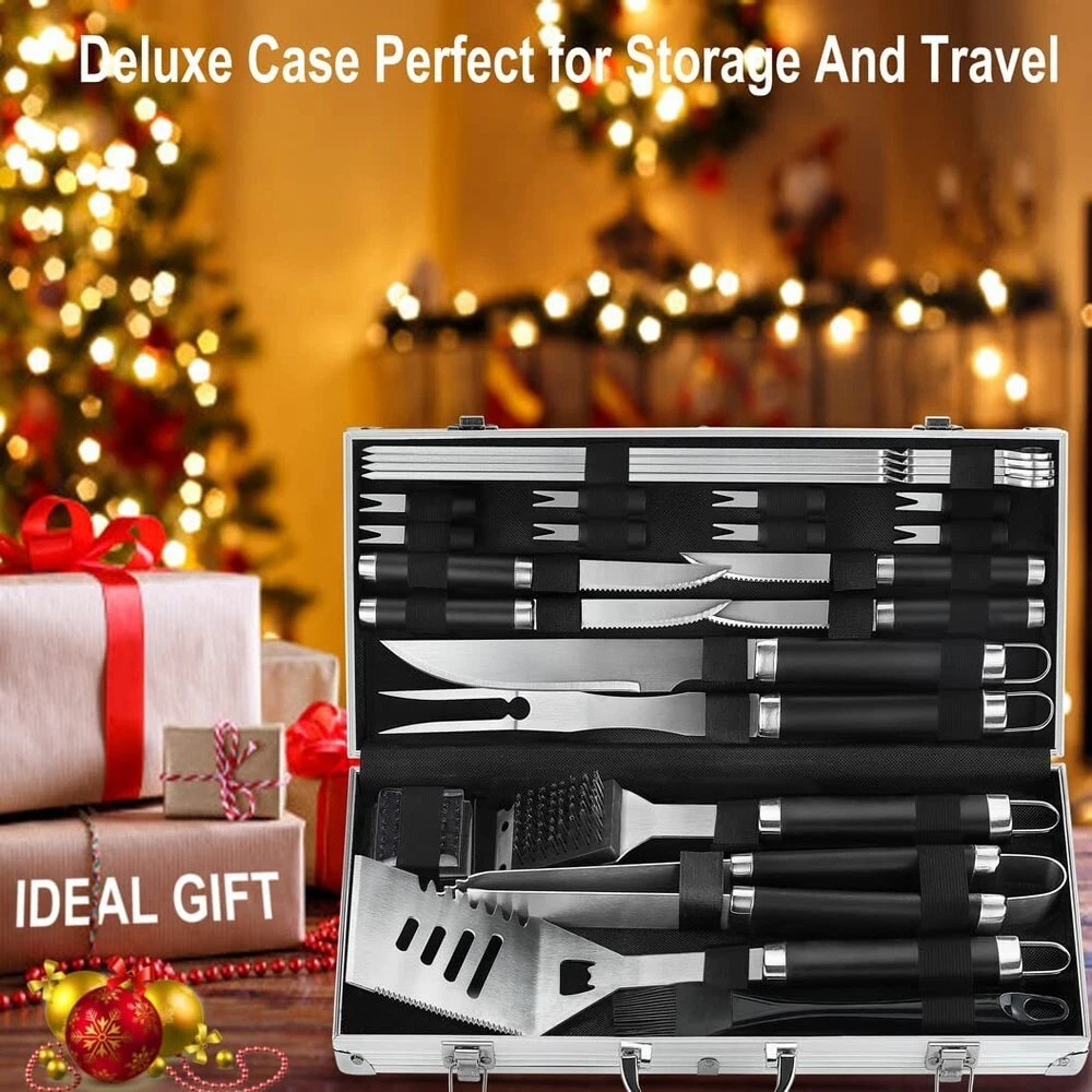 POLIGO 24PCS Grill Tools Set BBQ Accessories for Outdoor Grill Utensils Stainless Steel Grilling Tools Set for Christmas Birthday Presents, Barbecue Accessories Ideal Grilling Gifts for Men Dad Women · Complete Set: This 24 piece BBQ set comes with everything from necessities like a spatula, fork, tongs, and grill brush to extras tools like a knife, basting brush, replacement brush head, 4 steak knives, 4 skewers, 8 corn holders and aluminum carrying case, that will allow you to serve your next grilled meal with ease. · Exceptional Quality: The grill accessories are made of quality stainless steel, so the barbecue tools are rust resistant and can withstand high temperatures, allowing for long-lasting reliability. · Ergonomic Design: The main grill tools are about 16 inches long and they are designed with solid, elongated handles that allow you have a safe and comfortable grip while cooking. Also the hanging loops of grilling utensils offer space-saving and organized storage. · Durable Case: The BBQ tool set comes in a solidly constructed aluminum briefcase for convenient storage and portable transport. · Easy Care: The grill set are easy to clean with warm, soapy water and can be safely tossed into the dishwasher. · Versatile Use: Whether your cooking on a gas grill, smoker, charcoal or a campfire grill, this professional grill tool set can tackle it all. · Gifts Ideas: Our grilling set comes beautifully packed in a gift box, ideal gifts for men and women on Father's day, birthdays, Christmas, and more.