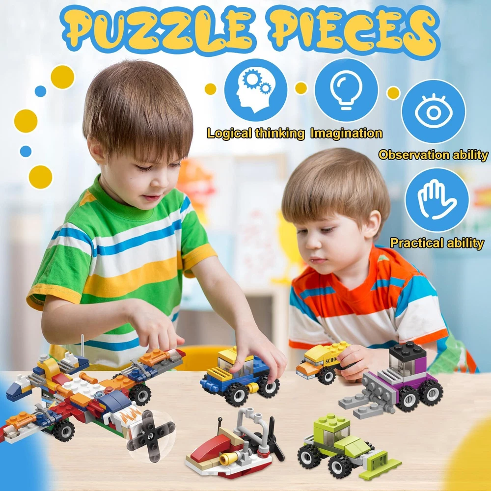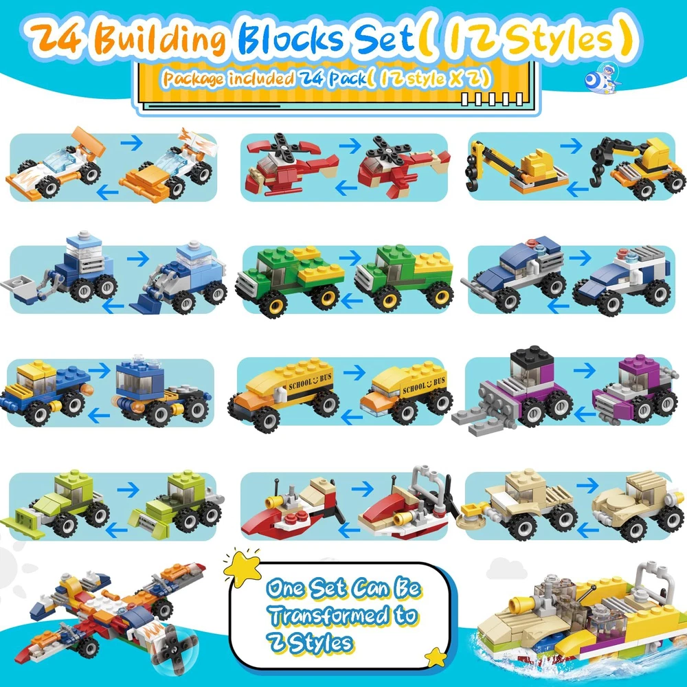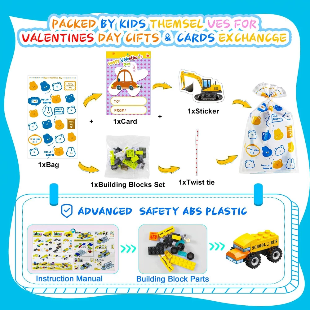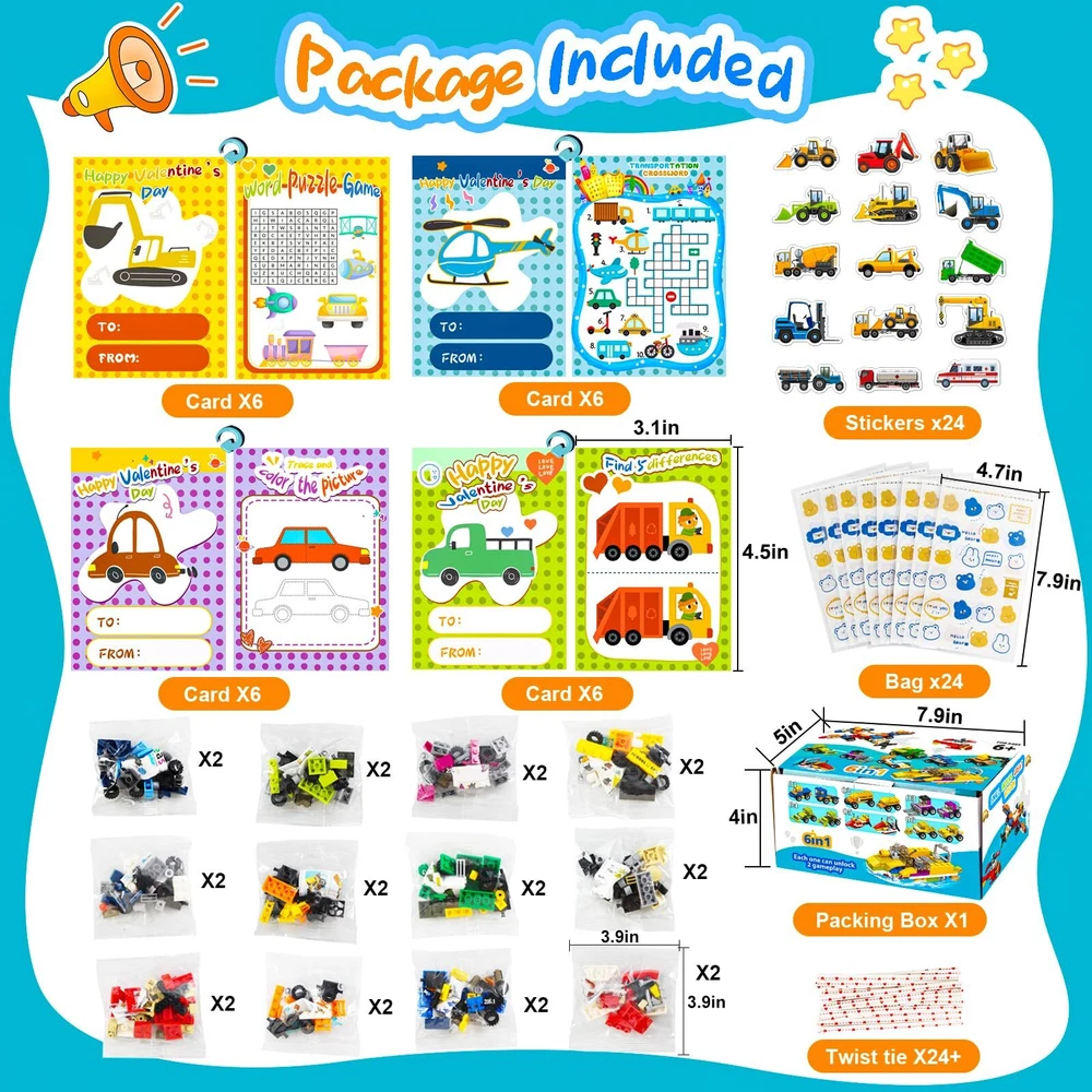 Kids Valentines Day Gifts:The Valentines boxes for kids come with 24 different car & plane designed un-assembled building blocks, 24 cute Valentines day cards, 24PCS Valentines Day stickers, 24 cute OPP bags & twist tie * 24 Valentines Cards for Kids Classroom:Our kids Valentines gifts set includes 24 pcs 4 different Valentines cards,write blessing on the card, pick 1 building blocks pack, sticker, 1 write-completed card, and pack together and give the Valentines treat bags to classmates Premium Quality & Safety:Our car & plane building blocks are made in superior quality plastic material, which is safety & durable, kid-friendly. Toy building sets contain small parts, be careful to prevent swallowing for kids under 5/6 years old Kids Valentines Day Cards:Our Valentine's Day set have 24 cute cards, one size is write who & blessing, and an educational game on the other side. Great exchange Valentine's Day Gifts for kids classroom/school Valentines Day Gifts for Kids:Spread love and friendship and extra special for your child and their classmates with our delightful cards. From building toys to fun and educational games, keep the kids entertained and create lasting memories