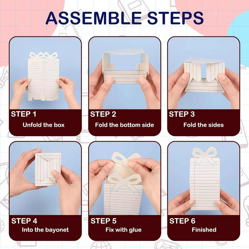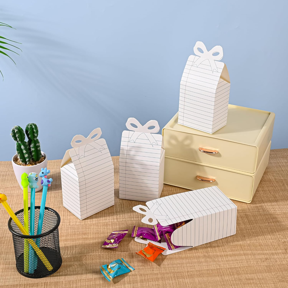 Menu Other Items Feedbacks About Us Contact Us Add To Favorites 24Pcs Back to School Gift Boxes Notebook Graduation Candy Box First Day of School Classroom Treat Box with Bow for Party Favors Thanks Teacher School Classroom Decoration Back to School Surprises: Delight students and teachers with 24 charming foldable gift boxes! Ideal for first-day treats, classroom rewards, or teacher appreciation gifts, these adorable boxes add a playful touch to cookies, candies, small toys, or heartfelt notes Effortless Assembly, Maximum Impact: Pre-creased boxes fold into shape in seconds—no scissors or tape needed! Includes glue dots for secure closures. Flat storage saves space until party day, making them stress-free for busy teachers and parents Premium Design: Made of sturdy, double-sided cardstock with vibrant photo-quality prints. Non-toxic, odor-free, and built to hold treats securely. Features cute school notebook themed designs with bows—perfect for boys and girls to personalize Multi-Use Celebration Essential: Use beyond classrooms: birthday party favors, holiday goodie bags, or wedding loot boxes. Doubles as festive desk decor or DIY craft projects. Bulk 24-pack ensures every student gets a memorable surprise Value-Packed Party Starter Kit: Get 24 boxes + glue dots for large groups. Teachers love using them for icebreaker activities, while parents rave about their worthy graduation Get 24 ready to decorate notebook design boxes! Great for classrooms, school carnivals, or teacher thank-you Size for storing items inside: 3.5 inches tall. Hide treats, notes, or classroom rewards inside. Add ribbons to create festive desk decor or loot boxes Works as birthday party favors, holiday loot bags, or wedding welcome gifts. Doubles as desk decor for school spirit Specifications: Materials: paper Size: 3.75 x 3.55 x 2.55inch Package includes: 24 x notebook gift boxes 40 x glue dots Notes: Manual measurement, these may vary in sizes slightly Arrives flat, some assembly required Item Specification Item model number Back to School Gift Boxes Part Number Back to School Gift Boxes Batteries Required? No Number of Items 24 Unit Count 24.0 Count Color White Pattern Cartoon Material Cardboard Country of Origin China Item Weight 12.3 ounces Theme Notebook Cartoon Batteries Included? No Occasion Birthday, Back To School Size 1 Count (Pack of 24) Package Dimensions 9.41 x 6.18 x 1.34 inches Included Components 24 Gift Boxes, 40 Glue Dots SHIPPING FREE FAST SHIPPING FREE SHIPPING We are always working hard to ensure your package arrives as soon as possible. Please understand that some factors like weather, high postal traffic, and the performance of shipping companies are outside of our control. We offer free shipping to the lower 48 states. We do not accept P.O. Boxes. Please provide a physical address. If you have a problem or question regarding your transaction please contact us immediately. We will work with you to resolve any problem you may have. Thank you