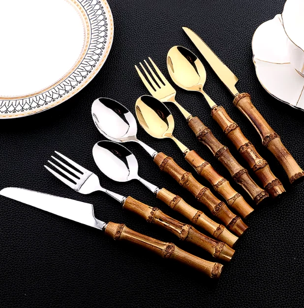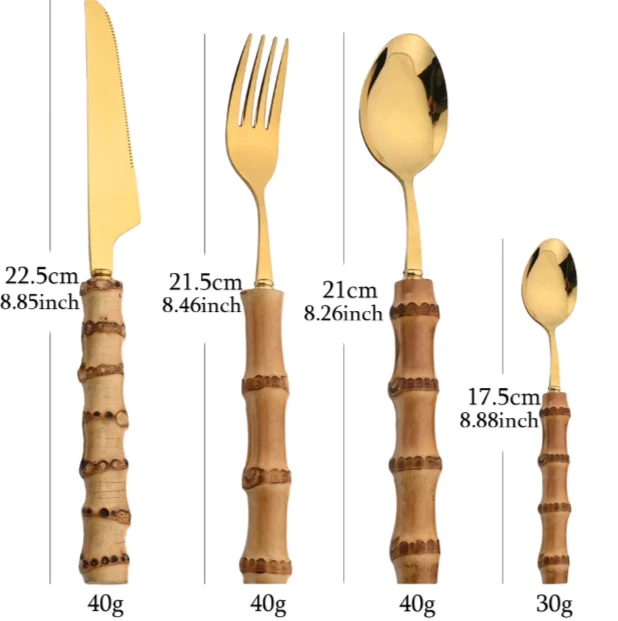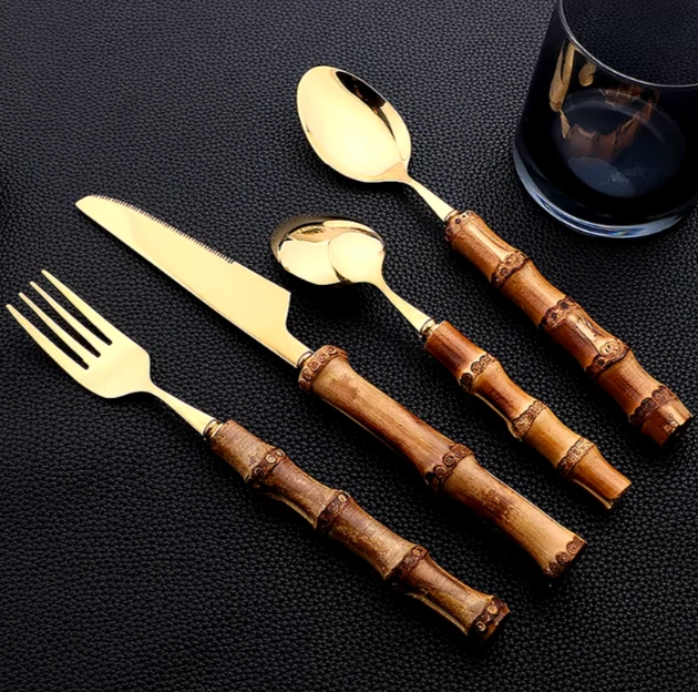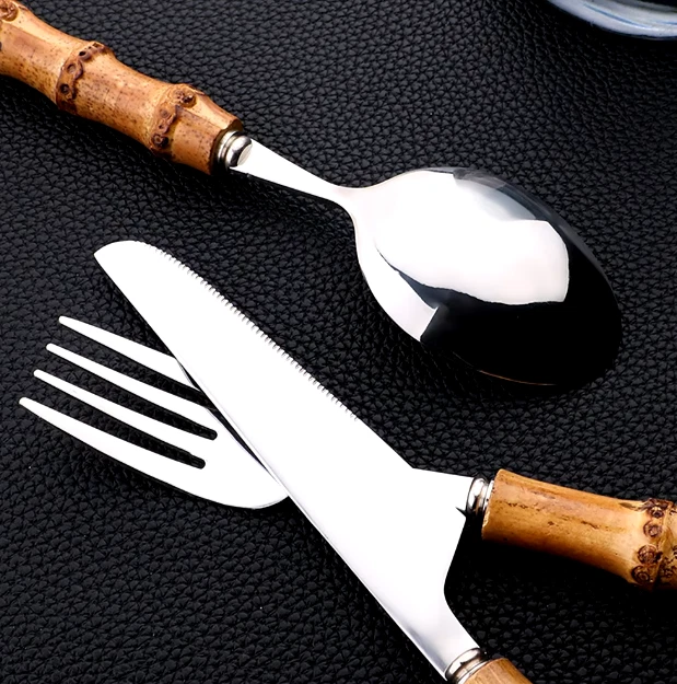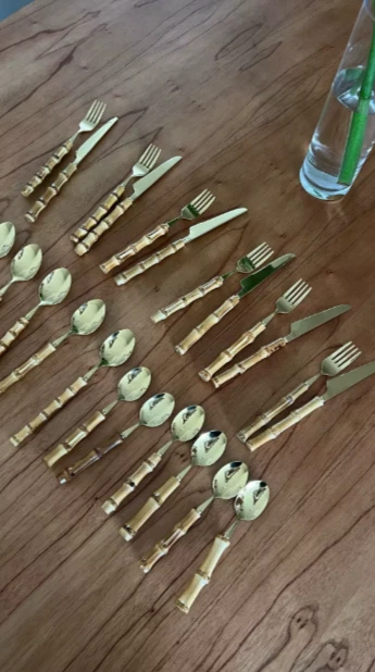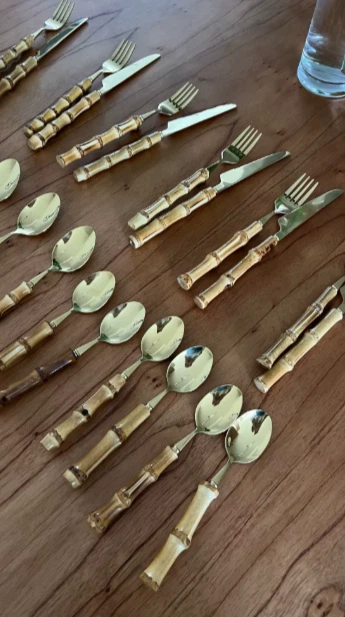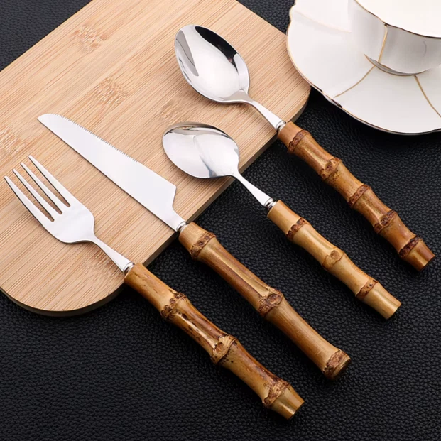 This 24-piece bamboo tableware set includes cutlery perfect for dining occasions. The set features a natural design with stainless steel elements, combining a rustic touch with modern durability. Ideal for use in the kitchen or dining room, this set provides a complete dining solution for individuals or small gatherings. The bamboo material offers an eco-friendly alternative to traditional tableware, while the stainless steel components ensure longevity and ease of maintenance. Perfect for adding a stylish and sustainable touch to your dining experience.