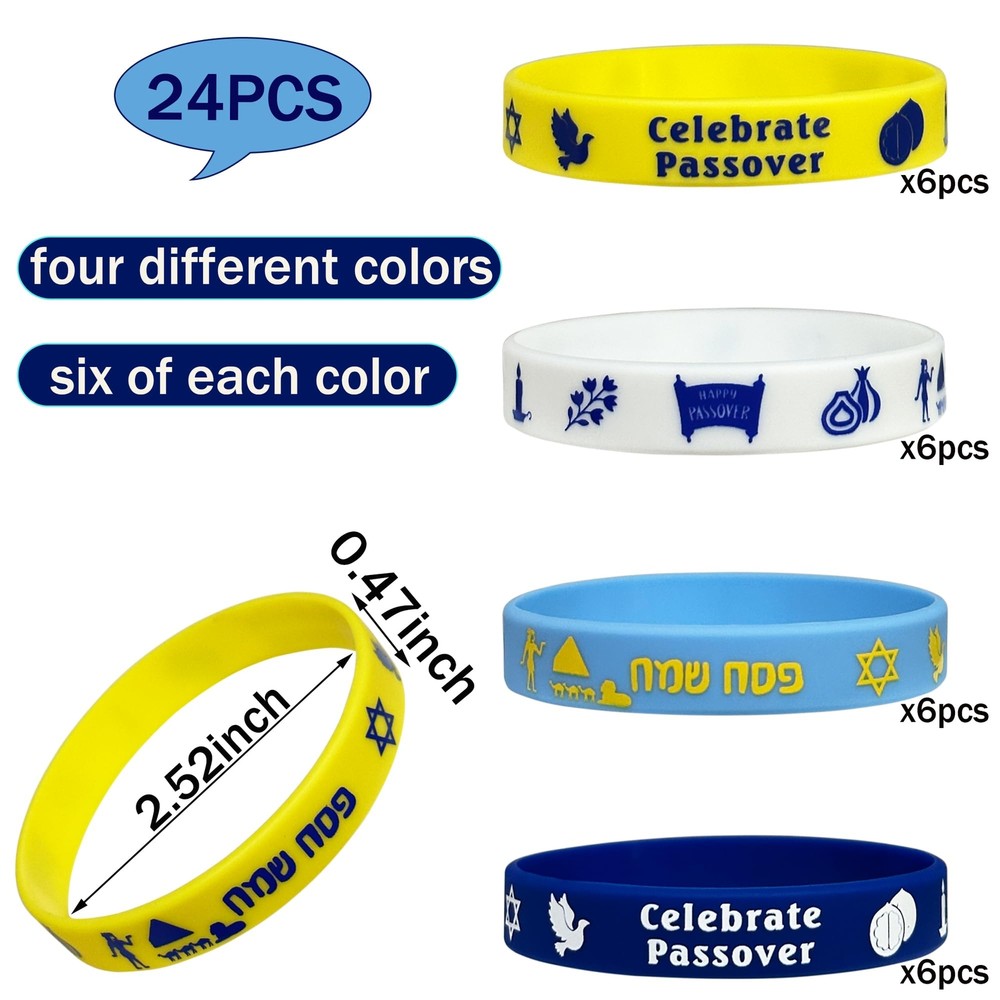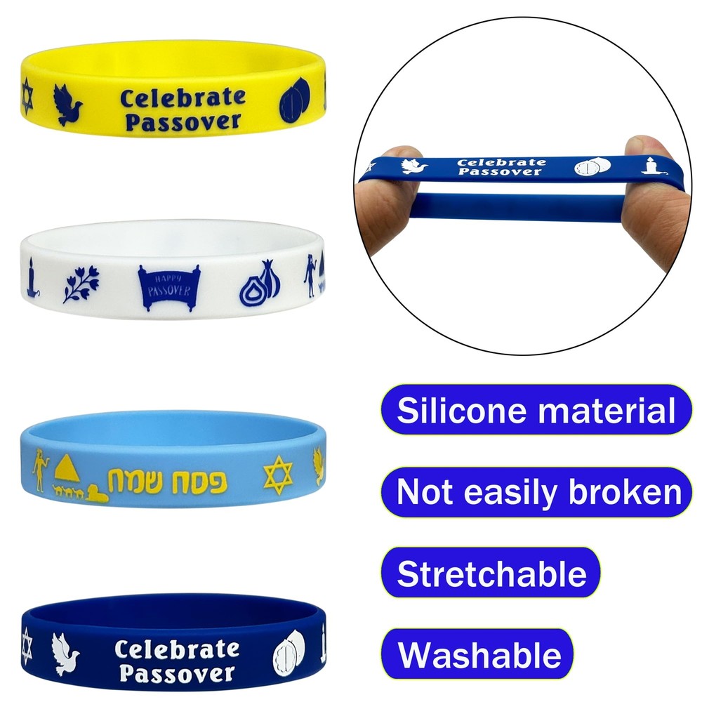 Apply to: These rubber bracelets are wonderful accessories for Passover parties, Jewish holiday Party, other Jewish party, and so on, also serving as nice gifts favors and goodie bag stuff. Features: Waterproof rubber bracelet is more durable, and the patterns are not easily to fade away. These rubber band bracelets are made of silicone, soft and flexible material, make it comfortable to wear on hands. It is strong enough, not easy to break, and you can use it for a long time. Package includes: 24 x Passover rubber bracelets Specifications: Material: silicone Color: yellow, blue, light blue and white color, as the picture shown Size: about 2.56 inches/ 6.5 cm in diameter, 0.5 inch/ 1.27 cm in width Package Includes - 24pcs Happy Passover themed rubber bracelets, available in 4 different colors, bulk of quantity to share with your families and friends on Passover party. Multi-colors design - These Passover themed rubber bracelets are designed with Jewish Passover words and patterns, simple and attractive, and these bracelets are suitable for adults, which would add stronger festive atmosphere to your Passover holiday party celebration and other Jewish party. Material - Each Passover bracelet is made of tough, flexible silicone rubber. Flexible but strong, these bracelets will hold their shape and not break easily. One size fits most - These Passover rubber wristbands are in the same size, each measures 2.56 inches in diameter, 0.47 inch in width, they can be stretched to fit different hands, one size fits most unisex adults. Wide applicability - these rubber party wristbands have a wide range of applications, nice for Passover parties, Happy Passover Party, other Jewish holiday party, and so on, which would bring thick congratulation atmosphere for your party.