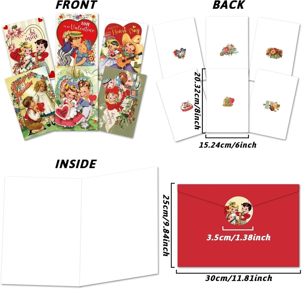 24 Pack Vintage Valentine's Day Cards with Envelopes and Stickers Valentines Day Greeting Cards Assortment for Kids Holiday Crafting All Occasions Anniversary Baby Shower Classroom Exchange Supplies About this item What You Will Receive : The Valentine's Day card pack contains 24pcs greeting cards in 6 designs , 24pcs envelopes and 40pcs stickers.This Valentine's Day cards assortment is designed for kids to spread their wishes on Valentine's Day. Elements Full of Valentine's Day Atmosphere:The hearts and roses on the picture are very suitable for the sweet and warm atmosphere of Valentine's Day. The choice of card color is very retro ,it’s also different from ordinary greeting cards, which will be very impressive to your friends. Reliable Material: Valentine's Day cards are made from well-managed forests,this kind of material does not contain any chemical ingredients.It don’t cause any harm to your health and it’s the best choice for your kids. More Space to Write:The Valentine's Day cards' measurement are Approx. 8"x6" (20.32cm x 15.24cm). Valentine's Day cards have more space for writing than normal cards.The surface of the Valentine's Day cards made of this material is very smooth, kids can draw and paint on it at will to fully express their emotions. Suit for Many Places:Valentine's Day cards can be used in many places.For example, you can write or draw on them to send your greetings to your friends. You can also give it as a birthday gift to your kids.