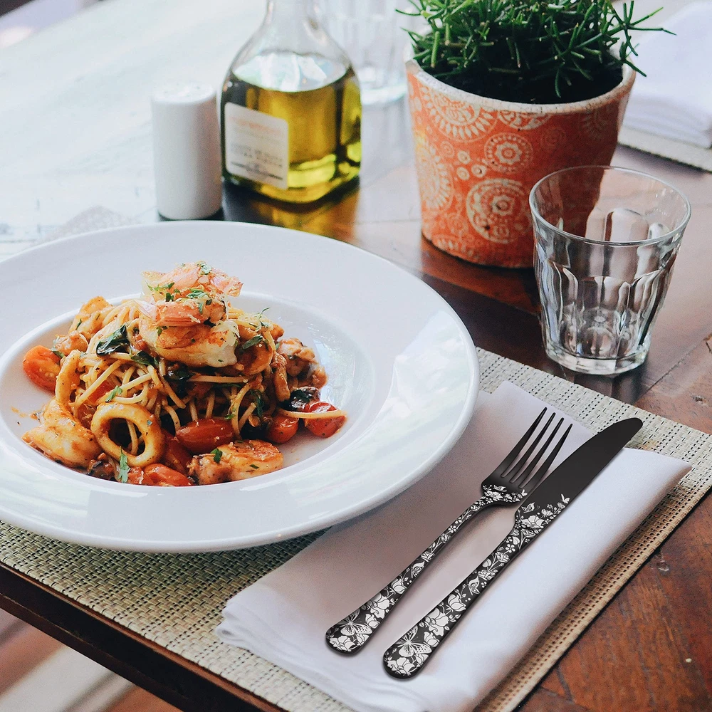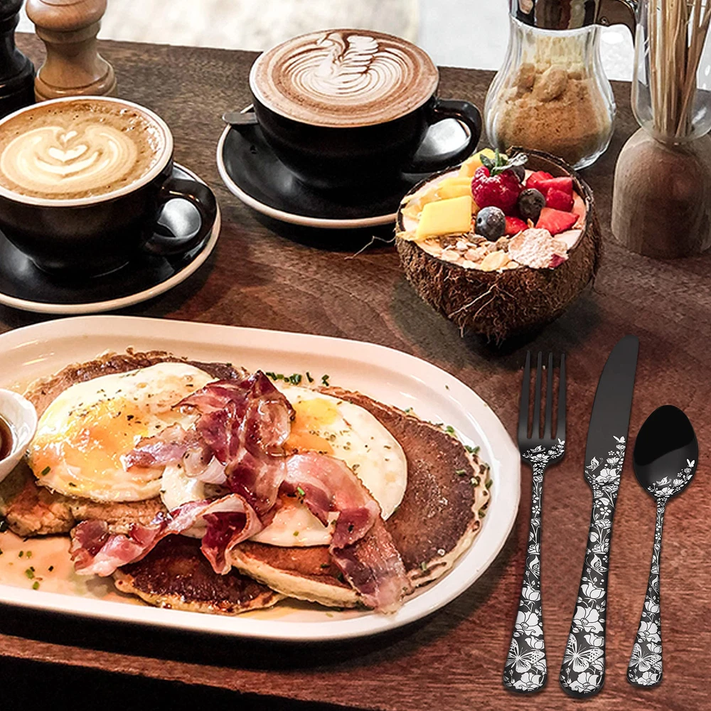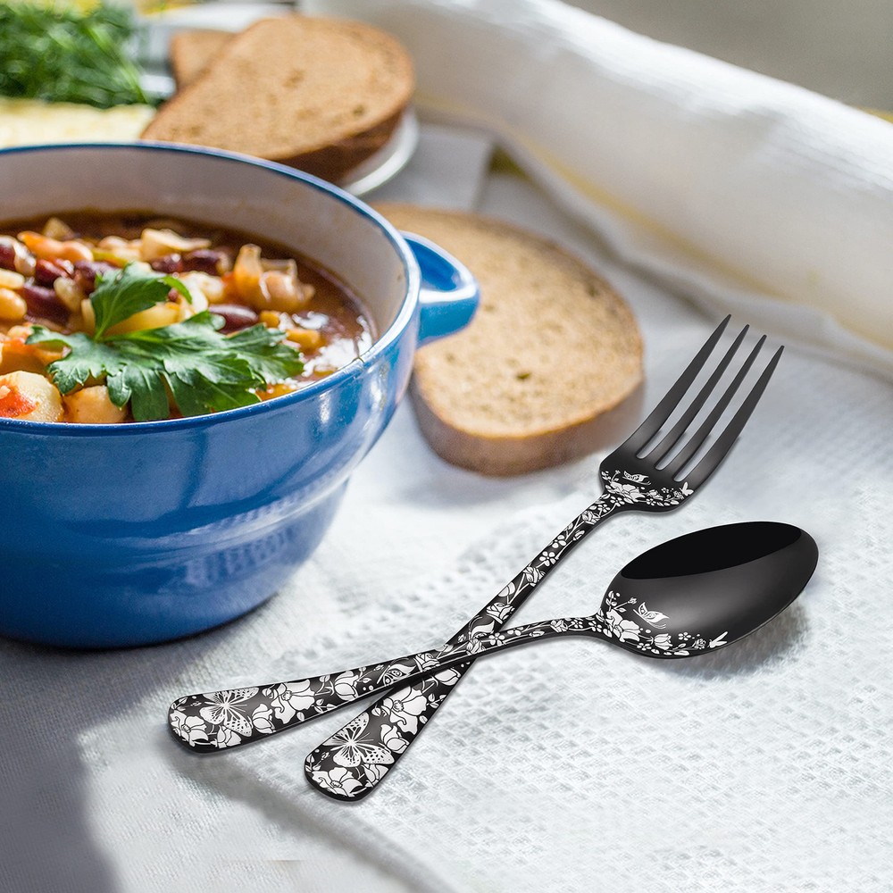 24 Piece Silverware Set: Including 4 dinner forks, 4 salad forks, 4 dinner knives, 4 dinner spoons, 4 teaspoons and additional 4 steak knives, nice basics for a family of 4 people or as a reserve to hold parties or weekday dinner. Superior Quality: Our black flatware is made of food grade premium stainless steel, resist rust and corrosion, will not bend or chip, sturdy and durable for daily use, Easy to clean and also dishwasher safe. Unique Design: This cutlery set are decorated with beautiful laser print of butterfly with floral, stylish shape with black finish add a touch of elegant and luxurious dining sense on your table setting. Nice workmanship: Smooth edge ensure safety and no scratches, ergonomic curved handle designed to provide good grip for both adults and big children, Each utensil is solid, well balanced and comfortable to use. Steak Knife Included: In this set, we have 4 additional steak knives with sharp serrations that are easy to slice steaks or disassemble a turkey. And the triple riveting handle is strong and durable, very comfortable to hold.