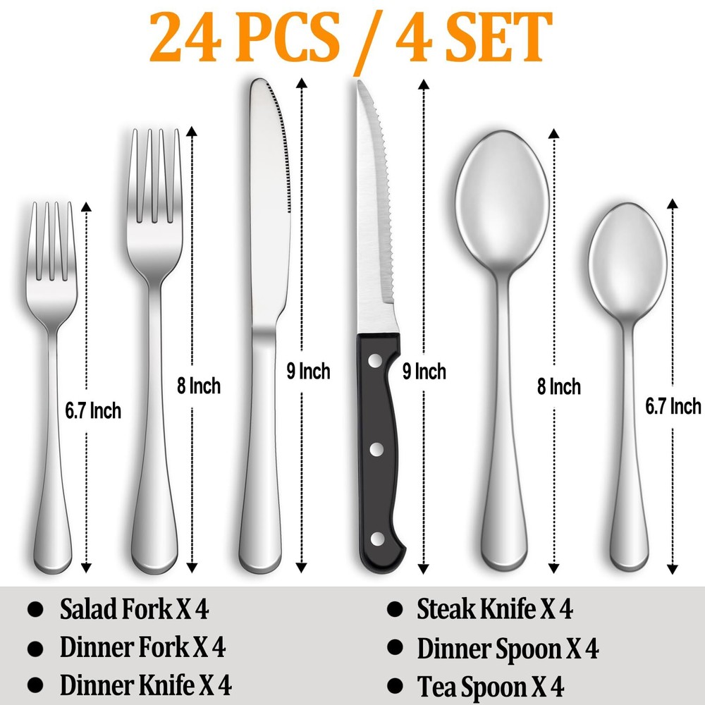 24 PCS SILVERWARE SET SERVICE FOR 4: This silverware set comes with 4 Dinner Knife, 4 Steak Knives, 4 Dinner Forks, 4 Dinner Spoons, 4 Salad/Dessert Fork and 4 Dessert/Tea Spoons, essential for families or restaurants. The set is also an irreplaceable dining tool whether it is for daily use or for preparing dinners or parties. PREMIUM STAINLESS STEEL: This flatware set is made of high quality food grade stainless steel which is very durable, rust-proof, corrosion resistant, non-toxic, BPA free, no metal aftertaste. Meanwhile, its sturdiness ensures that it will not bend easily providing you with long - term use. Most importantly, they're dishwasher safe. PROPER WEIGHT AND COMFORTABLE HANDLE: Unlike other brands, the curvature of our utensil handles is designed according to the posture of the hand, and the appropriate weight and perfect balance are added to ensure maximum comfort during use that avoids you feel tired. Moreover, the smooth edges ensure safety and no scratches. ELEGANT SHAPE AND EXQUISITE WORKMANSHIP: Highly mirror polished, smooth edges and the classic shape design make this flatware set stunning and look expensive. It is very suitable for all your home styles and can match any tableware you have. There are no rough spots or sharp edges, very comfortable to use without hurting your mouth at all. MULTIPLE USES: Choosing a good set of cutlery is not only for everyday use, but also for upcoming holiday parties, gatherings, weddings, camping and entertainment, or for buffets and banquets at restaurants or hotels. It's also a wonderful choice as a gift.