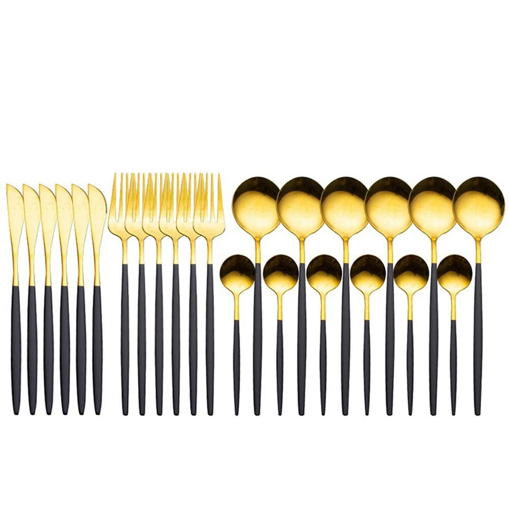 24Pcs Stainless Steel Dinnerware Set Cutlery Spoon Fork Knife Western8443 [24 PIECES FLATWARE SETS FOR 6] The stainless steel flatware set includes 6 Knifes, 6 Forks, 6 Dinner Spoons, 6 dessert Spoons, 24 piece totally. This utensil set meet all of your . [HIGH QUALITY] The stainless steel silverware cutlery set made from Premium Stainless Steel, which is and healthy for your daily use, dishwasher safe, modern design with ergonomic handles, the well-balanced weight and smoothly body curve very comfortable to handle in your hand. [STURDY AND HEALTHY] The Stainless steel spoons and forks knifes are completed electroplated with titanium metal. Sturdy structure and no worry about bending, rust-proof and for long time use. [WIDELY USE FOR ALL SITUATIONS] This Luxury stainless steel flatware set suitable for use, hotel, restaurant, entertaining, , buffet, bistro, camping, picnic, etc. Makes a great gift presented for family and friends. Great gift at Christmas, Birthday, Mother's Day, Father's Day, Valentine's Day and so on. Colour:Black-Gold/Green-Gold/White-Gold Material:Metal Package Contents: 6 * Knifes 6 * Forks 6 * Dinner Spoons 6 * dessert Spoons Only the above package content, other products are not included. Note: Light reflection and different displays may cause the color of the item in the picture a little different from the real thing. The measurement allowed error is +/- 1-3cm.