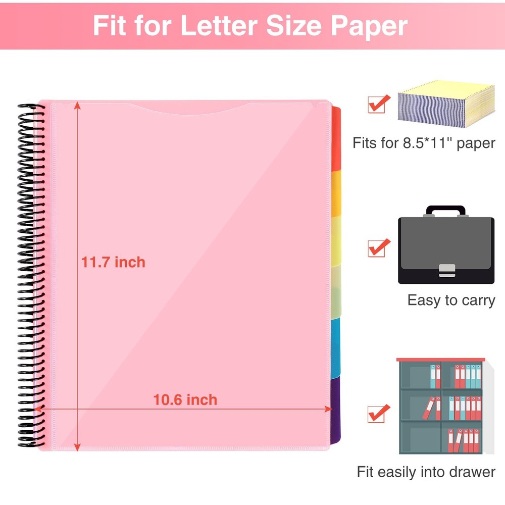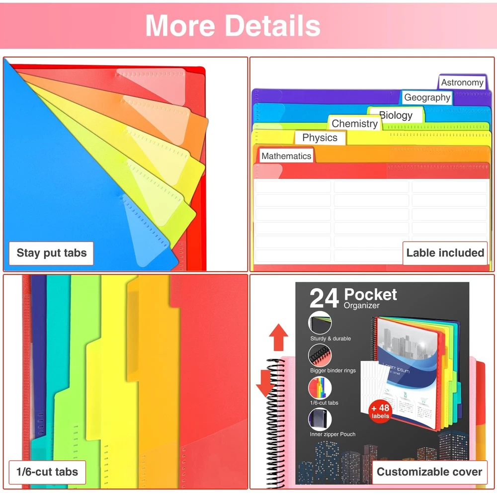Perfect Organizing Tool: This project folder is perfect for categorizing and organizing homework, projects, bills, and other important documents. It includes 24 pockets, 12 dividers with 1/3-cut assorted tabs, and blank viewable label sheet, which help you sort and find files conveniently. High-efficiency Paper Organizer: 24 pockets, 12 dividers with 1/3-cut assorted tabs in bright colors, and 48 blank viewable sticky labels. Super handy for quick referencing. Perfect for categorizing and organizing projects, homework, assignments or other important documents. Sturdy & Durable Spiral Binder: Made of sturdy polypropylene, tear-proof, water-resistant, archival safe, and PVC free. The bigger binder ring greatly improves its long-lasting performance, allowing you to insert more papers, lay flat and stay open. Large Capacity: Contains 24 pockets, each pocket can hold 30-40 sheets of paper. Total about 960 sheets, enough for you to organize and classify. An inner clear zipper pouch & back pocket for extra storage to hold small items, keep you more organized. Perfect for desktop filing and on-the-go use. Additional Pocket & Special Stay Put Tabs & Customizable Cover: The additional pocket on the back of the cover is perfect for labels, calendars, and bills. Special stay put tabs inside of the folder, restrain the top corner of your papers slides out. Customizable front cover allows for complete customization of your folder with ease. Efficient Locating & Categorizing: Using extra 48 sticky labels customize your folder tabs, increase your efficiency in finding and locating files. You can also write on viewable tabs and erase when you need to change. Make workflow easier. Suitable for home, office and classroom.