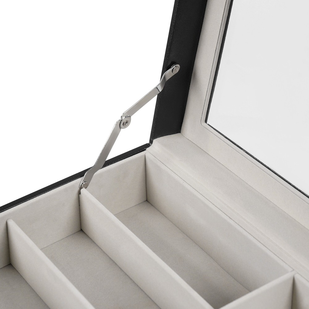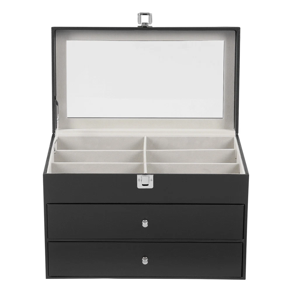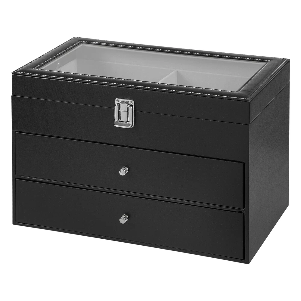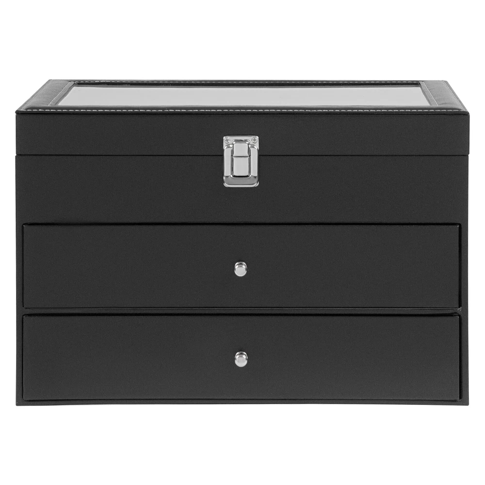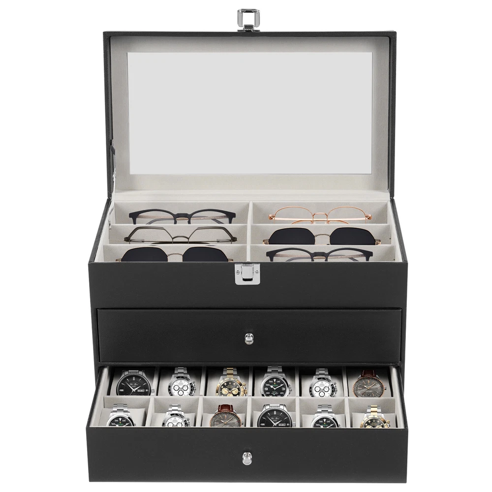 This watch and jewelry organizer is sleek and functional! The soft fleece lining protects my watches, while the clear glass top keeps dust away. The three-tier design saves space and displays everything beautifully. Sturdy construction, easy to assemble, and looks elegant on my dresser. Perfect for keeping my collection organized and visible—love it!
