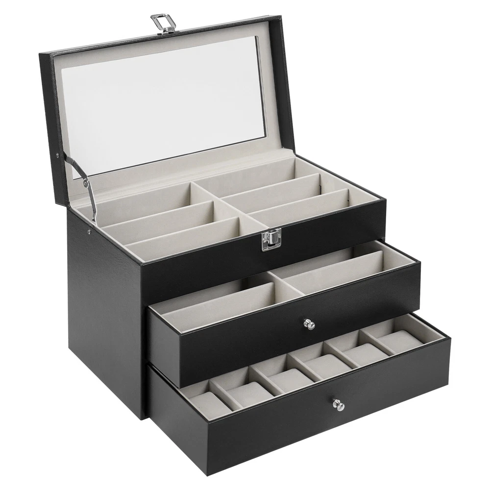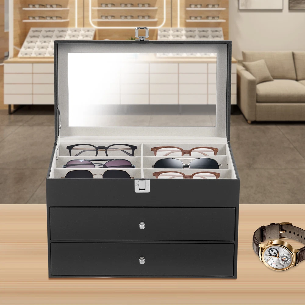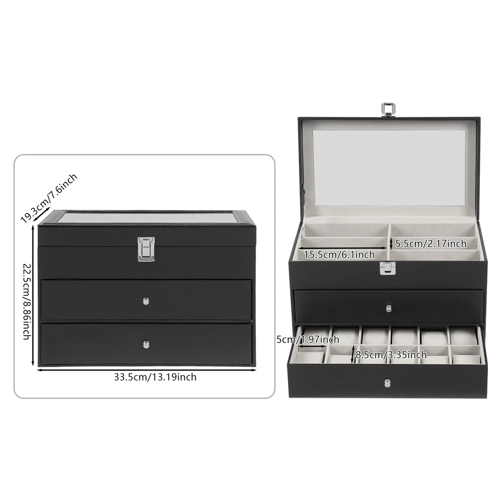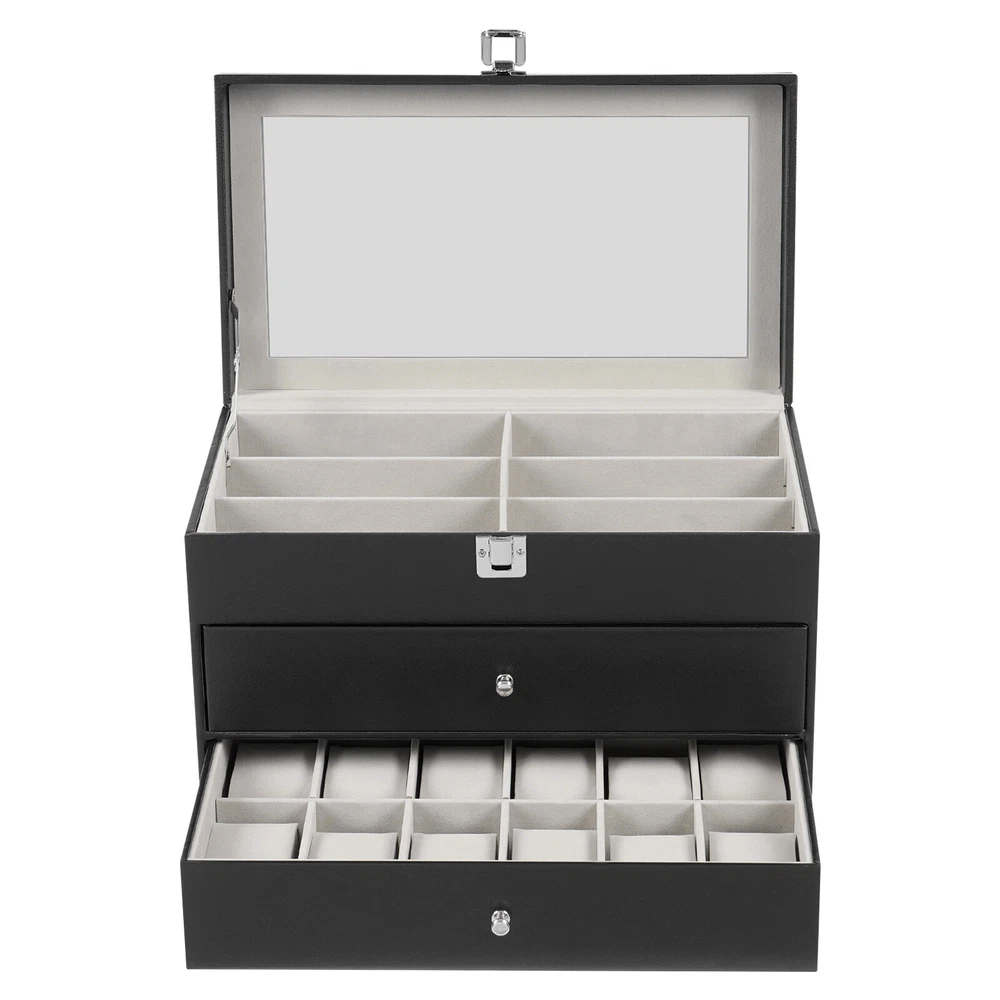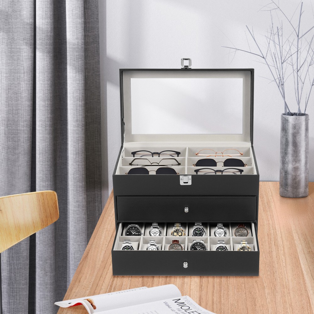 Specification Mount Type: Freestanding, Tabletop Assembly Required: No Number of Tiers: 3 Material: MDF, PU, Glass, Metal, Fleece Process: Edge Wrap Color: Black, Clear, Silver Style: Modern Shape: Rectangle Number of Eyeglasses Compartments: 12 Number of Watches Compartments: 12 Single Glasses Compartment Size (L*W): 15.5*5.5cm/6.1*2.17in Single Watch Compartment Size (L*W): 5*8.5cm/1.97*3.35in Product Size: 33.5*19.3*22.5cm/13.19*7.6*8.86in Package Size: 36*25*25cm/14.17*9.84*9.84in Gross Weight: 4kg/8.82lbs Net Weight: 3.5kg/7.72lbs Package Included 1* Watch Box 24 Slots 3 Layers Watch Box Leather Display Case Organizer Jewelry Storage Box Description This watch box with 24 well-designed compartments (12 compartments for eyeglasses and 12 compartments for watches) brings each of your eyeglasses and watches their own space for excellent storage and display. The drawer design is easy to store and take away, keeping everything organized. It is made of high-class materials to protect your glasses and watches while highlighting your elegant taste, making it ideal for eyeglasses or watch collectors. Key Features Stable and Durable: It is mainly made of high-class MDF and PU, so it is eco-friendly, odorless, anti-corrosion, and rust-resistant , ensuring long-term use. Large-capacity Storage: The box provides 24 independent compartments for storing 12 pairs of glasses and 12 watches, which meets your storage needs for a large number of accessories and keeps things in order. Individual Protection: The inside of each compartment is lined with soft fleece, which effectively prevents glasses and watches from bumping into each other, avoiding scratches and damage. Easy to Access: The box features a clear glass lid on top for easy viewing of the contents, while the metal hinges make it easy for you to open and close the box for daily use and it can support the lid for easy access when you open the product. Dust-proof Design: The closed design helps to block dust from entering and keeps the interior clean and dry, prolonging the life of the accessories. Space Saving: The box adopts a three-tier structure to make full use of space, which saves desktop area (footprint of 13.19*7.6in) and improves storage efficiency. Elegant Appearance: The classic black color, clear lid, silver buckle, drawer handles, and hinges create an elegant and generous atmosphere, adding style to your home. Ideal Gift: Thanks to its practicality, it will make a fine gift for family, friends, and loved ones on Christmas, Father's Day, Mother's Day, birthdays, anniversaries, and holidays. Customer Service: We aim to provide quality products and services. If you have any problems, please feel free to contact us. We will reply and solve the problem for you as soon as possible. Details Metal Lock: The solid buckle provides extra security for the first tier. Smooth Edges: The smooth and burr-free edges enhance the beauty of the product and better care for your skin when cleaning it. Watch Pillow: The soft and supportive pillow keeps your watch in the right shape. Application It can be used to hold glasses, watches, jewelry, rings, bracelets, etc. in stores, homes, checkrooms, and other scenes. It can be a great gift for anniversaries, and graduations, and also ideal for personal collections. Specification Mount Type: Freestanding, Tabletop Assembly Required: No Number of Tiers: 3 Material: MDF, PU, Glass, Metal, Fleece Process: Edge Wrap Color: Black, Clear, Silver Style: Modern Shape: Rectangle Number of Eyeglasses Compartments: 12 Number of Watches Compartments: 12 Single Glasses Compartment Size (L*W): 15.5*5.5cm/6.1*2.17in Single Watch Compartment Size (L*W): 5*8.5cm/1.97*3.35in Product Size: 33.5*19.3*22.5cm/13.19*7.6*8.86in Package Size: 36*25*25cm/14.17*9.84*9.84in Gross Weight: 4kg/8.82lbs Net Weight: 3.5kg/7.72lbs Package Included 1* Watch Box Notes Please check the style and size before purchasing. Please keep it away from moisture. Please wipe it with a soft cloth (not included) for daily care. Please note that this product does not contain glasses, watches, jewelry, and other items as shown in the picture. Please allow the slight color difference caused by the shooting light and 1-3cm error due to manual measurement and make sure you do not mind before ordering. Payment Delivery details Terms of sales About us Contact us Payment We accept ebay payment 。 Fees such as import duties, taxes are not included in the item price or shipping costs. These charges are the buyer's responsibility. Delivery details Shipping: 2-9 working days to: USA Terms of sales We maintain high standards of excellence and strive for hundred percent customer satisfaction. Feedback is very important to us. We hope that you contact us immediately before you give neutral or negative feedback, so that we can address your concerns. It is impossible to address issues if we do not know about them! About us Your satis faction is our ultimate goal. We work hard to earn your trust and future business. Our certified technicians have tested each item before shipping. The unit comes with 1 year limited warranty on all manufacturing defects. a) If you receive a defective item, you may return it or ask for a discount. Please contact us within 14 days after you receive the package. b) What you returned must be intact and in its original packaging as re? u. Customer is responsible for shipping costs of the returned item. c) We will cover the cost of shipping back t with the shipping rate indicated in the registration page. We will send you a new unit or refund the full payment you paid. Thank you. Contact us Business Hour Business Hour: Monday To Friday: 8:30 AM to 5:00 PM (Beijing China time) Due to time zones, our reply to your questions may not be immediately. But within above working time, we will reply your email within 24 hours. If it's non-workdays, please kindly be patient and wait till Monday. Please contact us with ebay message. Please feel free to contac
