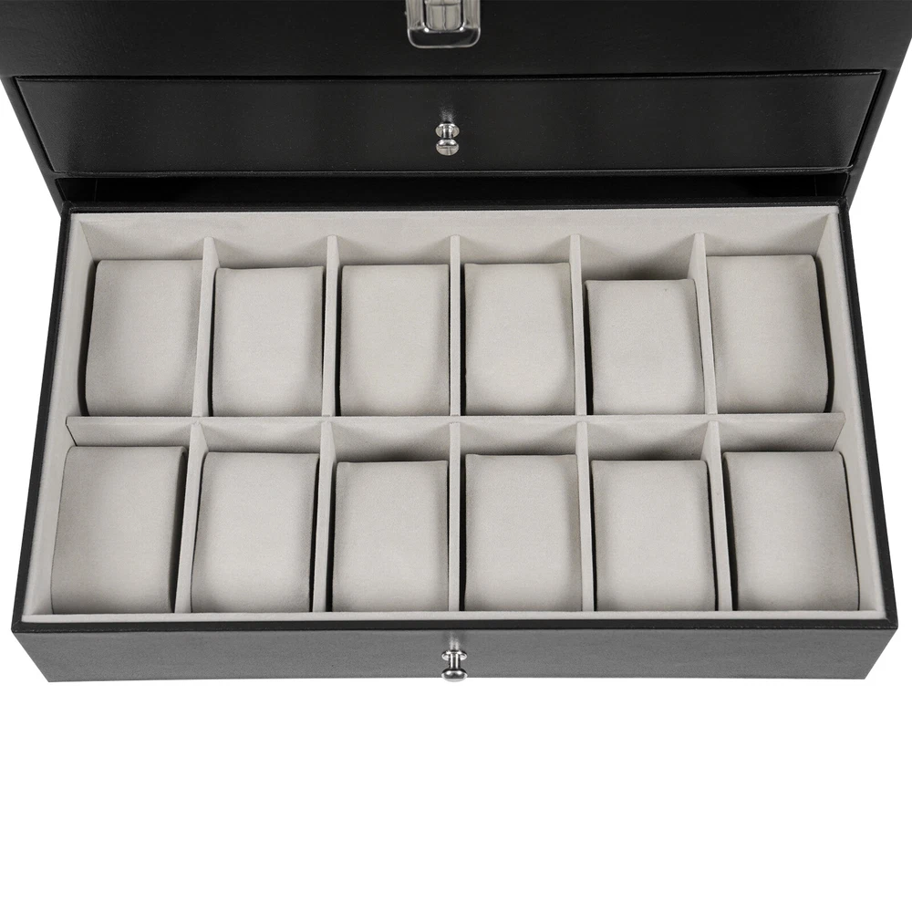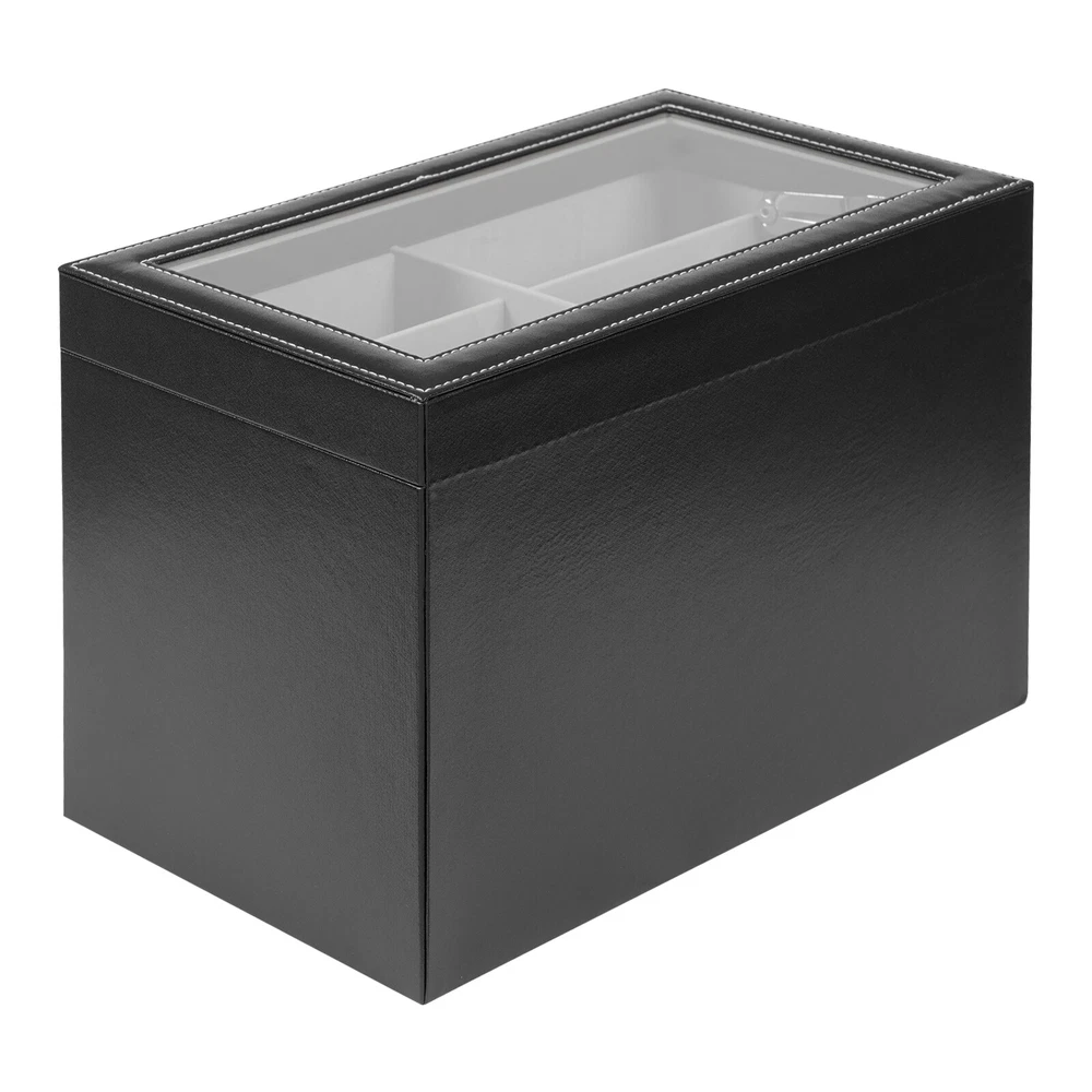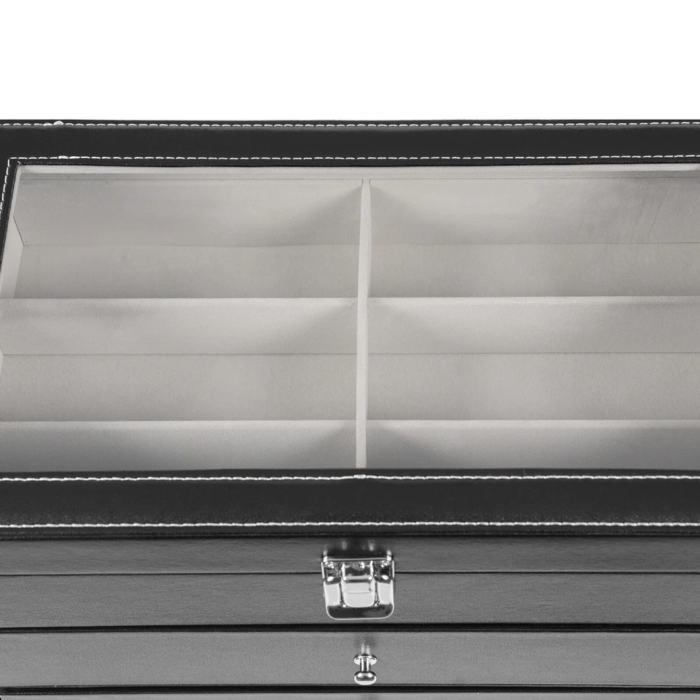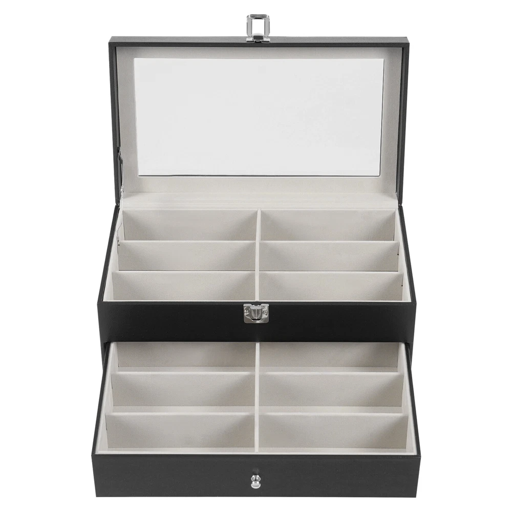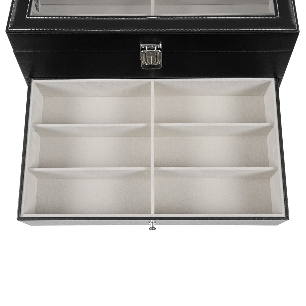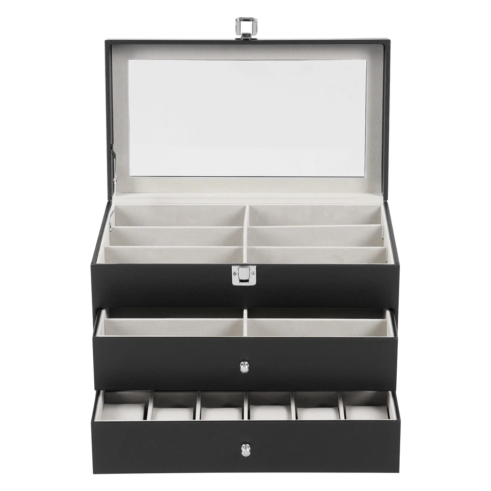 Specification Mount Type: Freestanding, Tabletop Assembly Required: No Number of Tiers: 3 Material: MDF, PU, Glass, Metal, Fleece Process: Edge Wrap Color: Black, Clear, Silver Style: Modern Shape: Rectangle Number of Eyeglasses Compartments: 12 Number of Watches Compartments: 12 Single Glasses Compartment Size (L*W): 15.5*5.5cm/6.1*2.17in Single Watch Compartment Size (L*W): 5*8.5cm/1.97*3.35in Product Size: 33.5*19.3*22.5cm/13.19*7.6*8.86in Package Size: 36*25*25cm/14.17*9.84*9.84in Gross Weight: 4kg/8.82lbs Net Weight: 3.5kg/7.72lbs Package Included 1* Watch Box 24 Slots 3 Layers Watch Box Leather Display Case Organizer Jewelry Storage Box Description This watch box with 24 well-designed compartments (12 compartments for eyeglasses and 12 compartments for watches) brings each of your eyeglasses and watches their own space for excellent storage and display. The drawer design is easy to store and take away, keeping everything organized. It is made of high-class materials to protect your glasses and watches while highlighting your elegant taste, making it ideal for eyeglasses or watch collectors. Key Features Stable and Durable: It is mainly made of high-class MDF and PU, so it is eco-friendly, odorless, anti-corrosion, and rust-resistant , ensuring long-term use. Large-capacity Storage: The box provides 24 independent compartments for storing 12 pairs of glasses and 12 watches, which meets your storage needs for a large number of accessories and keeps things in order. Individual Protection: The inside of each compartment is lined with soft fleece, which effectively prevents glasses and watches from bumping into each other, avoiding scratches and damage. Easy to Access: The box features a clear glass lid on top for easy viewing of the contents, while the metal hinges make it easy for you to open and close the box for daily use and it can support the lid for easy access when you open the product. Dust-proof Design: The closed design helps to block dust from entering and keeps the interior clean and dry, prolonging the life of the accessories. Space Saving: The box adopts a three-tier structure to make full use of space, which saves desktop area (footprint of 13.19*7.6in) and improves storage efficiency. Elegant Appearance: The classic black color, clear lid, silver buckle, drawer handles, and hinges create an elegant and generous atmosphere, adding style to your home. Ideal Gift: Thanks to its practicality, it will make a fine gift for family, friends, and loved ones on Christmas, Father's Day, Mother's Day, birthdays, anniversaries, and holidays. Customer Service: We aim to provide quality products and services. If you have any problems, please feel free to contact us. We will reply and solve the problem for you as soon as possible. Details Metal Lock: The solid buckle provides extra security for the first tier. Smooth Edges: The smooth and burr-free edges enhance the beauty of the product and better care for your skin when cleaning it. Watch Pillow: The soft and supportive pillow keeps your watch in the right shape. Application It can be used to hold glasses, watches, jewelry, rings, bracelets, etc. in stores, homes, checkrooms, and other scenes. It can be a great gift for anniversaries, and graduations, and also ideal for personal collections. Specification Mount Type: Freestanding, Tabletop Assembly Required: No Number of Tiers: 3 Material: MDF, PU, Glass, Metal, Fleece Process: Edge Wrap Color: Black, Clear, Silver Style: Modern Shape: Rectangle Number of Eyeglasses Compartments: 12 Number of Watches Compartments: 12 Single Glasses Compartment Size (L*W): 15.5*5.5cm/6.1*2.17in Single Watch Compartment Size (L*W): 5*8.5cm/1.97*3.35in Product Size: 33.5*19.3*22.5cm/13.19*7.6*8.86in Package Size: 36*25*25cm/14.17*9.84*9.84in Gross Weight: 4kg/8.82lbs Net Weight: 3.5kg/7.72lbs Package Included 1* Watch Box Notes Please check the style and size before purchasing. Please keep it away from moisture. Please wipe it with a soft cloth (not included) for daily care. Please note that this product does not contain glasses, watches, jewelry, and other items as shown in the picture. Please allow the slight color difference caused by the shooting light and 1-3cm error due to manual measurement and make sure you do not mind before ordering. Payment Delivery details Terms of sales About us Contact us Payment We accept ebay payment 。 Fees such as import duties, taxes are not included in the item price or shipping costs. These charges are the buyer's responsibility. Delivery details Shipping: 2-9 working days to: USA Terms of sales We maintain high standards of excellence and strive for hundred percent customer satisfaction. Feedback is very important to us. We hope that you contact us immediately before you give neutral or negative feedback, so that we can address your concerns. It is impossible to address issues if we do not know about them! About us Your satis faction is our ultimate goal. We work hard to earn your trust and future business. Our certified technicians have tested each item before shipping. The unit comes with 1 year limited warranty on all manufacturing defects. a) If you receive a defective item, you may return it or ask for a discount. Please contact us within 14 days after you receive the package. b) What you returned must be intact and in its original packaging as re? u. Customer is responsible for shipping costs of the returned item. c) We will cover the cost of shipping back t with the shipping rate indicated in the registration page. We will send you a new unit or refund the full payment you paid. Thank you. Contact us Business Hour Business Hour: Monday To Friday: 8:30 AM to 5:00 PM (Beijing China time) Due to time zones, our reply to your questions may not be immediately. But within above working time, we will reply your email within 24 hours. If it's non-workdays, please kindly be patient and wait till Monday. Please contact us with ebay message. Please feel free to contac