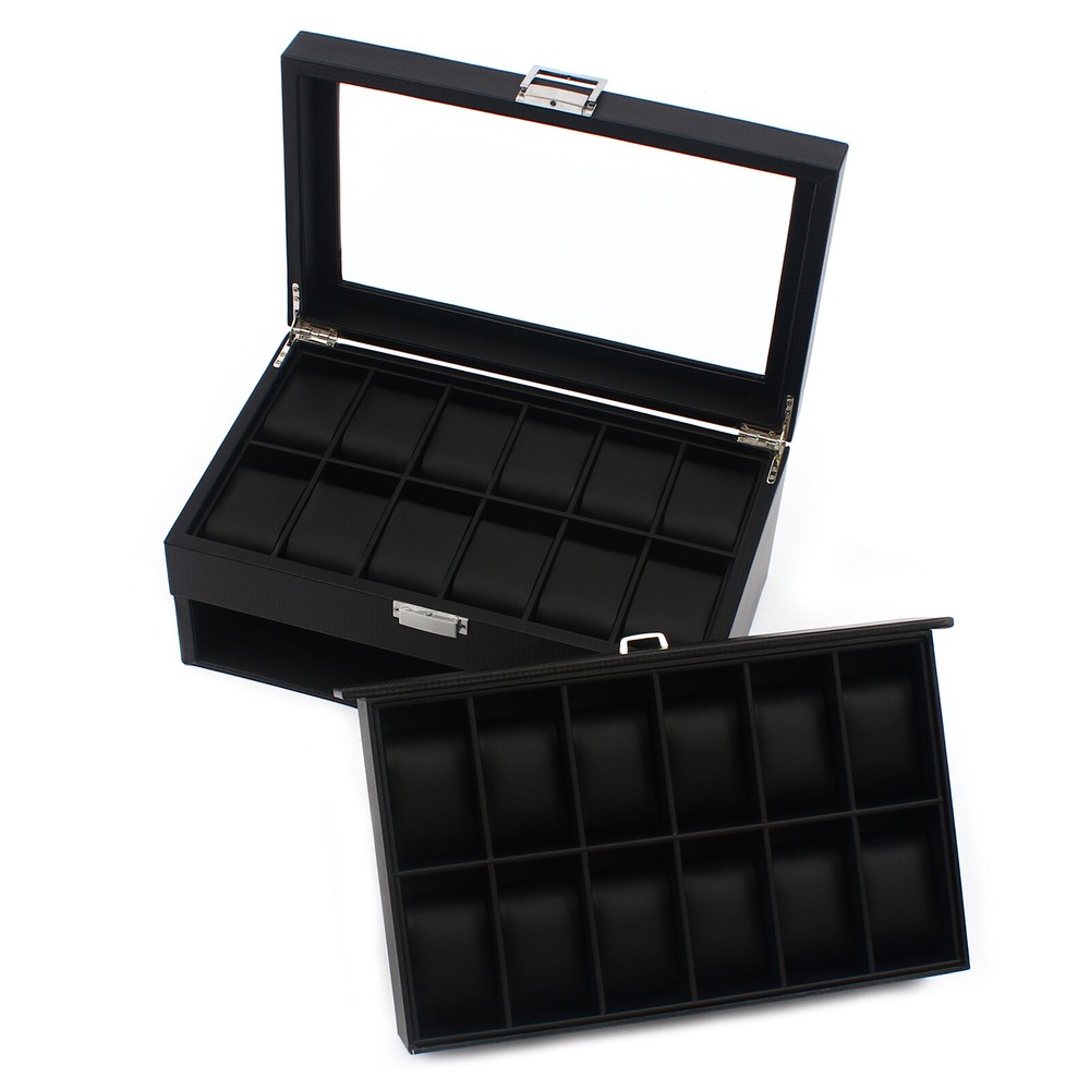 Specification Color: Black Material: Wood, Carbon Fiber, Glass, Zinc Alloy Pillow Inner Material: Plastic Number of Compartments: 24 Shape: Rectangular Mounting Type: Freestanding Closure Type: Electroplated Latch Number of Drawers: 1 Net Weight: 3.4kg/7.5lbs Package Weight: 3.7kg/8.1lbs Product Size: 34*21*14.8cm/13.4*8.3*5.8inch Package Size: 34.5*23.5*17.5cm/13.5*9.2*6.8inch Package Included 1* Watch Box Notes Please allow the slight color difference caused by the shooting light and 1-3cm error due to manual measurement, and make sure you do not mind before ordering. 24 Slot Men Watch Display Case Large Jewelry Organizer Box Luxury Storage Holder Description~~ Watch Box 24 Mens Case Glass Top Black and Display Organizer Lockable Description The watch box is made of high-quality wood, carbon fiber, glass, plastic, and zinc alloy, which is strong, durable, and not easy to deform. It has two layers with a total of 24 compartments and a lot of storage space, which can meet your daily storage needs. Specification Color: Black Material: Wood, Carbon Fiber, Glass, Zinc Alloy Pillow Inner Material: Plastic Number of Compartments: 24 Shape: Rectangular Mounting Type: Freestanding Closure Type: Electroplated Latch Number of Drawers: 1 Net Weight: 3.4kg/7.5lbs Package Weight: 3.7kg/8.1lbs Product Size: 34*21*14.8cm/13.4*8.3*5.8inch Package Size: 34.5*23.5*17.5cm/13.5*9.2*6.8inch Package Included 1* Watch Box Details Exquisite Workmanship: This is a carefully crafted watch box. The premium carbon fiber grain and fine workmanship give it a luxurious texture. Dust-proof Design: The top lid and drawer can prevent dust from entering, which can keep the interior clean to save you a lot of cleaning time. High Light-transmitting Glass: The high light-transmitting glass at the top of the watch box provides a clear view of the watch's storage position and also allows for a better display of your watches. So you can easily find the watch you want. Good Materials: The watch box is made of high-quality wood, carbon fiber, glass, plastic, and zinc alloy, which is strong, durable, and not easy to deform. Good materials can extend its service life. Delicate Designed Pillow: The surface of the pillow is made of soft carbon fiber, which is anti-slipe and comfortable to touch so that the watch is better cared for. Compartment Design: This watch box has 2 layers of compartments for classified storage. This can make the space neater. You can easily find the watch, bracelet, necklace, earring, ring, and brooch you want. Large Storage Space: This product has two layers with a total of 24 compartments and a lot of storage space, which can meet your daily storage needs. Versatile: This product can be used to store not only watches in the first layer but also other items inside the second one. It is versatile and can meet your daily needs. Beautiful Appearance: The luxurious black casing with silver locking clasp gives the box a stylish, classic look. The black lining shows off the luster of your watch even better. A Good Gift: This watch box is an ideal gift for your mom, wife, husband, daughter, or girlfriend. It will be a practical and memorable gift. Key Features A Handle: There is a handle on the outside of the drawer for easier opening and closing. Electroplated Latch: The electroplated latch can prevent corrosion and rust, so it's durable. You can use it for a longer time. Guaranteed Customer Service: We aim to provide quality products and services. If you have problems, please feel free to contact us. We will reply and solve the problem for you as soon as possible. Application: It can be used to store watches, bracelets, necklaces, earrings, rings, brooches, and other accessories . It is also a great gift for your mom, wife, husband, daughter, or girlfriend. Notes Please allow the slight color difference caused by the shooting light and 1-3cm error due to manual measurement, and make sure you do not mind before ordering. tu1 Payment Delivery details Terms of sales About us Contact us Payment We accept ebay payment 。 Fees such as import duties, taxes are not included in the item price or shipping costs. These charges are the buyer's responsibility. Delivery details Shipping: 2-9 working days to: USA Terms of sales We maintain high standards of excellence and strive for hundred percent customer satisfaction. Feedback is very important to us. We hope that you contact us immediately before you give neutral or negative feedback, so that we can address your concerns. It is impossible to address issues if we do not know about them! About us Your satis faction is our ultimate goal. We work hard to earn your trust and future business. Our certified technicians have tested each item before shipping. The unit comes with 1 year limited warranty on all manufacturing defects. a) If you receive a defective item, you may return it or ask for a discount. Please contact us within 14 days after you receive the package. b) What you returned must be intact and in its original packaging as re? u. Customer is responsible for shipping costs of the returned item. c) We will cover the cost of shipping back t with the shipping rate indicated in the registration page. We will send you a new unit or refund the full payment you paid. Thank you. Contact us Business Hour Business Hour: Monday To Friday: 8:30 AM to 5:00 PM (Beijing China time) Due to time zones, our reply to your questions may not be immediately. But within above working time, we will reply your email within 24 hours. If it's non-workdays, please kindly be patient and wait till Monday. Please contact us with ebay message. Please feel free to contact us if you have any questions. Monday To Friday: 8:30 AM to 5:00 PM (Beijing China time) Due to time zones, our reply to your questions may not be immediately. But within above working time, we will reply your email within 24 hours. If it's non-workdays, please kindly be patient and wait till Monday. Please contact us with ebay mess