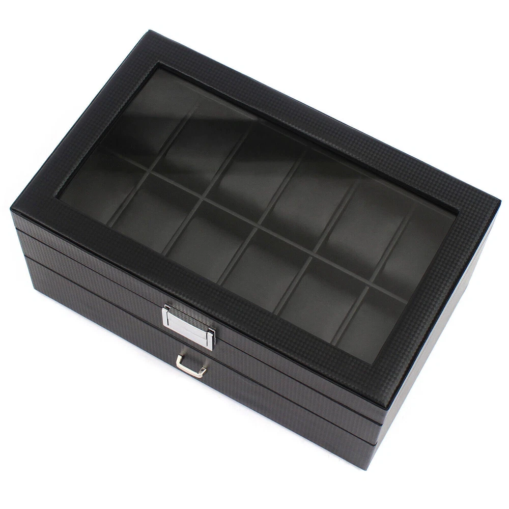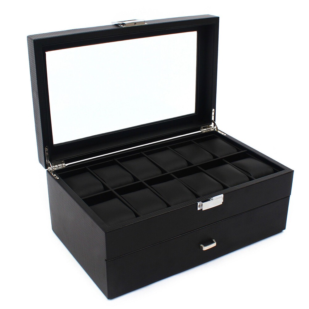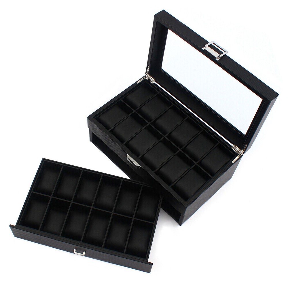 💖High Quality & Fast Shipping💖 24 Slots Men Watch Storage Box Large Jewelry Display Case Organizer Holder Black Description The watch box is made of high-quality wood, carbon fiber, glass, plastic, and zinc alloy, which is strong, durable, and not easy to deform. It has two layers with a total of 24 compartments and a lot of storage space, which can meet your daily storage needs. Specification Color: Black Material: Wood, Carbon Fiber, Glass, Zinc Alloy Pillow Inner Material: Plastic Number of Compartments: 24 Shape: Rectangular Mounting Type: Freestanding Closure Type: Electroplated Latch Number of Drawers: 1 Net Weight: 3.4kg/7.5lbs Package Weight: 3.7kg/8.1lbs Product Size: 34*21*14.8cm/13.4*8.3*5.8inch Package Size: 34.5*23.5*17.5cm/13.5*9.2*6.8inch Package Included 1* Watch Box Details Exquisite Workmanship: This is a carefully crafted watch box. The premium carbon fiber grain and fine workmanship give it a luxurious texture. Dust-proof Design: The top lid and drawer can prevent dust from entering, which can keep the interior clean to save you a lot of cleaning time. High Light-transmitting Glass: The high light-transmitting glass at the top of the watch box provides a clear view of the watch's storage position and also allows for a better display of your watches. So you can easily find the watch you want. Good Materials: The watch box is made of high-quality wood, carbon fiber, glass, plastic, and zinc alloy, which is strong, durable, and not easy to deform. Good materials can extend its service life. Delicate Designed Pillow: The surface of the pillow is made of soft carbon fiber, which is anti-slipe and comfortable to touch so that the watch is better cared for. Compartment Design: This watch box has 2 layers of compartments for classified storage. This can make the space neater. You can easily find the watch, bracelet, necklace, earring, ring, and brooch you want. Large Storage Space: This product has two layers with a total of 24 compartments and a lot of storage space, which can meet your daily storage needs. Versatile: This product can be used to store not only watches in the first layer but also other items inside the second one. It is versatile and can meet your daily needs. Beautiful Appearance: The luxurious black casing with silver locking clasp gives the box a stylish, classic look. The black lining shows off the luster of your watch even better. A Good Gift: This watch box is an ideal gift for your mom, wife, husband, daughter, or girlfriend. It will be a practical and memorable gift. Key Features A Handle: There is a handle on the outside of the drawer for easier opening and closing. Electroplated Latch: The electroplated latch can prevent corrosion and rust, so it's durable. You can use it for a longer time. Guaranteed Customer Service: We aim to provide quality products and services. If you have problems, please feel free to contact us. We will reply and solve the problem for you as soon as possible. Application: It can be used to store watches, bracelets, necklaces, earrings, rings, brooches, and other accessories . It is also a great gift for your mom, wife, husband, daughter, or girlfriend. Notes Please allow the slight color difference caused by the shooting light and 1-3cm error due to manual measurement, and make sure you do not mind before ordering. Payment Delivery details Terms of sales About us Contact us Payment We accept ebay payment 。 Fees such as import duties, taxes are not included in the item price or shipping costs. These charges are the buyer's responsibility. Delivery details Shipping: 2-9 working days to: USA Terms of sales We maintain high standards of excellence and strive for hundred percent customer satisfaction. Feedback is very important to us. We hope that you contact us immediately before you give neutral or negative feedback, so that we can address your concerns. It is impossible to address issues if we do not know about them! About us Your satis faction is our ultimate goal. We work hard to earn your trust and future business. Our certified technicians have tested each item before shipping. The unit comes with 1 year limited warranty on all manufacturing defects. a) If you receive a defective item, you may return it or ask for a discount. Please contact us within 14 days after you receive the package. b) What you returned must be intact and in its original packaging as re? u. Customer is responsible for shipping costs of the returned item. c) We will cover the cost of shipping back t with the shipping rate indicated in the registration page. We will send you a new unit or refund the full payment you paid. Thank you. Contact us Business Hour Business Hour: Monday To Friday: 8:30 AM to 5:00 PM (Beijing China time) Due to time zones, our reply to your questions may not be immediately. But within above working time, we will reply your email within 24 hours. If it's non-workdays, please kindly be patient and wait till Monday. Please contact us with ebay message. Please feel free to contact us if you have any questions. Monday To Friday: 8:30 AM to 5:00 PM (Beijing China time) Due to time zones, our reply to your questions may not be immediately. But within above working time, we will reply your email within 24 hours. If it's non-workdays, please kindly be patient and wait till Monday. Please contact us with ebay message. Please feel free to contact us if you have any questions.