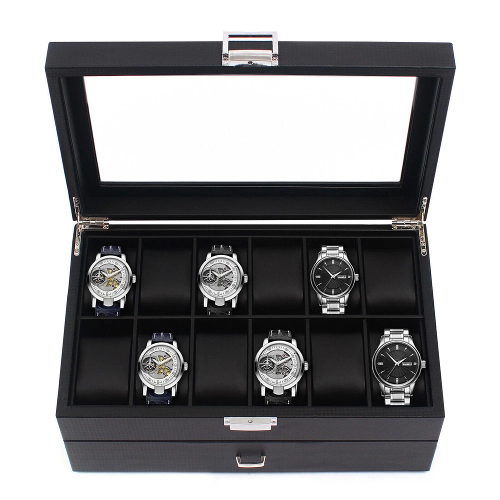 This watch box is a game-changer! The sleek black design looks premium, and the sturdy wood and carbon fiber construction keeps my watches safe. Love the 24 slots—plenty of space for my collection, and the soft pillows hold everything snugly. Super fast shipping too! Highly recommend for any watch enthusiast needing stylish, high-quality storage.