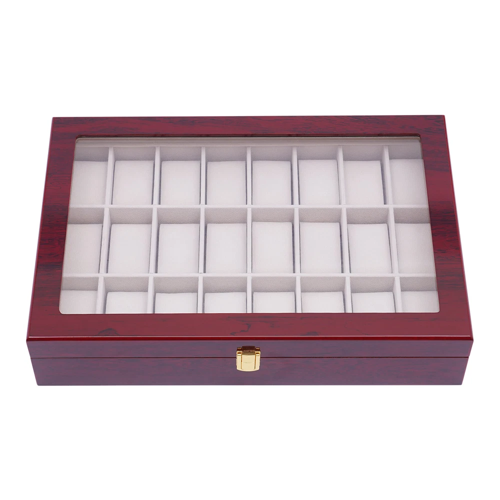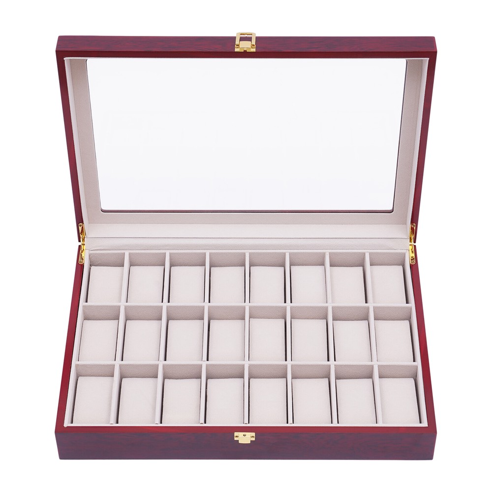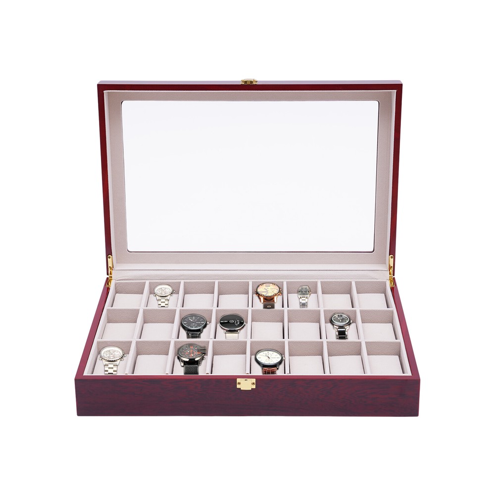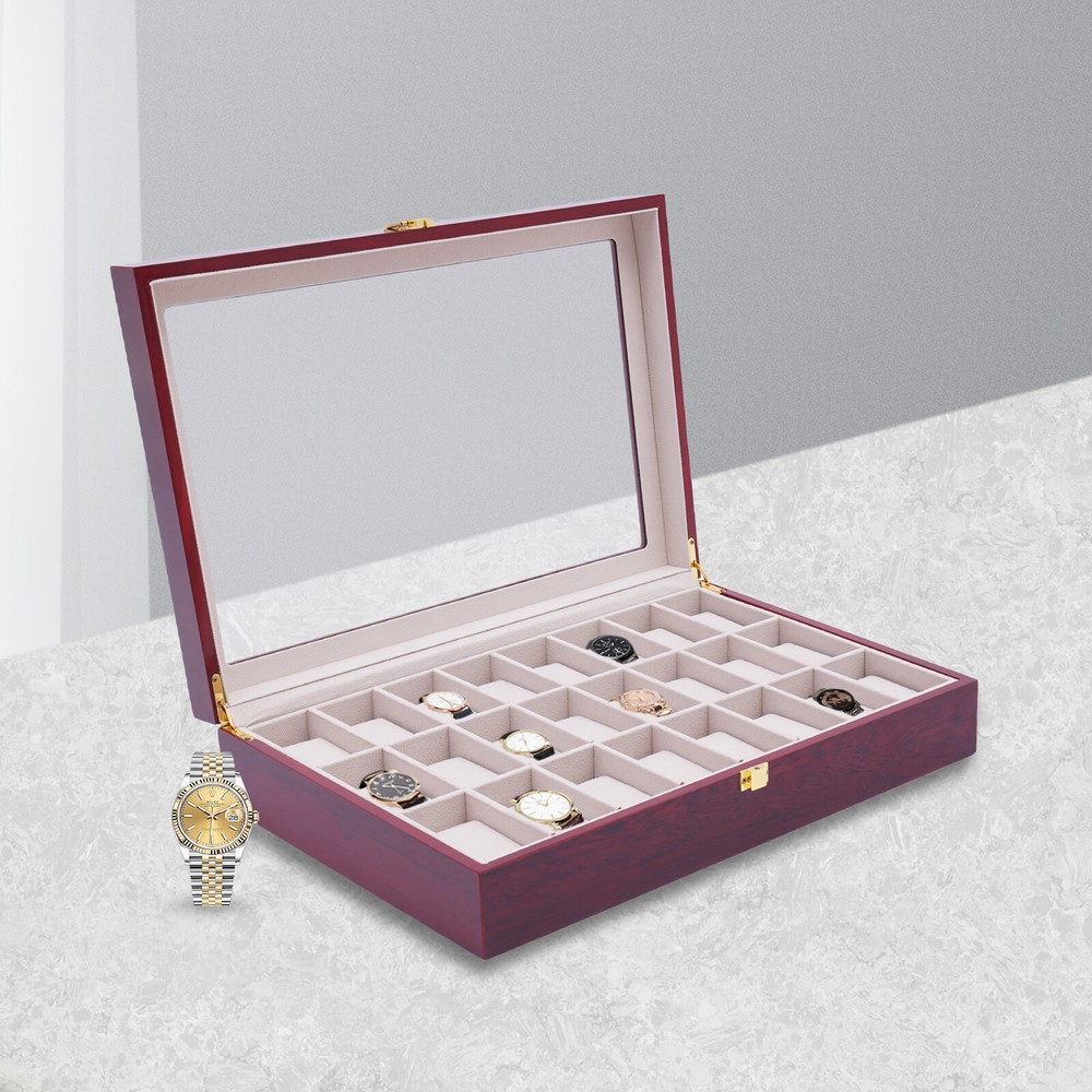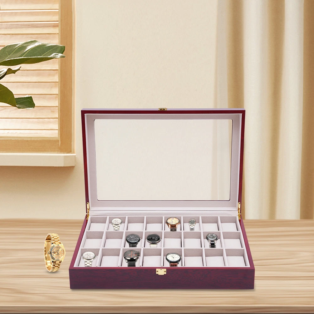 Love this watch box! The sleek wooden design with glass top looks elegant on my dresser. Fits all 24 of my watches securely with soft flannelette lining—no scratches! The lock keeps them safe, and the quality feels premium. Super fast shipping too—highly recommend for any watch collector!