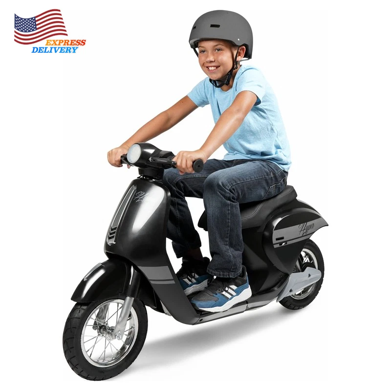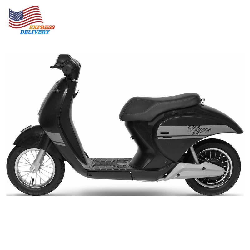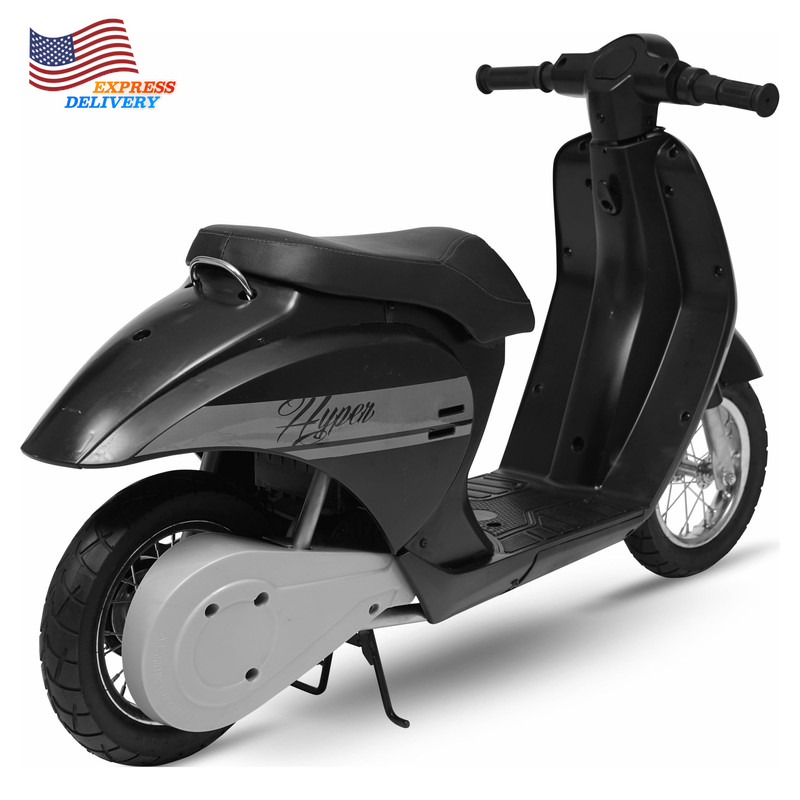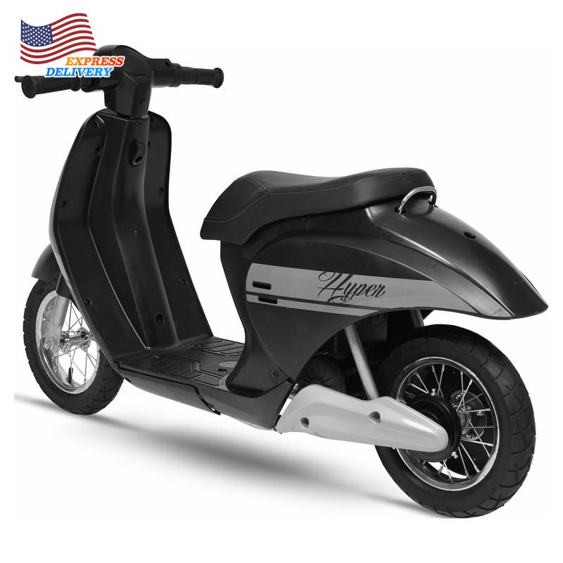 24V Retro Scooter Powered Ride-On with Easy Twist Throttle for Kids Check out this vintage inspired 24 Volt Hyper Retro Scooter, Black, Battery Powered Electric Scooter made by Hyper Toys! This is a high performance electric powered scooter with a 24 volt lead acid battery included. Keep your favorite things in the secret storage compartment under the seat. With an easy twist throttle, you can be cruising up to 14 MPH on this fun ride! Vintage Inspired Scooter 24 volts of fun Easy Twist Throttle Max Speed of 14 MPH, forward only Ages 13 + Charge battery 12 hrs before first use Max rider weight : 170 lbs