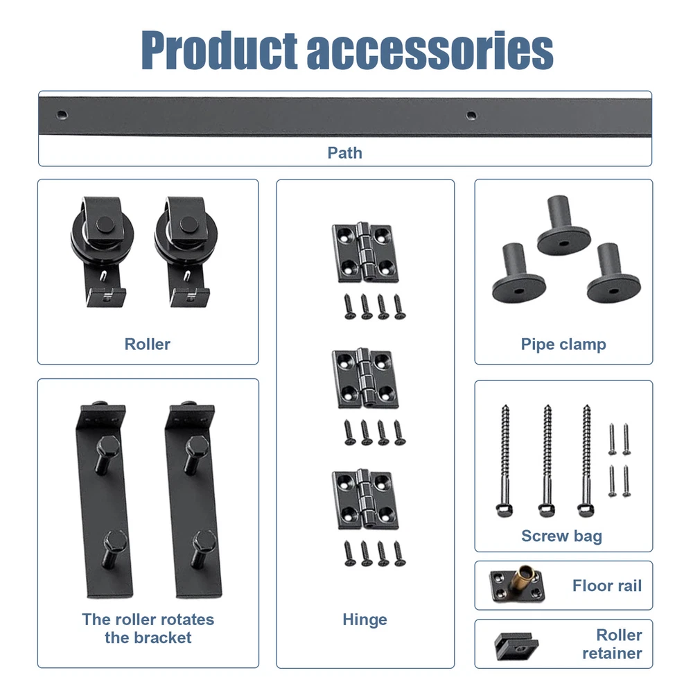 Store category Sign Up Now ! You may also like Product Description Bullet Points: Enhanced Safety: With a smart and safe design, our Barn Door Hardware provides a bestly wide range of application. It folds into any home decor seamlessly, saving space while ensuring child safety. Long-Lasting Performance: Featuring wear-resistant nylon wheels rollers and robust carbon steel, our barn door hardware promises long-lasting strength and a smooth sliding motion. Time-Saving Convenience: Our barn door hardware kit ensures an easy and intuitive setup that saves time and effort. With detailed instructions and pictures, installation is a breeze. Total width allows for an effortless bi-fold sliding door setup. Suit Your Unique Style: Get the perfect solution for any barn door with our hardware set. Accommodates 35mm-45mm thickness and suits all preferences. All accessories included, door not supplied. Widely Applied: Achieve an innovative living experience by installing this barn door hardware, perfectly suited for your living rooms, study rooms, and bedrooms. The soundless and effortless glide enables an easy flow of movement while effortlessly supporting heavyweights. Upgrade the look of your space with our Bi-Fold Sliding Barn Door Kit. It's perfect for a wide range of applications and can be customized to your preferences. The nylon wheels rollers ensure smooth and silent operation, while the load-bearing capacity can accommodate even the heaviest doors. Specification: Name: Barn Door Hardware Colour: Black Material: Carbon steel Track Size: about 24 inches/61cm Track Splicing Method: 2 pieces Scope of Application: Door panel thickness 0.5-50mm Packing List: 2* Track 2* Scroll Wheel 2* Roller Swivel Stand 1* Roller Holder 3* Spacers 3* Hinge 1* Floor Rail 1* Sealing Strip 1* Screw Pack 1* Instruction Manual 3* Pipe Clamp 35mm 3* Wood Screws M8*90 4* External Hexagonal Machine Wire M10*60 4* Cover M10 Notes: 1. Due to the different monitor and light effects, the actual color of the item might be slightly different from the color which is showed in the pictures. 2. Please forgive a slight measuring deviation due to manual measurement. 3. Door is not included. Payment Delivery details Terms of sales About us Feedback & DSRs Shipping 1. We only ship to United States 2. Delivery Time: Ship from US via FedEx Ground or FedEx Home Delivery 1-5 business days with tracking number. 3. We ship the item out in 24-72 hours after received the payment.(Mon-Fri) 4. If you want to chose another address, please leave us a message on ebay.Please check your shipping address carefully before checkout,it can't be changed if order completed. Seriously promise:Refund or resend will be offered if item still not arrive in 7-10 business days. Just send us an email,we will give you a satisfied solution as soon as possible. Payment 1. We accept PayPal only. 2. After you have won the auction, an email will be sent to your eBay registered email address. 3. If you are paying through Paypal using eCheck, note that your item can be shipped only after eCheck has cleared. 4. All payments are expected within 7 days after the last winning auction is closed. A non-payment dispute will be opened if full payment is not received. 5. We only ship the item to your Paypal address for fast and accurate shipment. If you want to change the address, please add a note when you make the payment. after you have paid. Return & Warranty 1. For your best shopping experience in our store and saving your time .Please Do Not click "Return this item" except that you just don't need it any more.Because no return request is our company's Service. Please click "Contact seller" via Ebay Message(protected by Ebay),that is the fastest way to solve any problem for you.You will get the replacement or refund through the communication between us. 2. We fully guarantee Customers benefit within 14 business days if item DOA (damage on arrival), and please contact us within 30 days from the delivery date to exchange or refund.No need return just contact us. Refunds will be given via paypal only. 3. For malfunction products under warranty period, please contact our customer service via EBay Message. Replacements will be sent once after we have a fully communication.No need return the original one after we have fully communication. 4. The buyer has an obligation to cooperate with seller to verify defective item. If you want return, please double check if the item does not work or you just don't need it any more. If the item defective or no work, no need return. 5. All NON-Seller Mistake returns for refund are subject to 20% re-stocking fee and buyer should pay for the return shipping fee and handle fee.(For example,you brought wrong item or cancelled order after item was shipped). 6. A Merchandise Authorization Number (RMA#) is required for all need returned packages(After we have a fully communication). Please contact us to get an "RMA" number before you ship your items back to us. Items returned without an "RMA" number would be ignored or delayed in processing.Returns/Exchanges will not be accepted unless authorization has been issued by our customer service. 7. All return products should be in original package with all accessories included. Contact US Dear buyers, Welcome to our store! Your satisfaction is our top goal,we appreciate your business. 1. If you have any questions, please feel free to contact with us by ebay Message during our business hours ( 9:30a.m. to 5:30 p.m.), or email us through eBay, we will try our best to help you to resolve it. 2. If you are satisfied with our service, please rate the details of the transaction (Detailed Seller Ratings) on eBay and We will do the same for you. 3. If you are not satisfied with the product or service ,please contact us before leave negative or natural feedback, we will try our best to solve the issue to your satisfaction, thanks. Thanks for your patronizing, good luck !!