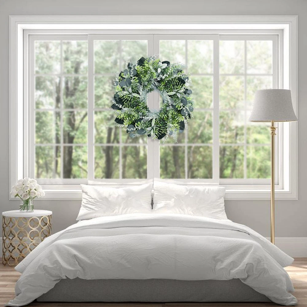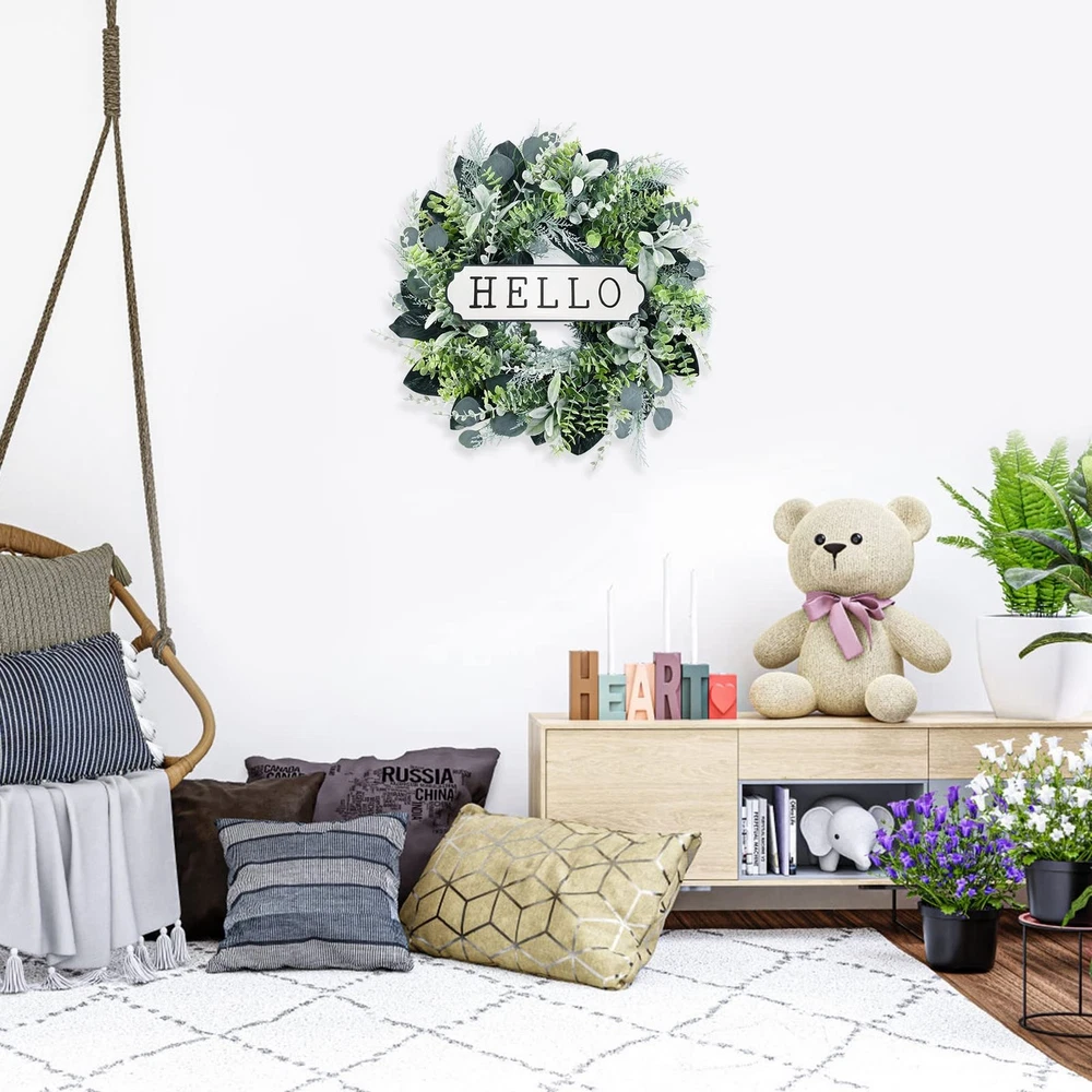 Front Door Wreath. The boxwood wreath works as indoor wreath, outdoor wreath, wedding wreath, welcome wreath, etc. It’s also suitable for sitting room, hotel, wedding scene, window, villa and wall decoration, photography background, etc. This Green wreath will bring an enjoyable ambiance all year round. Handmade Greenery Wreath. This artificial eucalyptus wreath for front door is made by hand. The eucalyptus leaves are made of silk cloth, and the boxwood, cypress, birch, lambs ear leaves are made of plastic. The back of the wreath is a natural grapevine wreath with built-in hook for easy hanging. The hello sign can be removed from the wreath. Spring Summer Wreath Size and Material. The front door wreath is 24'' and made from quality plastic and cloth, waterproof and UV protection, no maintenance, no trimming. Wipe clean with a soft damp cloth if needed. Works once you take it out of the box. You only need to adjust leaves to get a vivid appearance. Maintenance-Free. Artificial green leaves wreath always stays color and shape, and will look great for years to come. You can blow it with a hair dryer to make the wreath as bright as new. Suggest indoor use. If works outdoor, please try to avoid rain and snow. Note. Because the door wreath may be squeezed during transportation, they need to be re-shaped once removed from the box, to achieve their intended appearance and size. It is recommended to use after ventilation. Please don't hesitate to tell us if you have any concerns, and we will slove it in your favor.