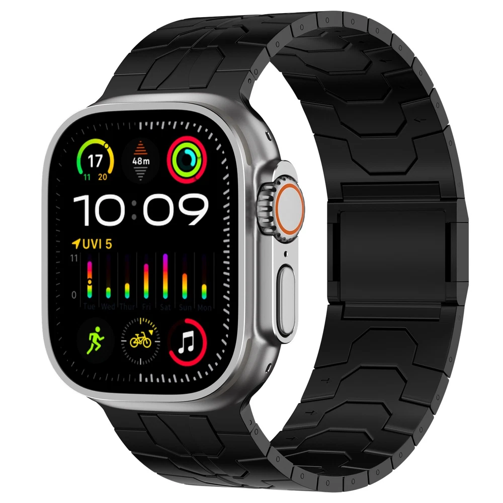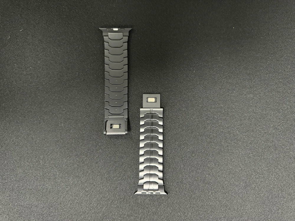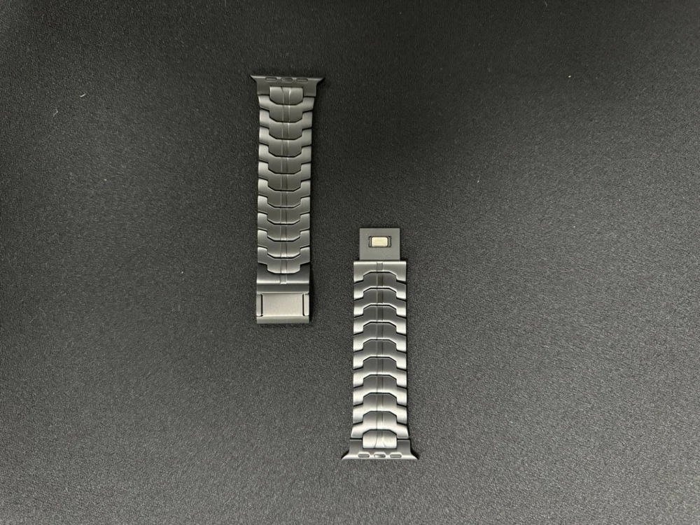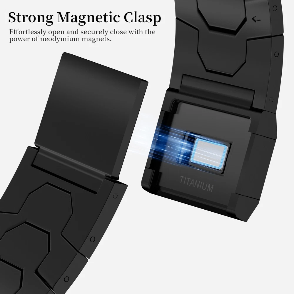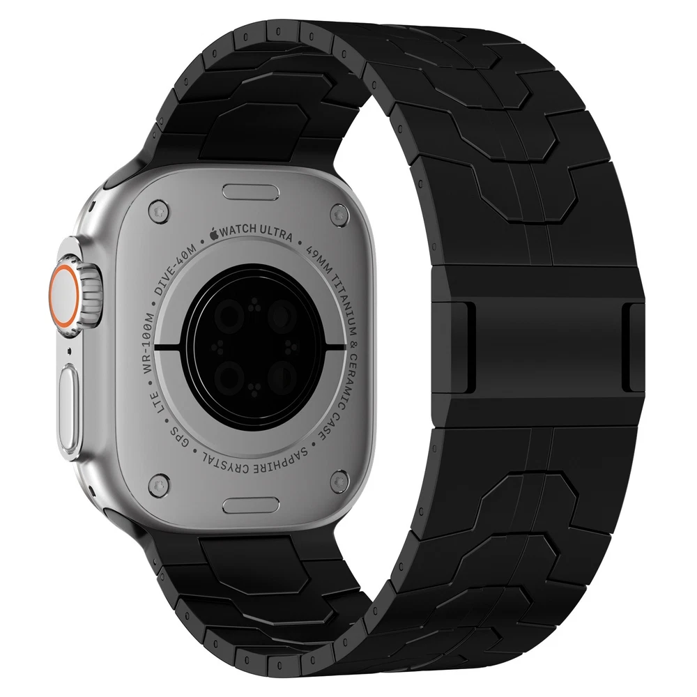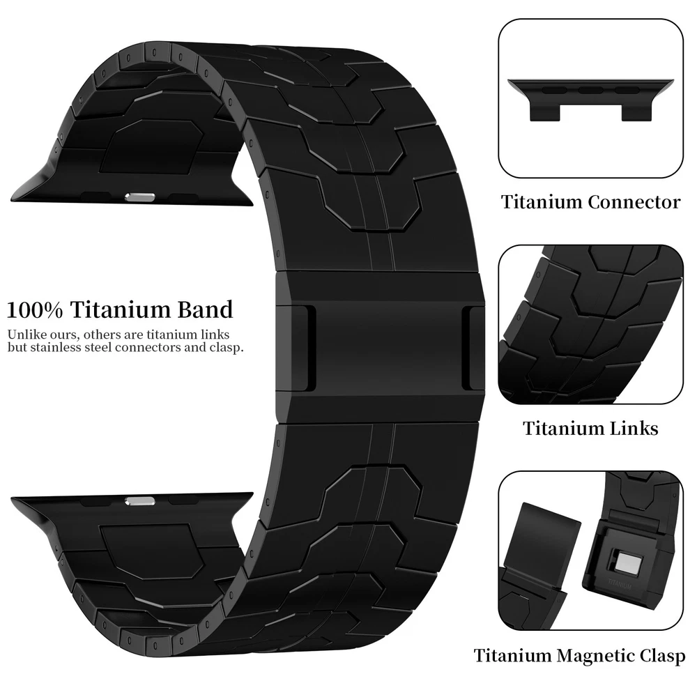 Specification Color Black Special Features Full titanium;DLC Coating Compatibility For Apple Watch Ultra 49mm / Series 10 46mm / Series 9 8 7 45mm / Series 6 5 4 SE2 SE 44mm Clasp Titanium Magnetic Clasp Connector Titanium Connector Titanium Grade Titanium Grade 2 Herring 800+HV Band Width 24mm Band Weight 57g(max) Band Thickness 2.8mm Band Length 210mm Clasp Thickness 5.5mm Wrist Size 150mm to 234mm Feature Lightweight;Corrosion-Resistant;Anti-Allergy Included Components Titanium watch band Warn tips: If you have specific requirements on packaging and components such as minor adjustment links、removal tool、tool pins and instruction, please contact online customer service. Product Description Full Titanium Band VS Titanium Band: All components include links, magnetic clasp, and connectors are crafted from titanium material, setting our bands apart from others with clasps and connectors made of non-titanium material 24MM Wider Design: The wider watch band best fits the Ultra. Design for any bold soul. Compatible with Apple Watch Ultra 49mm / Ultra 2 49mm / Series 10 46mm / Series 9 8 7 45mm / Series 6 SE 5 4 44mm. Fit wrist size 6.7" to 9.2"(170 to 234mm). We provide a minor adjustment link to adjust the band to fit for your wrist accurately Lightweight and Corrosion-Resistant: 57g(max). Experience the extraordinary benefits of full titanium - our titanium bands are not only lighter but also more corrosion-resistant than non-full titanium alternatives. Dive into the ocean or pool without worry, as our bands are built to withstand various environments Titanium Connectors: CNC high precision craftsmanship and unique titanium connectors ensure a tight and stable connection with your original watch interface. Make sure your watch band stays securely attached, providing a seamless and comfortable fit Titanium Magnetic Buckle & Hook and Loop Closure: Sensitive skin? No problem. Our titanium magnetic buckle is an excellent choice, offering comfort without compromising style. Say goodbye to allergies associated with non-full titanium watch bands. Ensuring your watch band is comfortable to wear all day long. Magnetic buckle & hook and loop closure lock your watch easily and securely DLC (Diamond-Like Carbon): Our aerospace-grade titanium bands are not only a perfect match in material and color for the original watch, but also The DLC (Diamond Like Carbon) coating gives it extra scratch prevention, durability and protection, far higher wear resistance than non DLC