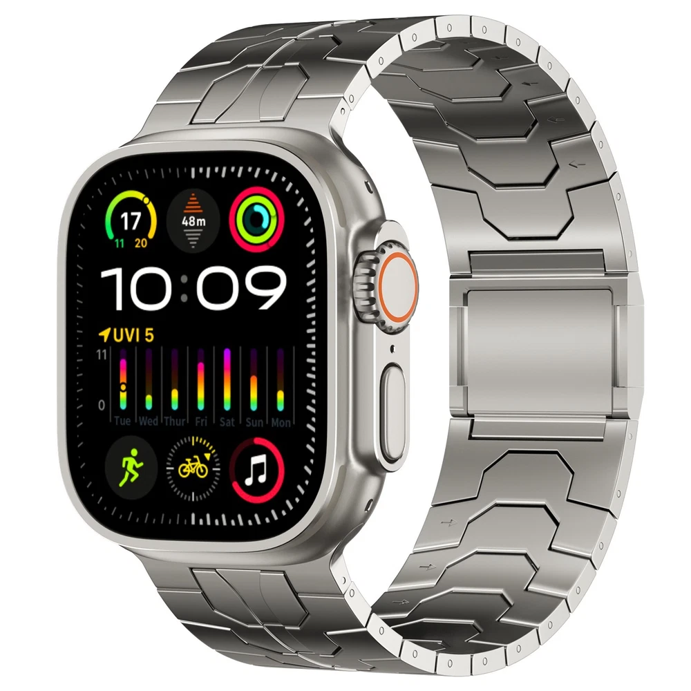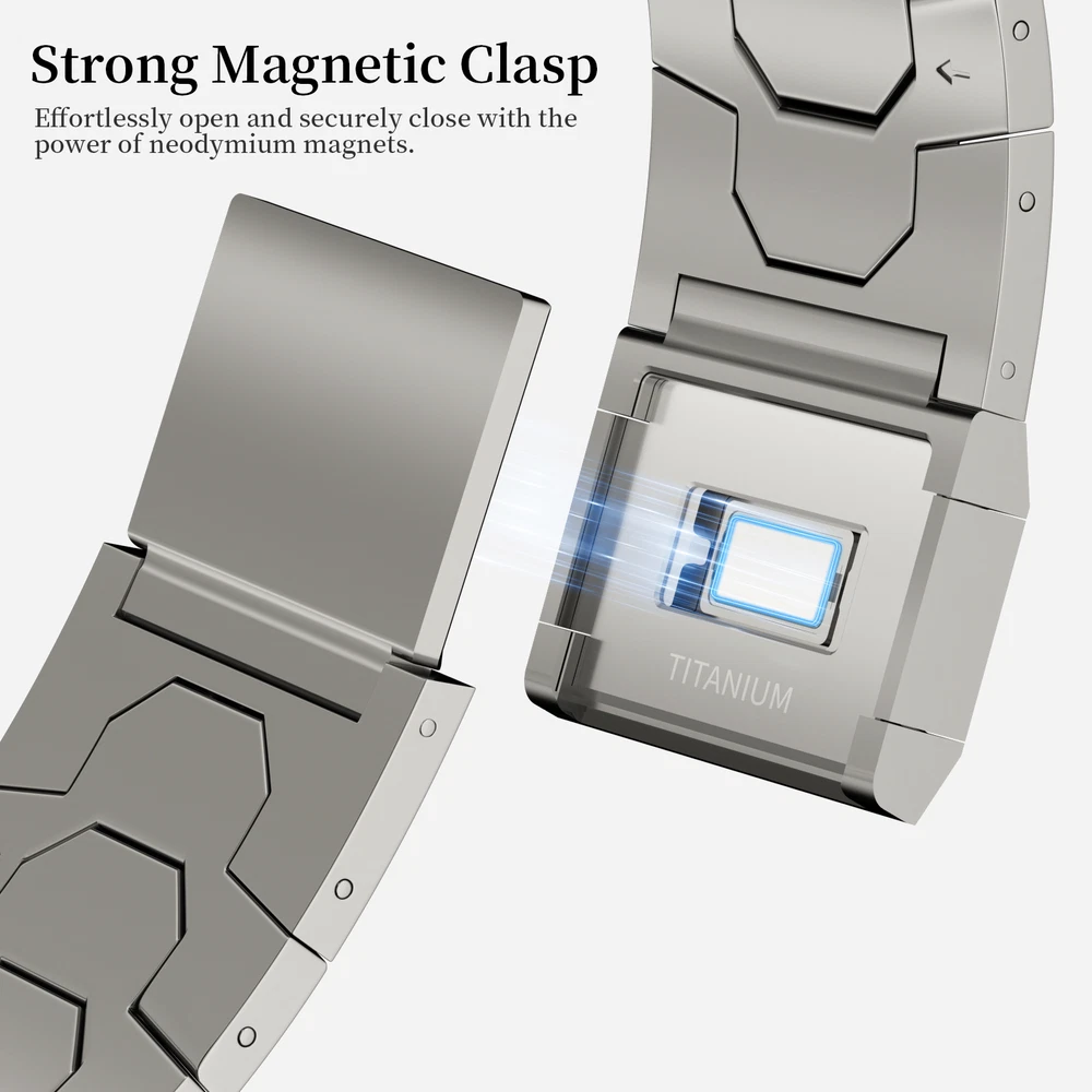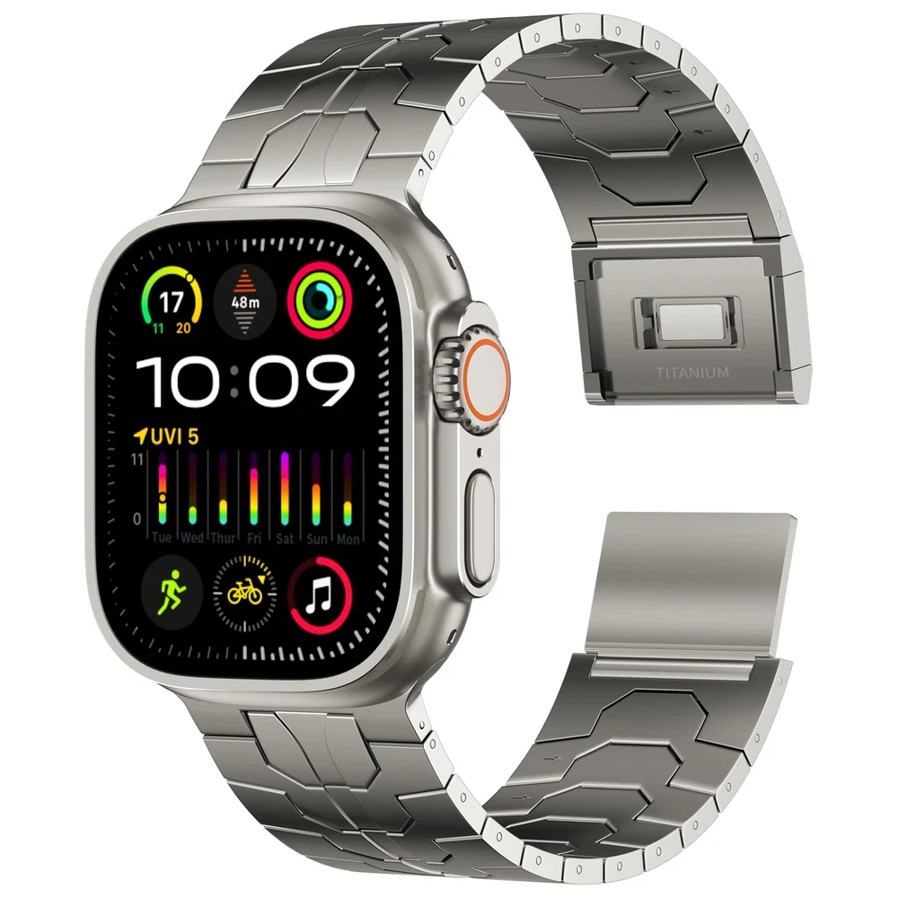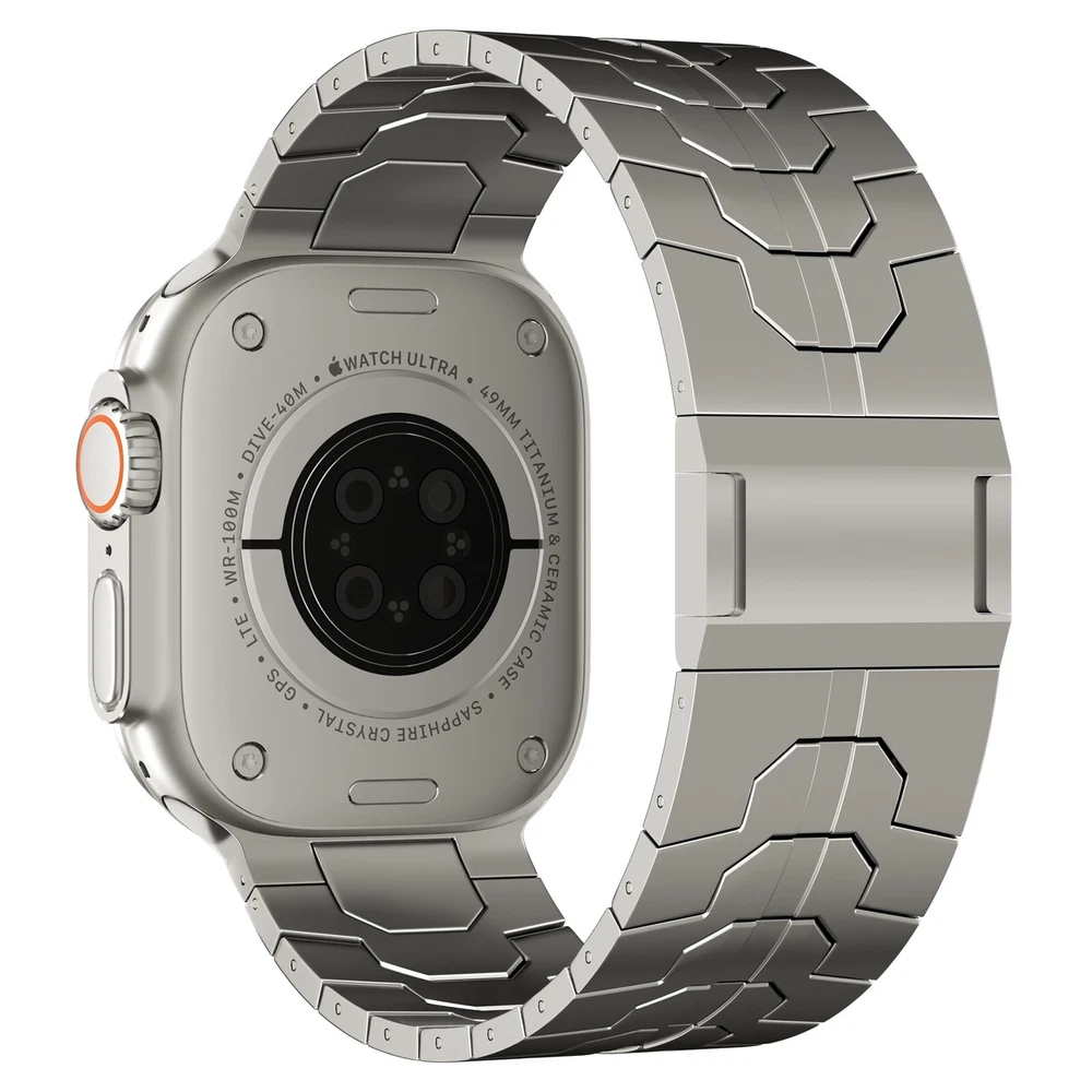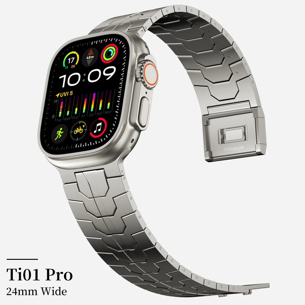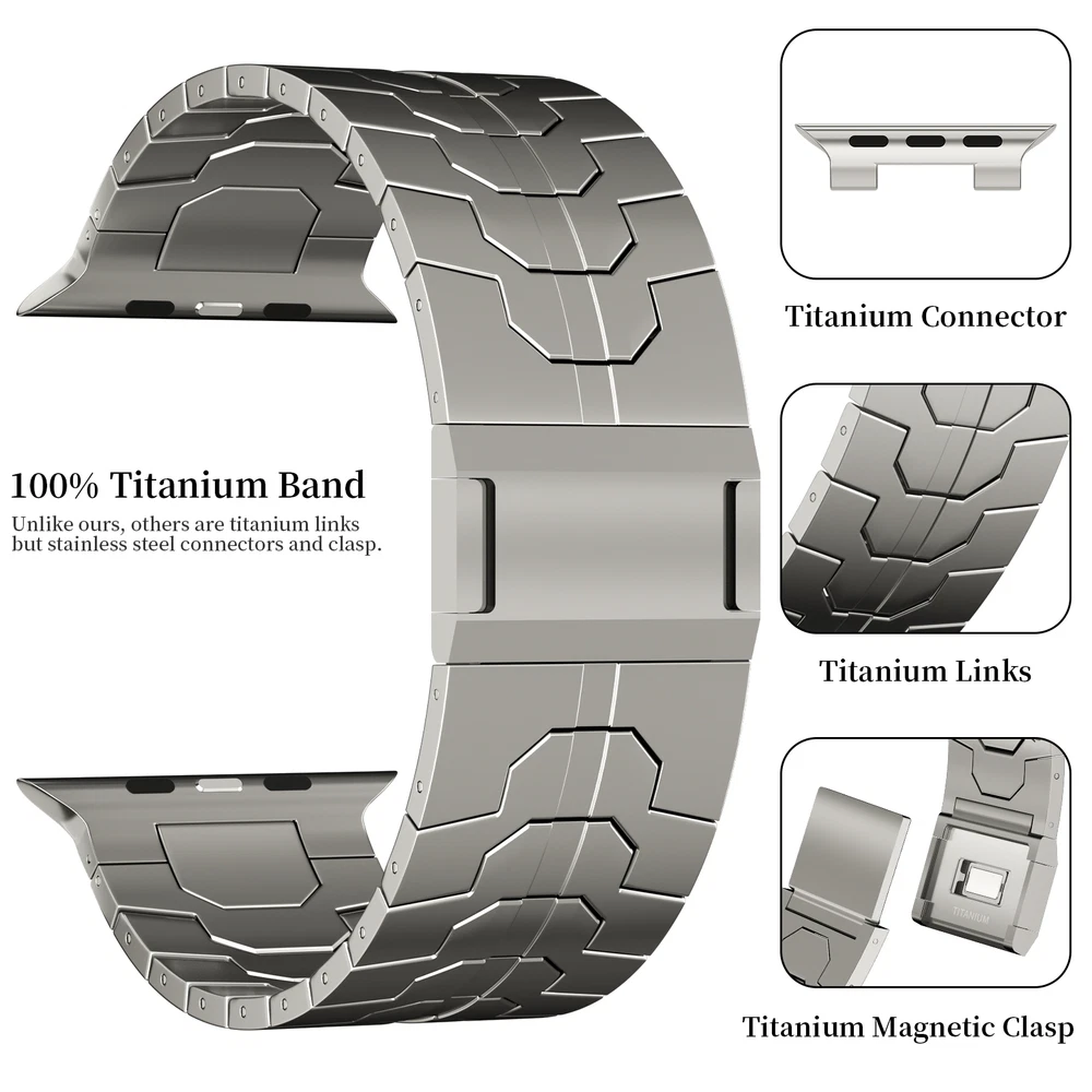 Specification Color Titanium Special Features Full titanium;DLC Coating Compatibility For Apple Watch Ultra 49mm / Series 10 46mm / Series 9 8 7 45mm / Series 6 5 4 SE2 SE 44mm Clasp Titanium Magnetic Clasp Connector Titanium Connector Titanium Grade Titanium Grade 2 Herring 800+HV Band Width 24mm Band Weight 57g(max) Band Thickness 2.8mm Band Length 210mm Clasp Thickness 5.5mm Wrist Size 150mm to 234mm Feature Lightweight;Corrosion-Resistant;Anti-Allergy Included Components Titanium watch band Warn tips: If you have specific requirements on packaging and components such as minor adjustment links、removal tool、tool pins and instruction, please contact online customer service. Product Description Full Titanium Band VS Titanium Band: All components include links, magnetic clasp, and connectors are crafted from titanium material, setting our bands apart from others with clasps and connectors made of non-titanium material 24MM Wider Design: The wider watch band best fits the Ultra. Design for any bold soul. Compatible with Apple Watch Ultra 49mm / Ultra 2 49mm / Series 10 46mm / Series 9 8 7 45mm / Series 6 SE 5 4 44mm. Fit wrist size 6.7" to 9.2"(170 to 234mm). We provide a minor adjustment link to adjust the band to fit for your wrist accurately Lightweight and Corrosion-Resistant: 57g(max). Experience the extraordinary benefits of full titanium - our titanium bands are not only lighter but also more corrosion-resistant than non-full titanium alternatives. Dive into the ocean or pool without worry, as our bands are built to withstand various environments Titanium Connectors: CNC high precision craftsmanship and unique titanium connectors ensure a tight and stable connection with your original watch interface. Make sure your watch band stays securely attached, providing a seamless and comfortable fit Titanium Magnetic Buckle & Hook and Loop Closure: Sensitive skin? No problem. Our titanium magnetic buckle is an excellent choice, offering comfort without compromising style. Say goodbye to allergies associated with non-full titanium watch bands. Ensuring your watch band is comfortable to wear all day long. Magnetic buckle & hook and loop closure lock your watch easily and securely DLC (Diamond-Like Carbon): Our aerospace-grade titanium bands are not only a perfect match in material and color for the original watch, but also The DLC (Diamond Like Carbon) coating gives it extra scratch prevention, durability and protection, far higher wear resistance than non DLC