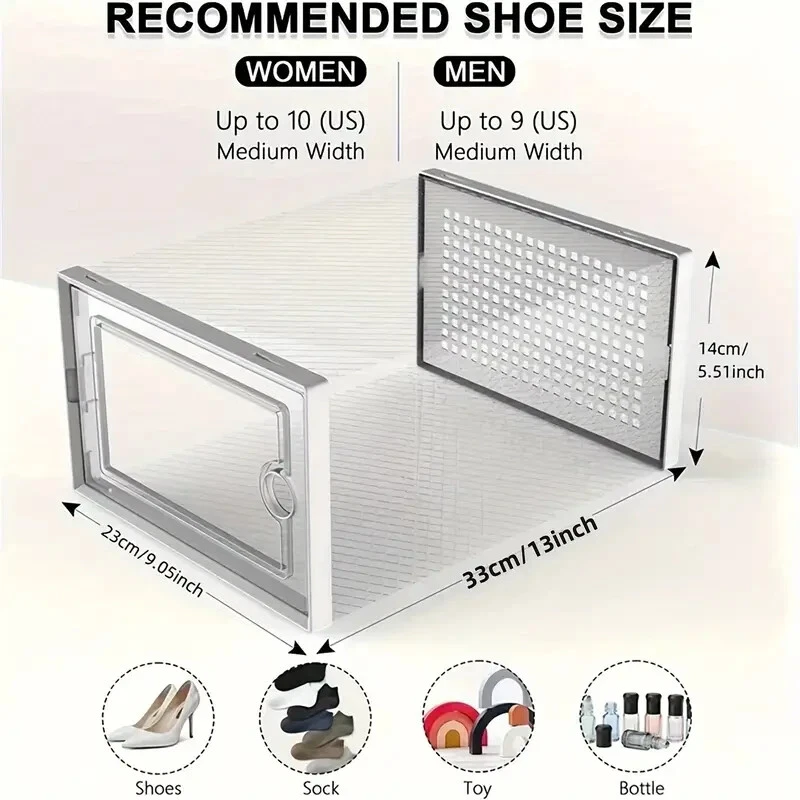 Maximize your shoe storage efficiently with this set of 24 transparent, plastic shoe boxes. Designed to accommodate 21-25 pairs of shoes, these boxes are perfect for keeping your footwear organized and easily accessible. Each unit measures over 24 inches in height and 10 inches in width, offering ample space for a large collection of shoes. The contemporary, modern-style boxes are stackable and foldable, providing a flexible solution for your closet or entryway. The white color ensures a clean and sleek look, while the free-standing design allows for easy placement and mobility. Made in China, these original shoe racks are a practical addition to any home storage needs. ecommended Usage: Multipurpose Shape: Rectangle Material: Plastic Closure Type: Flip Copy Origin: Guangdong,China