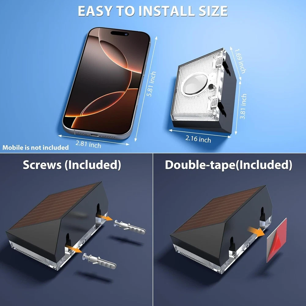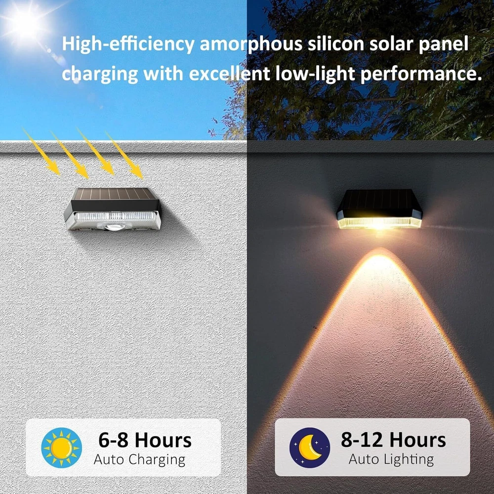 Features: 10 Lighting Modes Solar Fence Lights: Our fence solar lights offer 10 modes, including cool white, warm white, natural light, red, green, blue, purple, grass green, light blue and and a color-changing mode, totaling ten options. Among them: warm white/neutral white/cool white mode. Suitable for daily lighting, illuminate your fence or yard. And the multiple color selection modes add bright colors for holiday decorations or special occasions. 2025 Upgraded Focused & Energy-Saving: These solar outdoor lights with brightness up to 50 lumens, emit a more focused and intense beam and illuminate a wider area. The solar panels using high-quality monocrystalline silicon can convert sunlight into electricity 30% more efficiently than most other solar fence lights.These solar wall lights charge even on cloudy days and last 10-12 hours when fully charged. 2 Installation Methods & Easy Setup: Our package comes with an installation kit. The screw installation method makes the solar fence light very firm. The outdoor fence light can be directly installed on the outdoor wall, fence, porch or house number with screws. In addition, we also provide 3m adhesive fixation, which can directly install the fence light on smooth wooden boards, walls, PVC fences, without the need for professional electricians to install, just follow the instructions to save labor costs. Auto ON/OFF & Memory Function: Automatically charges in the sun and lights up at dusk. Remembers your last selected color. Requires direct sunlight for optimal performance .Please avoid shadows when installing solar lights. It guarantees a 5-6 hour charge and can run for an extra long time of 10-12 hours. Waterproof & Widely Used:The solar fence light is designed with IP65 Waterproof rating and made of high-quality ABS material to withstand adverse weather such as rain and snow. The outdoor step light is very bright and medium-sized, suitable for enhancing lightingaround doorways and garages, illuminating house number,fences, deck railings, steps, stairs, paths, yards and gardens, gardens, etc. to provide a warm atmosphere and lighting. Specification: Light body material/color: ABS Lamp shade: PG33 Charging Capacity: 5-6 hours Lighting Time: 10-12 hours Waterproof Class: IP44 Packing include: 2/4 x Solar Wall Light 1/2 x Installing Screws Kit 1/2 x Manual