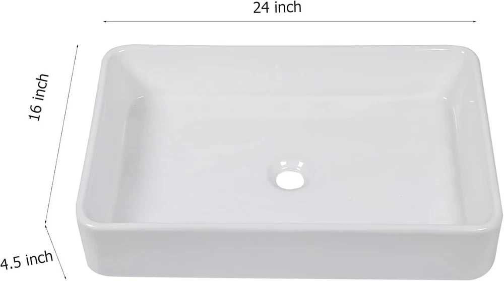 24"x16" Polished Ceramic Vessel Sink - Stylish Addition to Any Bathroom ‹ › ‹ › ‹ › ‹ › ‹ › ‹ › ‹ › ‹ › 24" x 16" Polished Ceramic Vessel Sink The Stylish Addition to Any Bathroom Modern and Stylish This elegant 24-inch rectangular vessel sink elevates your bathroom with its contemporary silhouette. Seamlessly transitioning between form and function, it adds a touch of sophistication while enhancing your overall design aesthetic. Easy-to-Clean Crafted from thick glazed porcelain, this vessel sink resists scratches and stains, significantly lowering water absorption for a long-lasting pristine appearance. Its smooth, polished surface allows for effortless cleaning and maintenance, ensuring it remains as beautiful as the day you installed it. Long-lasting Durability Engineered for resilience, this sink is molded and fired at high temperatures, constructed from clay and minerals. Installation is a breeze; simply place it on your countertop and secure it with caulking. Specification Dimensions: 23.9" W x 15.8" D x 4.6" H Drain opening: Standard 1.75" Perfect for small bathrooms, powder rooms, or bars For a flawless fit, we recommend receiving the sink first before making your cutout. Promise Your satisfaction is our utmost priority. Should you encounter any quality issues, our dedicated team is here to support you every step of the way, ensuring a seamless experience. Why Choose Our Vessel Sink? Embrace effortless luxury with our Polished Ceramic Vessel Sink. This is not just a sink; it’s a statement piece designed for those who appreciate superior craftsmanship and a stylish aesthetic. Let your bathroom reflect your exquisite taste and transform your daily routines into moments of indulgence. Choose wisely, choose elegance, and elevate your home with our Vessel Sink today! Shipping Free & Fast Shipping - We offer free shipping to most of the USA with a normal delivery time of 3-7 days. However, due to the current situation, additional delivery time (up to 3 weeks) may be required for some items. Alternative Carriers - We may use alternative carriers (e.g. USPS, FedEx, UPS, etc.) to ensure your package arrives safely and on time. Due to the use of multiple carriers, we are unable to provide a tracking number automatically. Handling Time - Orders are processed and shipped within 1-2 business days of receiving cleared payment. Shipping Restrictions - Shipping to Alaska, Hawaii, Puerto Rico, Guam, and other US territories may incur shipping charges or delivery restrictions. Please contact us before ordering, or your order can be refunded/cancelled. State Restrictions - There may be restrictions based on your state of purchase. For example, certain items may not be shipped to California due to state regulations. Contact for Tracking Updates - If you require tracking updates or have any concerns about the delivery of your order, please feel free to contact us, and we will be happy to assist you. Return 30-Day Hassle-Free Returns - We want you to be completely satisfied with your purchase. If you are not, you can return the item within 30 days of receiving it for a full refund or exchange. Easy Return Process - To start a return, simply contact us and we will provide you with a prepaid return shipping label and detailed instructions. Restocking Fee - There are no restocking fees for returns. However, the buyer is responsible for return shipping costs if the return is not due to a seller's error. Refund Processing Time - Refunds will be processed within 5 business days of receiving the returned item in its condition. Payment We accept all major credit cards, PayPal, and Apple Pay for your convenience. Your payment information is secure and encrypted to ensure a safe and seamless transaction. Please complete your payment within 3 days of purchase to avoid any delays in shipping. Feedback Your feedback is extremely important to us. We strive to provide the best products and customer service possible. If you are satisfied with your purchase, please take a moment to leave us a positive review. If you have any concerns or issues with your order, please contact us before leaving negative feedback. We are committed to resolving any problems and ensuring your satisfaction. Contact Us If you have any questions or concerns, please feel free to out to our customer support team. You can contact us through the eBay messaging system. We are available Monday to Friday, 9:00 am to 5:00 pm EST, and we will do our best to respond to your inquiry within 24 hours. Buy it now and enjoy a pleasant shopping experience! Unit Quantity: 33 Room: Any Room,Bathroom Mounting: Surface Mounted Material: Ceramic,Porcelain Items Included: Basin Waste Features: Easy-to-clean,Long-lasting durability Type: Vessel Item Width: Bathroom Sink Item Height: Bathroom Sink Item Length: Bathroom Sink Color: White Shape: Rectangular Bowl Shape: Standard Style: Modern Number of Faucet Holes: No Hole Finish: Polished Faucet Hole Spacing: No specified spacing Bowl Depth: Less than 10 cm
