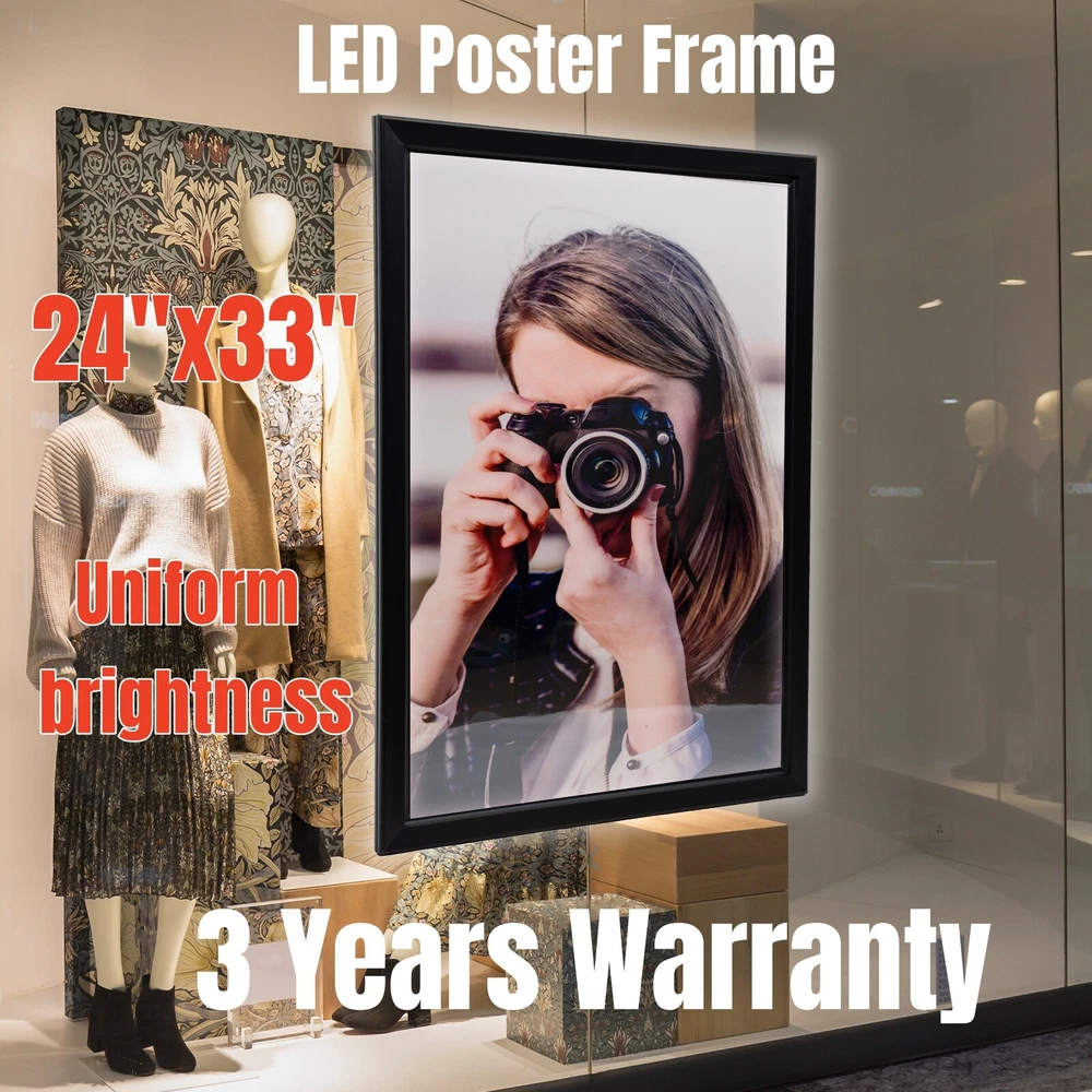 Welcome LED Poster Movie Frame Backlit Light Box Advertising Sign Display Multiple Size 24" x 36" Description: Our photo light box is made of a premium aluminum alloy and acrylic. It’s sturdy and durable. With two sturdy hooks on the back, you can easily hang this product on the wall.LED light source can illuminate your posters and advertisements. This product doesn't need assembly and you can use it directly after plugging it in. The LED light box is suitable for home decoration and commercial areas, such as chain stores, supermarkets, stations, large-scale exhibition projects, etc. Package Included 1* LED Poster Frame Specification Color: Black/Silver Material: Acrylic, Aluminium Alloy Shape: Rectangular Style: Modern Plug Voltage: 110V Power: 20W Power Type: Plug-in Mounting Type: Wall Mount Lumen: 2000lux CRI: >85 Color Temperatur: 9000-10000K Service Time: About 80000h Efficiency: E Plug: American Standard Light Source: LED (Included) Net Weight: 3.5kg/7.7lbs Gross Weight: 4kg/8.8lbs Surface Treatment: Sandblasting Process, Baking Paint Process, Oxidation Process, Cutting Process Product Size: 60.96*3*91.4cm/24*1.2*36inch Package Size: 98*63*4cm/38*24*1inch Key Features Soft Light: This product uses a uniform nano light guide plate and side light guide technology, making the light soft and not harsh to protect your eyes. The LED light has high brightness, fast heat dissipation, which can provide stable performance, extend the service life of the product, and save electricity. Narrow Edge Design: The frame is spliced at 45° and has a width of 1.5 inch, which can maximize the visibility of the visual area (24*36 inches) and play a promotional and display role. Thoughtful Design: The built-in stainless steel shrapnel and the front-opening frame design allow you to gently flip out to open the panel, making it easy to replace the poster Multiple Uses: It can display posters for cinemas, shopping malls, restaurants, etc. to attract customers' attention or be used as a signs board to guide the way for passersby. You can also put it at home for decoration or use it as a display board for art galleries and museums. Details Study Hooks: With two sturdy hooks on the back, you can easily hang this product on the wall. Strong and Durable: The high-quality acrylic panel is dustproof, moisture-proof, and can resist impact and deformation. Meanwhile, the aluminum alloy frame adopts a sandblasting process, baking paint process, and an oxidation process, so it can resist wear, corrosion, rust, and heat. Protective Packaging: The four corners of the product are wrapped with sponges to resist compression and falls, which can prevent product damage in transit. Ready to Use: This product doesn't need assembly and you can use it directly after plugging it in. Application It is suitable for exhibitions, advertisements, signs, and decorations in cinemas, event promotions, retail stores, restaurants, art displays, trade shows, banks, hospitals, libraries, counters, offices, companies, menu boards, jewelry stores, hotels, studios, etc. Installation 1.Place the poster frame on the wall, and mark the location of the nail hole with a pen. 2.Drill 2/4 holes at the marked position and punch nails(not included). 3.Remove the rear protective film and hang the frame on the corresponding nail. 4.Remove the front protective film. Notes 1.The product has protective films on both sides, please tear them off before use. 2.Please allow the slight color difference caused by the shooting light and 1-3cm error due to manual measurement, and make sure you do not mind before ordering. Payment Delivery details Terms of sales About us Contact us Payment We accept ebay payment 。 Fees such as import duties, taxes are not included in the item price or shipping costs. These charges are the buyer's responsibility. Delivery details Shipping: 2-9 working days to: USA Terms of sales We maintain high standards of excellence and strive for hundred percent customer satisfaction. Feedback is very important to us. We hope that you contact us immediately before you give neutral or negative feedback, so that we can address your concerns. It is impossible to address issues if we do not know about them! About us Your satis faction is our ultimate goal. We work hard to earn your trust and future business. Our certified technicians have tested each item before shipping. The unit comes with 1 year limited warranty on all manufacturing defects. a) If you receive a defective item, you may return it or ask for a discount. Please contact us within 14 days after you receive the package. b) What you returned must be intact and in its original packaging as re? u. Customer is responsible for shipping costs of the returned item. c) We will cover the cost of shipping back t with the shipping rate indicated in the registration page. We will send you a new unit or refund the full payment you paid. Thank you. Contact us Business Hour Business Hour: Monday To Friday: 8:30 AM to 5:00 PM (Beijing China time) Due to time zones, our reply to your questions may not be immediately. But within above working time, we will reply your email within 24 hours. If it's non-workdays, please kindly be patient and wait till Monday. Please contact us with ebay message. Please feel free to contact us if you have any questions. Monday To Friday: 8:30 AM to 5:00 PM (Beijing China time) Due to time zones, our reply to your questions may not be immediately. But within above working time, we will reply your email within 24 hours. If it's non-workdays, please kindly be patient and wait till Monday. Please contact us with ebay message. Please feel free to contact us if you have any questions.