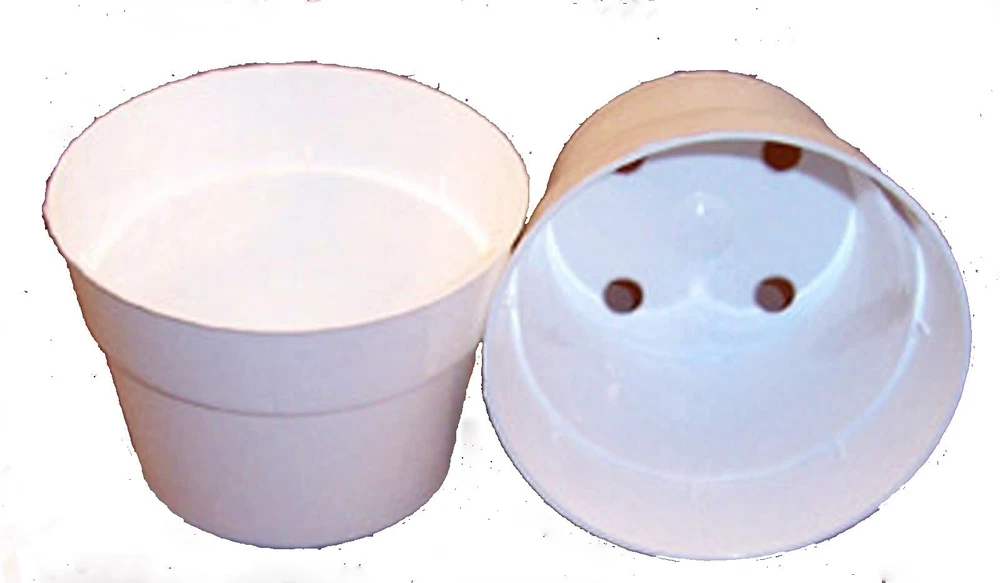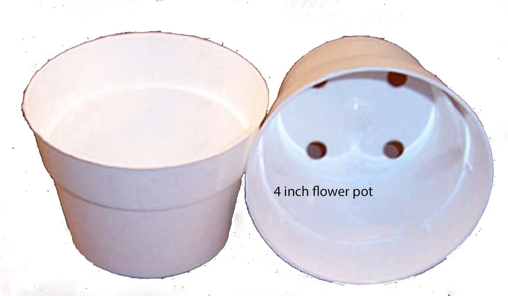 50- 4 inch WHITE PLASTIC FLOWER POTS Sturdy, reusable UV resistant green plastic, made in USA-injected molded. Made for commercial growing trade and hobbyist, perfect for African violets and small plants, suitable for starting leaves and seeds Pots measure approx. 4 inches in diameter, 3 inches tall, 2 3/4 inches base diameter Please review the photo shown. USA shipping only. I do my best to describe and picture an item accurately, so you know what you are bidding on. Please see the images and use them as the final reference to decide for yourself. Please e-mail any questions you have regarding an item prior to buying. Feedback: If there is any problem with the item, please email me before leaving neutral or negative feedback. I have worked very hard to maintain a 100% positive feedback, and most problems can be worked out through communication.