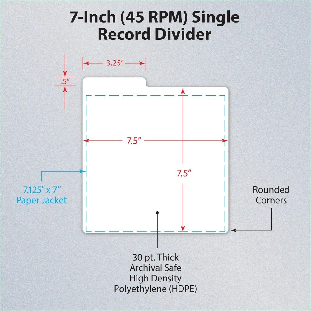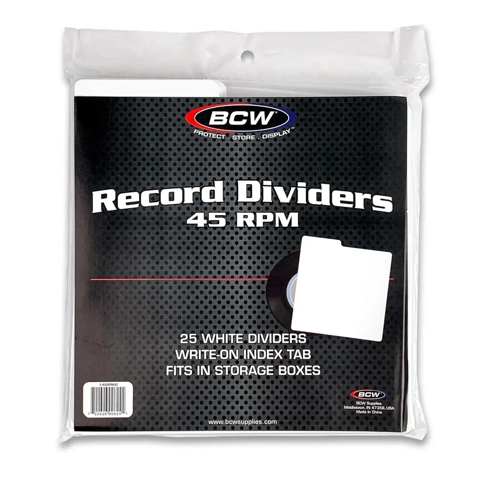 (25) BCW White 45 RPM Record Dividers Fits Storage Boxes with Index Tab Discover the perfect harmony of organization with our BCW 45 RPM Record Dividers in White. These sleek dividers not only separate your vinyl treasures but also provide a canvas for your creativity with their write-on index tabs. Crafted for visibility, they stand tall above your 7" records, ensuring effortless navigation through your collection. Each pack contains 25 dividers, each a testament to the art of keeping your music in tune. KEY FEATURES: Innovative write-on index tabs for personalized organization Designed to stand visibly above 7" records for easy browsing Exterior dimensions of 7 1/2 x 8 inches for compatibility with standard storage solutions Tab size of 3 1/4 x 1/2 inches, offering ample space for labeling Each pack contains 25 dividers, providing comprehensive organization for your vinyl collection. Add Us To Your Favorite Sellers For New Items Daily!