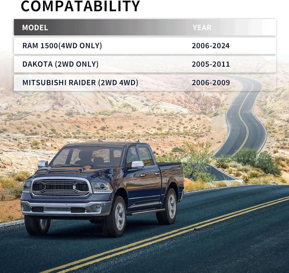 Vehicle Compatibility - Our leveling lift kits fit for 2006-2024 Dodge Ram 1500 4WD (DOES NOT FIT 2WD), Dakota 2WD/4WD 2005-2007&2009-2011, 2006-2009 RAIDER 4WD 2WD (NOT FIT MEGA CAB MODELS). Easy Installation - Installed in 1-2 hours and no special tools needed, raise your truck 2.5" in the front. Due to suspension geometry, the ratio between lift height and kit thickness is not 1:1. An alignment is always recommended after installing. Build Quality - Forged by 6061 T6 Aircraft solid aluminum, which is more heavy duty and durable than casting; with 12.9 grade studs,not easy to break/crack or rustproof,CNC precision machining with professional dimensions and accurate hole position to ensure the best fitting,the anodized surface provides additional resistance to corrosion. Benifits - Increase the distance between the frame and the ground to conquer on and off-Road obstacles and allowing to fit larger custom rims and tires. Make the car look more perfect and cool. Product Warranty - All leveling kit are covered by 2 year warranty. If you have any questions regarding our products and services, please feel free to contact us Note:It will raise the front of your truck by 2.5 inch , Because of suspension geometry,the ratio between lift height and kit thickness is not 1:1. Compatible with 2006-2023 Ram 1500(4WD Only) 2005-2011 Dakota (2WD Only) 2006-2009 Mitsubishi Raider (2WD 4WD) Not fit mega cab models. Specification: Condition: 100% Brand New Item Type: Front Leveling Lift Kit Material: Aluminum Color: Black Package: 2 x Front Leveling Lift Kit