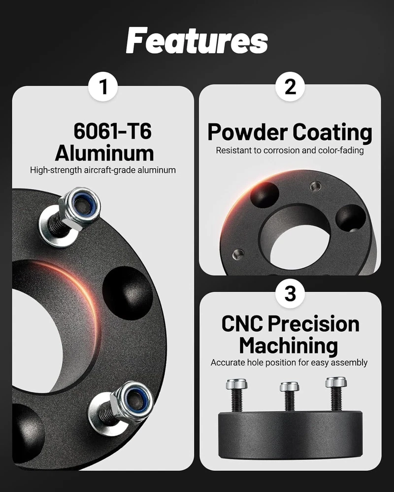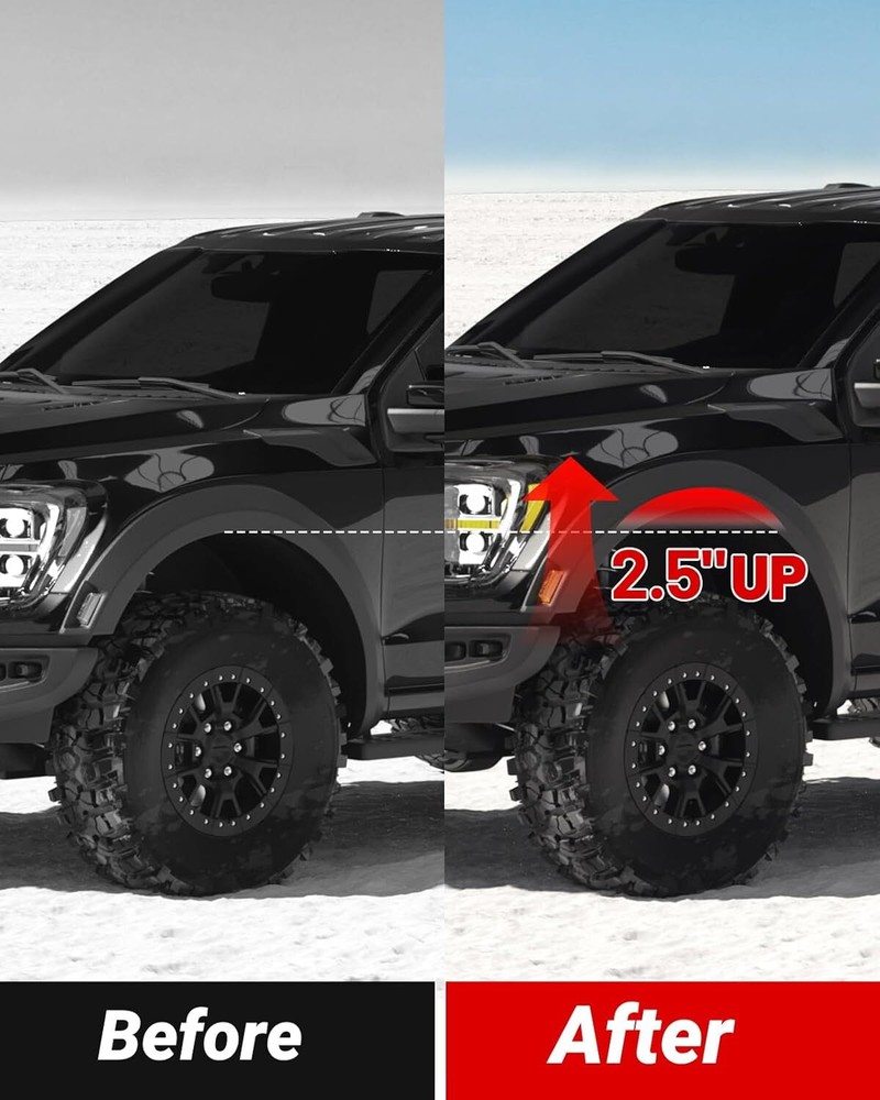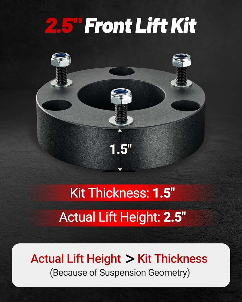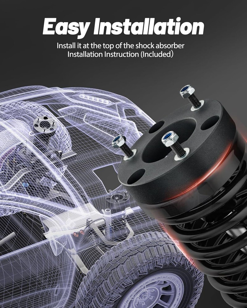 1. Just installed this 2.5" leveling kit on my Silverado and it made a huge difference! The aluminum spacers are solid and well-made, giving my truck a perfectly leveled stance without any issues. Installation was straightforward, and the lift height matches the description—no more nose-diving look. Rides just as smooth as stock, but now with better ground clearance. Great value for the price!