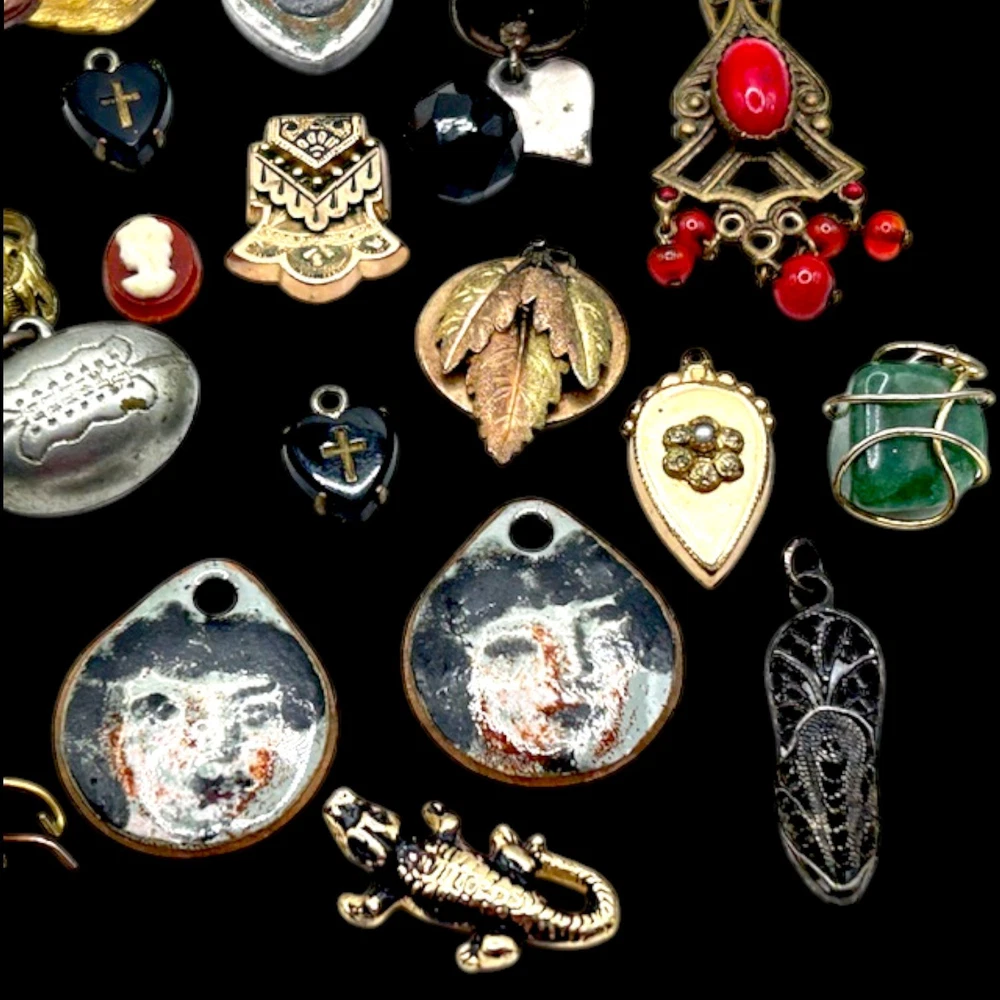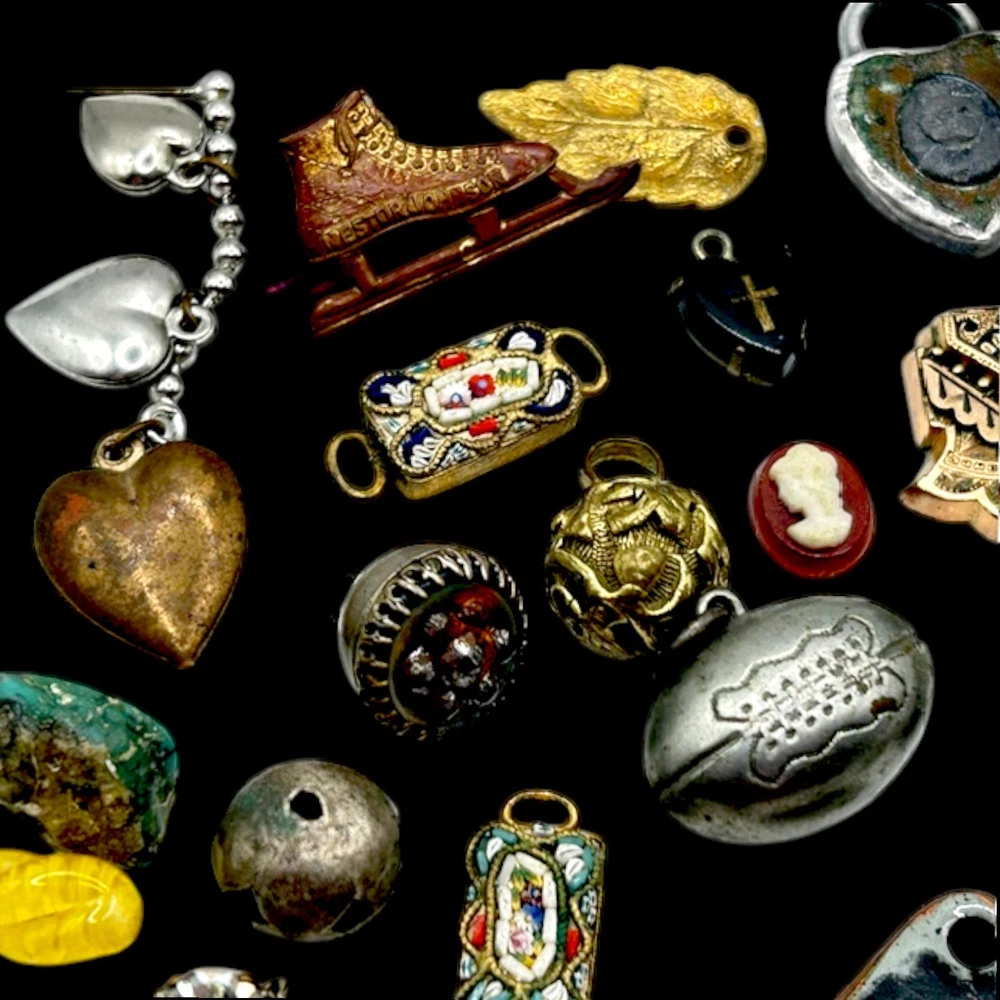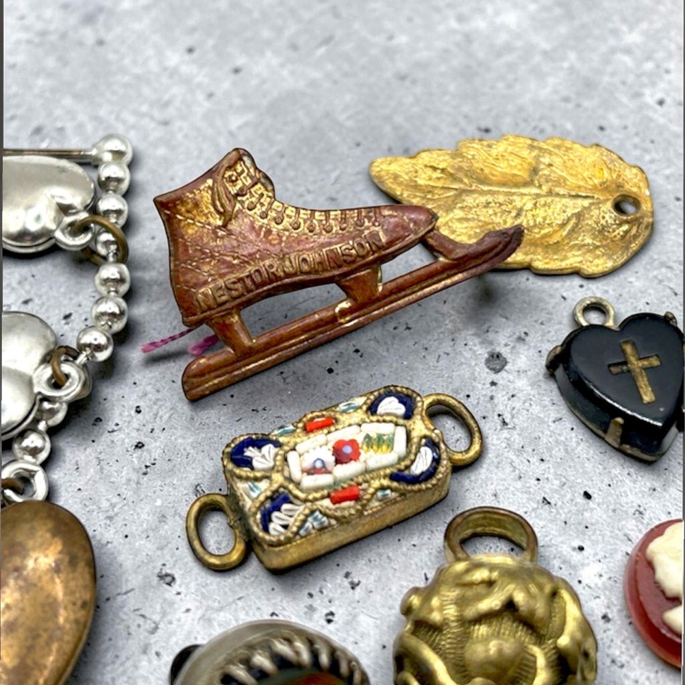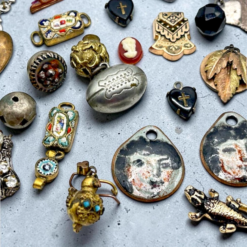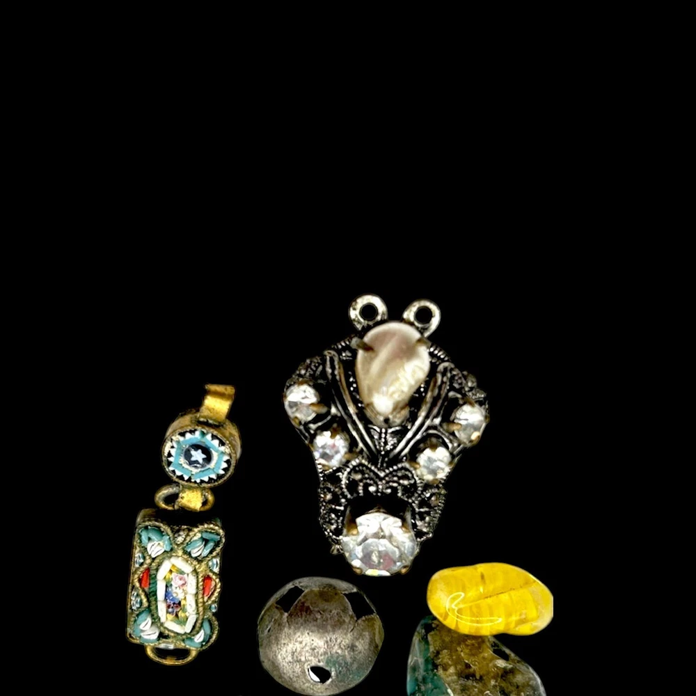 This collection of old charms and tiny misc. old old bits and bobs include over 25 pieces.Perfect for jewelry making and crafts, these tiny charms add a unique and nostalgic touch to any project. Whether you're creating bracelets, necklaces, or earrings, these mosaic charms offer endless possibilities for personalized and handmade accessories. Fun pieces to mention: Jestor Johnson ice skate pin, silver filigree Turkish slipper, tiny pair of jet heart earrings with a cross in the middle, a tiny gold Turkish orb with tiniest turquois beads, nothing has been tested, just a tiny treasure trove of beautifully made miniatures. Esoteric vintage collection of fobs, droplets, and tiny irresistibles compose this fun and whimsical collection so that a most creative person can make new fabulous upcycled pieces to wear and be proud. This one-of-a-kind collection is perfect for anyone who appreciates artistry and craftsmanship, and the courage to buck the trend of ho hum minimalism.