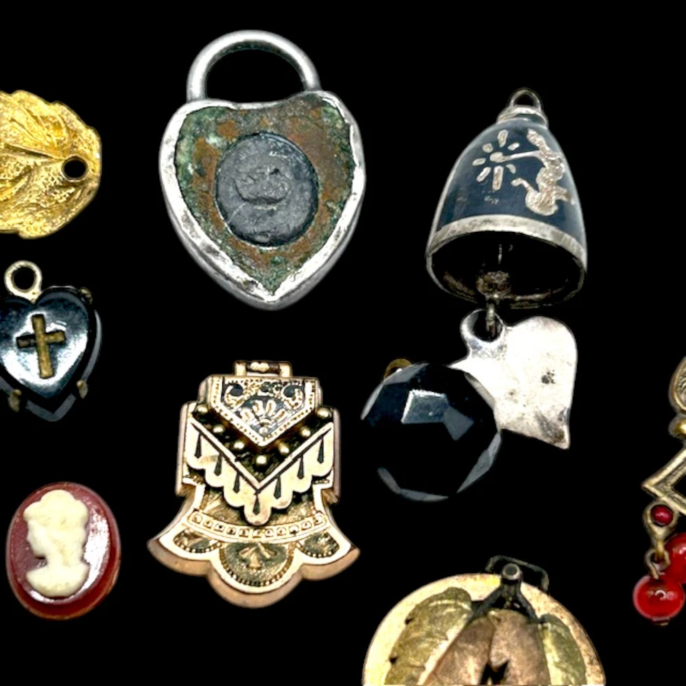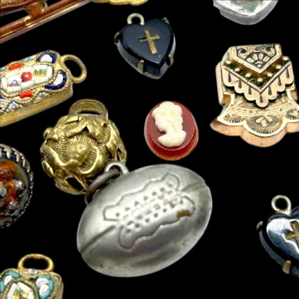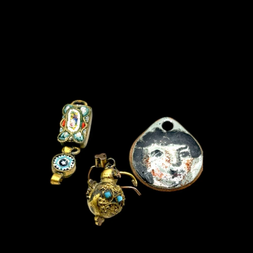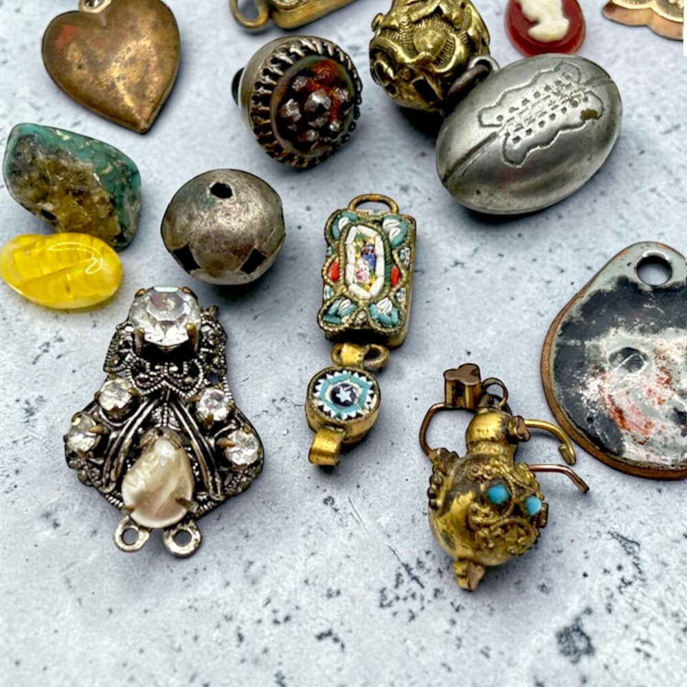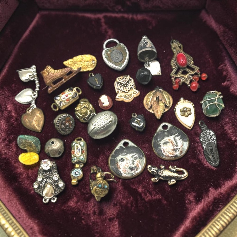 This collection of old charms and tiny misc. old old bits and bobs include over 25 pieces.Perfect for jewelry making and crafts, these tiny charms add a unique and nostalgic touch to any project. Whether you're creating bracelets, necklaces, or earrings, these mosaic charms offer endless possibilities for personalized and handmade accessories. Fun pieces to mention: Jestor Johnson ice skate pin, silver filigree Turkish slipper, tiny pair of jet heart earrings with a cross in the middle, a tiny gold Turkish orb with tiniest turquois beads, nothing has been tested, just a tiny treasure trove of beautifully made miniatures. Esoteric vintage collection of fobs, droplets, and tiny irresistibles compose this fun and whimsical collection so that a most creative person can make new fabulous upcycled pieces to wear and be proud. This one-of-a-kind collection is perfect for anyone who appreciates artistry and craftsmanship, and the courage to buck the trend of ho hum minimalism.