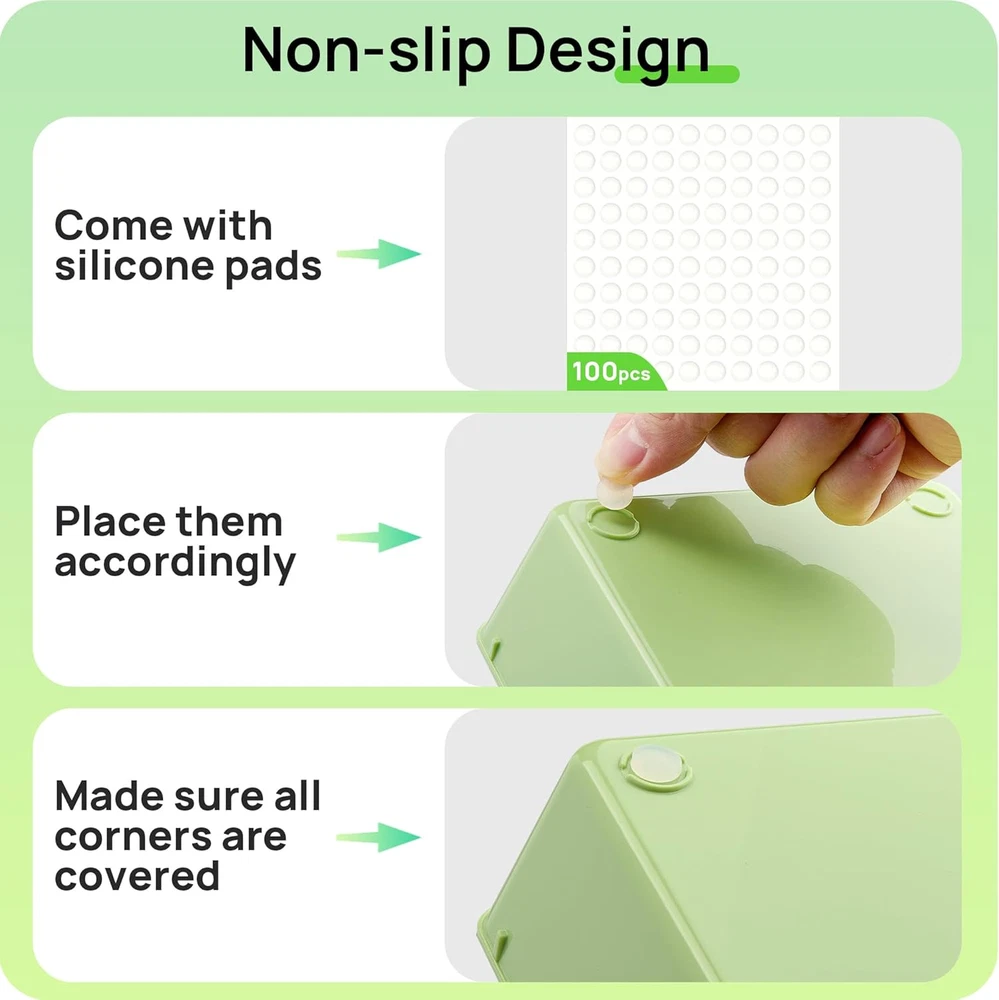 【Make Everything Organized】These clear versatile drawer dividers trays are perfect for any place in your home. Fit all kinds of drawers, such as vanity / bathroom / kitchen / office drawers/ craft room, ideal for organizing cosmetics, makeup tools, hair accessories, jewelry, pins, office supply, craft supplies, utensils, etc. 【Combination of 4 Different Sizes】One set includes 25pcs storage bins in 4 different sizes, which help you customize combinations to store items and organize drawer in shelf/ closet/ cabinet/ dresser . Includes: 9 x 6 x 2 inches (3pcs), 9 x 3x 2 inches(6pcs), 6 x 3 x 2 inches(8pcs), 3 x 3 x 2 inches(8cps). 【Non-Slip and Durable】Extra 200pcs silicone pads are included, just stick them on the bottom of the plastic trays for non-slip. Made of durable and clear plastic, so you can see what’s in it without digging around or making a mess, help you get a neat lifestyle. 【Stackable Storage】The drawer bins can be stacked into one other when you not use them, that will save much space and organize well. You will find it's so easy to keep things neat and tidy. 【Easy to Clean】Our desk drawer storage bins are easy to be wiped clean with a damp cloth and perfect for keeping everything in its place. Convenient for use in your daily life, make everything look beautiful and better organized. Product Description Vtopmart 4 sizes drawer organizer trays are perfect for various drawer in kitchen/ bathroom/ bedroom/ vanity and more. 1 Makeup Organizers 2 Bathroom Organizer 3 Desk Organizer 4 Utensil Organizers Details of Drawer Bins Stackable Storage Round Corner Design Non-slip Silicon Pads Increase Friction Bottom Size Info