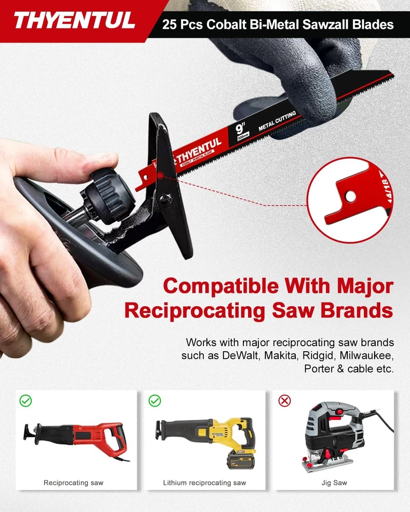 THYENTUL 25-Pack of 9-inch 14/18TPI Reciprocating Saw Blades for Metal Cutting; packaged in a box of 25 with UV new technology coating, convenient plastic box for easy access. 【Product Specifications】 25-Pack of 9-inch 14/18TPI Reciprocating Saw Blades for Metal Cutting;Blade thickness 0.037 in, packaged in a box of 25 with UV new technology coating, convenient plastic box for easy access. 【Premium Materials】 Tailored for real-world scenarios, the 25-piece reciprocating saw blades feature M42 metal with 8% cobalt for the teeth and D6A metal for the blade body. This robust combination not only delivers outstanding performance but also offers a higher cost-effectiveness,A good replacement for Diablo and Milwaukee saw blades 【Versatile Applications】 Ideal for cutting medium-thick metal sheets ranging from 0.1 to 0.125 inches (3 millimeters), these reciprocating saw blades are suitable for cutting steel, pipes, vehicle bodies, stainless steel, cast iron,stud,nails, and water pipes,A must-have tool for various cutting needs. 【Extending Service Life】 Incorporating a new heat treatment process significantly enhances wear resistance and heat resistance, minimizing the likelihood of sudden breakage during usage,This improvement contributes to extending the lifespan of the blade. 【Universal Shank】 The 1/2-inch shank is compatible with mainstream Sawzall tools on the market, including Dewalt, Bosch, Milwaukee, Makita, Black & Decker, Ryobi, and more.