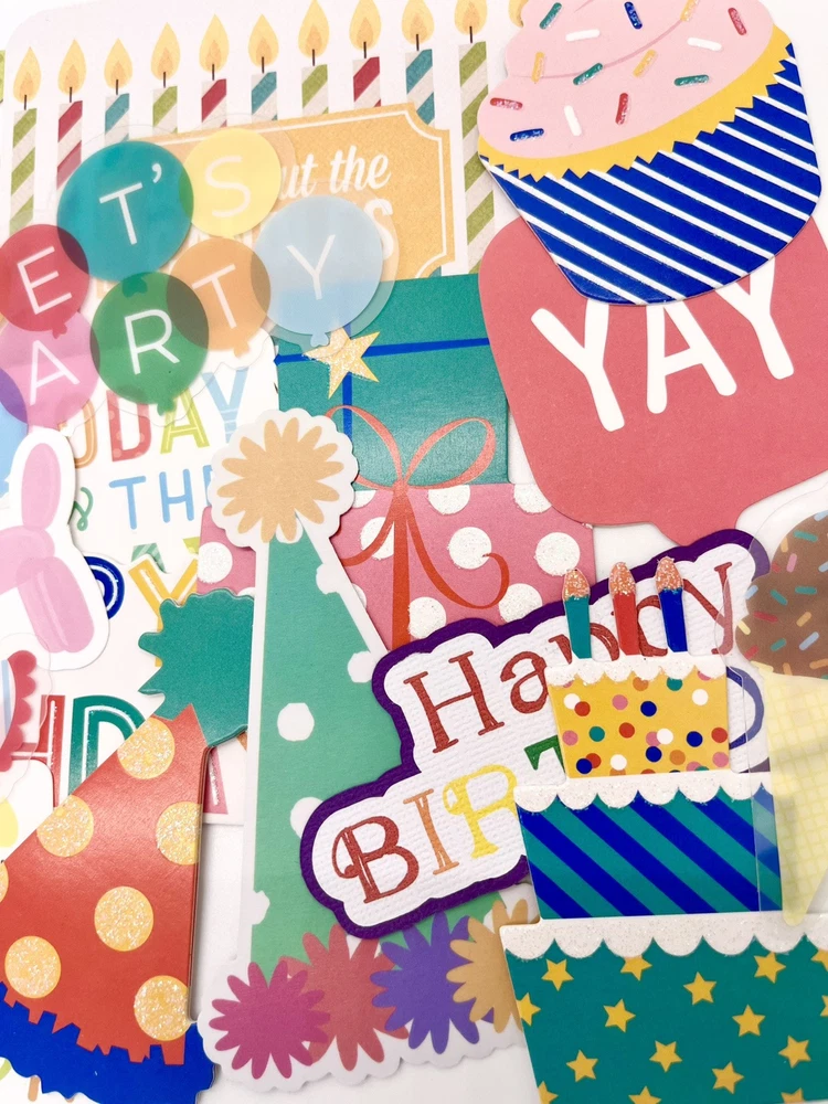 A 25 piece mix of paper supplies. Great for card making and scrapbooking. Included in the lots are things like journal cards, chipboard, tags, stickers and more! Thank you!