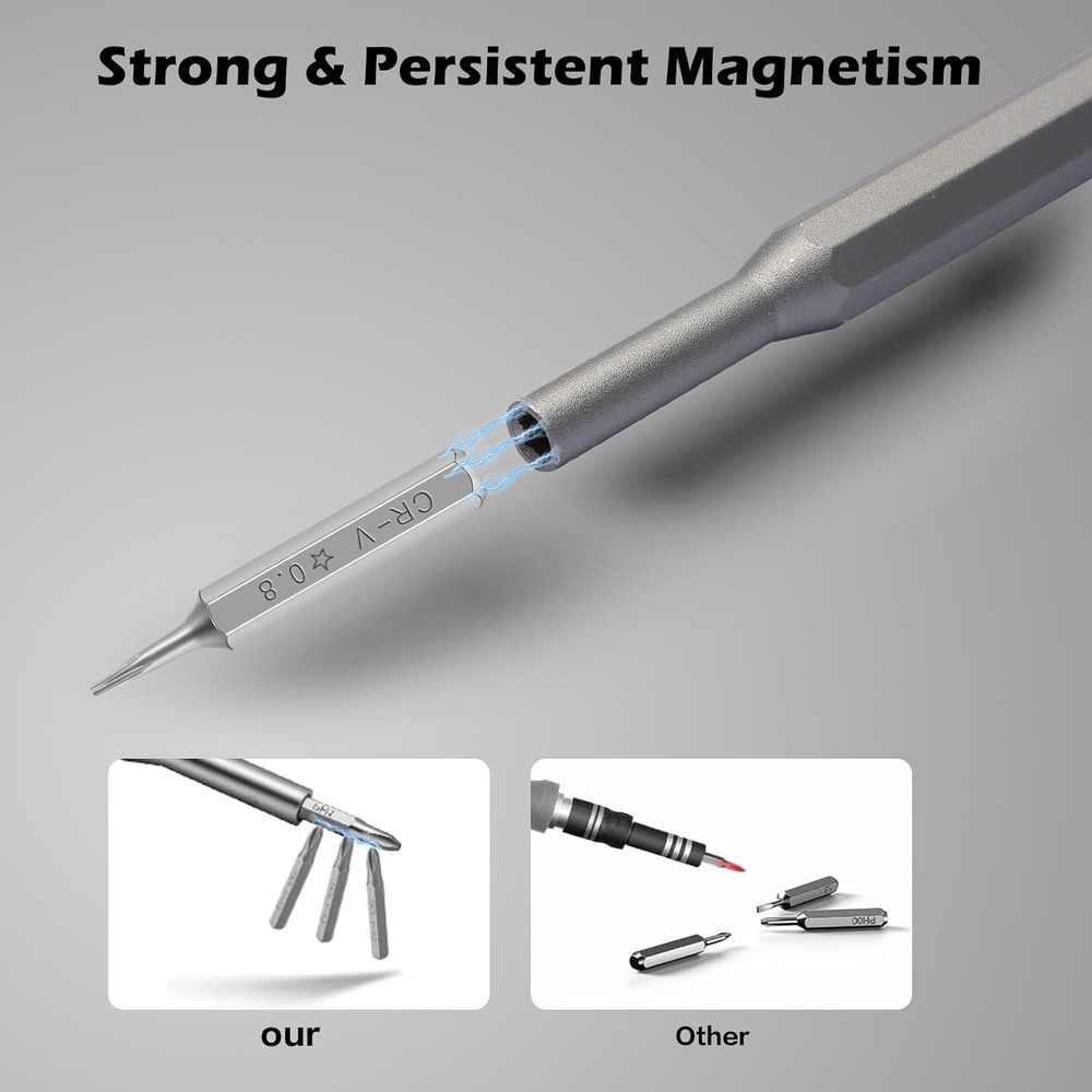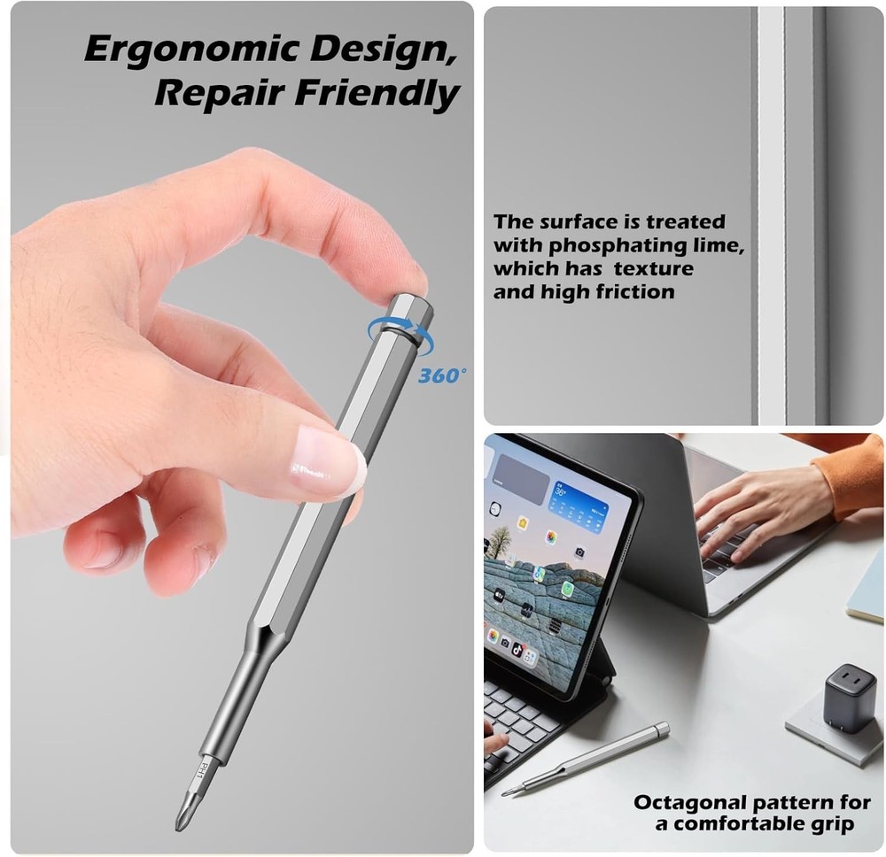 25 in 1 Mini Precision Screwdriver Set, Dlnope Professional Gray/Silver Description Features: Tired of frustrating stripped screws and flimsy tools? Dlnope Professional Screwdriver Set solves the 3 most common problems:Rounded screw heads from low-quality bits; Hand fatigue from awkward handles; Missing bits when you need them most [Specialized screwdriver bits] As a professional metal processing factory, our bits are manufactured from No. 45 steel, which is also known as bearing steel, and are supplemented with the CR-V processing technology. Through testing, it has been found that its hardness is 45% higher than that of ordinary screwdriver bits, and its toughness is increased by 38%. It perfectly balances hardness and toughness, without slipping of the thread or breaking. At the same time, it has excellent oxidation resistance and corrosion resistance, and can easily adapt to various environments. [Clear Markings and Magnetic Design] Each screwdriver bit and the base are clearly marked with the model number, which can help you quickly find the bit you need and greatly improve the usage efficiency. The base adopts a magnetic design, ensuring that the bits will not be dislocated due to shaking during the carrying process. [Ergonomic Aluminum Alloy Handle] To enhance operational precision and grip comfort, the handle of the Dlnope screwdriver is made of aluminum alloy. It features a magnetic design and the surface is treated with phosphate gray technology, providing a delicate frosted texture. Through ergonomic testing, it is equipped with a 360° rotating cap, which can significantly reduce hand fatigue and support precise force application from multiple angles. [Strong Adaptability] Our Dlnope screwdriver set features a rich combination of bits, equipped with mainstream specifications such as Phillips, Flat, Torx, Tri-Point, Pentalobe, Hex, etc. Whether you use it for the assembly and disassembly of electronic devices like computer accessories, Mac products, game consoles, hard drives, drivers, radios, or for repairing watches, glasses, toys, batteries, doorbells, or for completing your DIY tasks, it is an ideal choice. [Take it away!] The pictures may not fully showcase the charm of this screwdriver set. If you're still pondering over it, you might as well have a personal experience. You will definitely be satisfied, and we assure you of that! Moreover, our professional after-sales service will leave you with no worries at all. Product Details: Brand: dlnope Number of Items: 1 Head Style: Phillips; Flat; Torx; Tri-Point; Pentalobe; Hex Material: Chrome Vanadium Steel, Alloy Steel, Aluminum, Stainless Steel, Plastic, High Carbon Steel, Metal Color: Gray/Silver Recommended Uses For Product: Glasses adjustment, Furniture assembly/disassembly, Model assembly, Handmade modification, Children's toys repair, Mobile phone repair, Watch repair, Electronics Repair, Laptop repair, Precision instrument repair Special Feature: Corrosion Resistant, Non-Slip Grip, Ergonomic, Rotating Cap, Magnetic Tip Item dimensions L x W x H: 6.5 x 3.5 x 0.7 inches Item Weight: 2 Ounces Model Name: Screwdriver Set 001 Head Size: 2 inches Manufacturer: dlnope Item Weight: 2 ounces Product Dimensions: 6.5 x 3.5 x 0.7 inches Country of Origin: China Item model number: 001 Item Package Quantity: 1 Special Features: Corrosion Resistant, Non-Slip Grip, Ergonomic, Rotating Cap, Magnetic Tip Batteries Included?: No Batteries Required?: No Brand: dlnope Number of Items: 1 Head Style: Phillips; Flat; Torx; Tri-Point; Pentalobe; Hex Material: Chrome Vanadium Steel, Alloy Steel, Aluminum, Stainless Steel, Plastic, High Carbon Steel, Metal Color: Gray/Silver Handling We will ship all orders within 3 business day of payment. Delivery We take pride in offering fast and reliable delivery for your orders! We are committed to getting your products to you as quickly as possible. Generally, we would like to inform you that all orders will be delivered to you within 1-3 business days after processing.However, in some cases, delivery times may vary depending on the buyer's location. Especially in remote or rural areas, the expected delivery time may be extended. In such situations, we do our best to ensure that your order reaches you as quickly as possible.If there are any delays, we will be happy to contact you to explain the situation. Our goal is to enhance your satisfaction with our fast delivery times. We work diligently to ensure that your order arrives safely.Trust us and enjoy our speedy delivery! Return Policy All items qualify for returns within 30 days of receipt. Buyer is responsible for return shipping on any item that is not damaged. Feedback We take our reputation seriously, we buy and sell online, so we understand the value of trust. If you are unsatisfied with your order, please contact us and we will work with you to resolve it to your satisfaction.