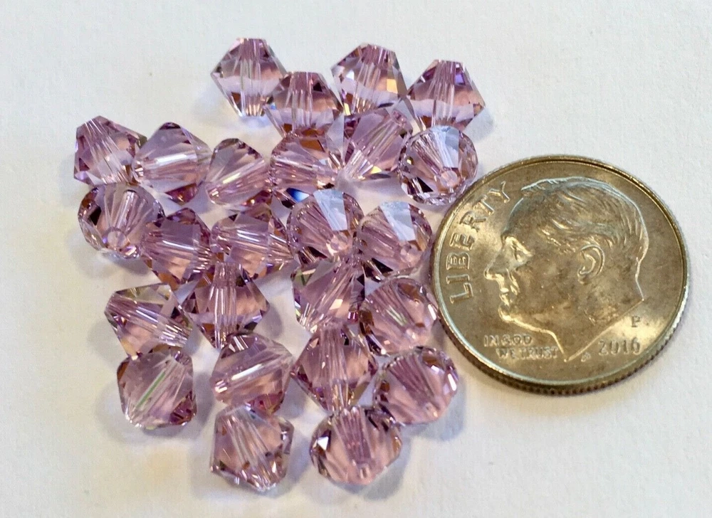 Birthstone color for June. You receive 25 pieces of Genuine Swarovski Crystal 6mm Light Amethyst loose beads. These beautiful, new 5328 style bicone crystals are perfect for birthstone and holiday jewelry. This looks great with the Swarovski Crystal Burgandy pearl . Visit my store for other Swarovski crystal colors, styles, and sizes. I also carry this color in the 4mm and 8mm as well as Swarovski Crystal birthstone mixes in 4mm, 6mm and 8mm. FREE SHIPPING AND HANDLING ON THIS ITEM!!!