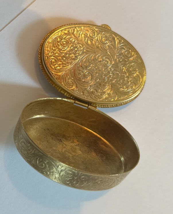 Discover a touch of Victorian elegance with our Cherubs Trinket Box, a delightful addition to any collection. The oval shape and muted pink & brown colors capture the innocence of angelic themes, while the goldtone finish adds a luxurious touch. This hinged trinket box, featuring cherubs pattern, is a harmonious blend of functionality and ornate design, perfect for storing your precious keepsakes. Crafted in the United States during the 1990s, this piece is part of the Angelique collection and stands as a testament to timeless style. Whether for special occasions or everyday use, this small, non-customized trinket box embodies the charm and grace of its angelic subject, making it a unique and cherished gift or keepsake for anyone who appreciates the beauty of vintage aesthetics.
